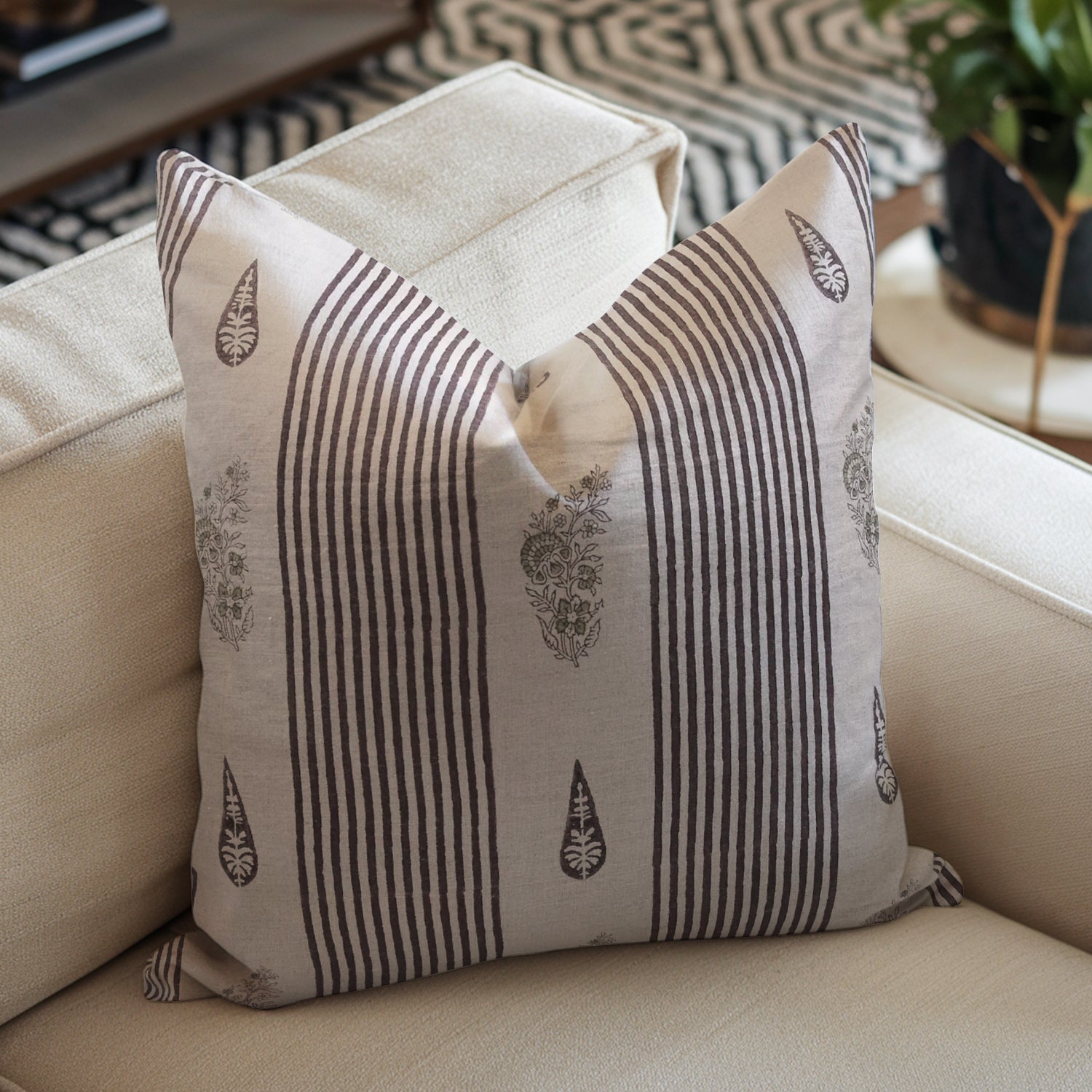 Square/Lumber block print pillow cover- Thick Linen - TULSI BUTI - Fabdivine