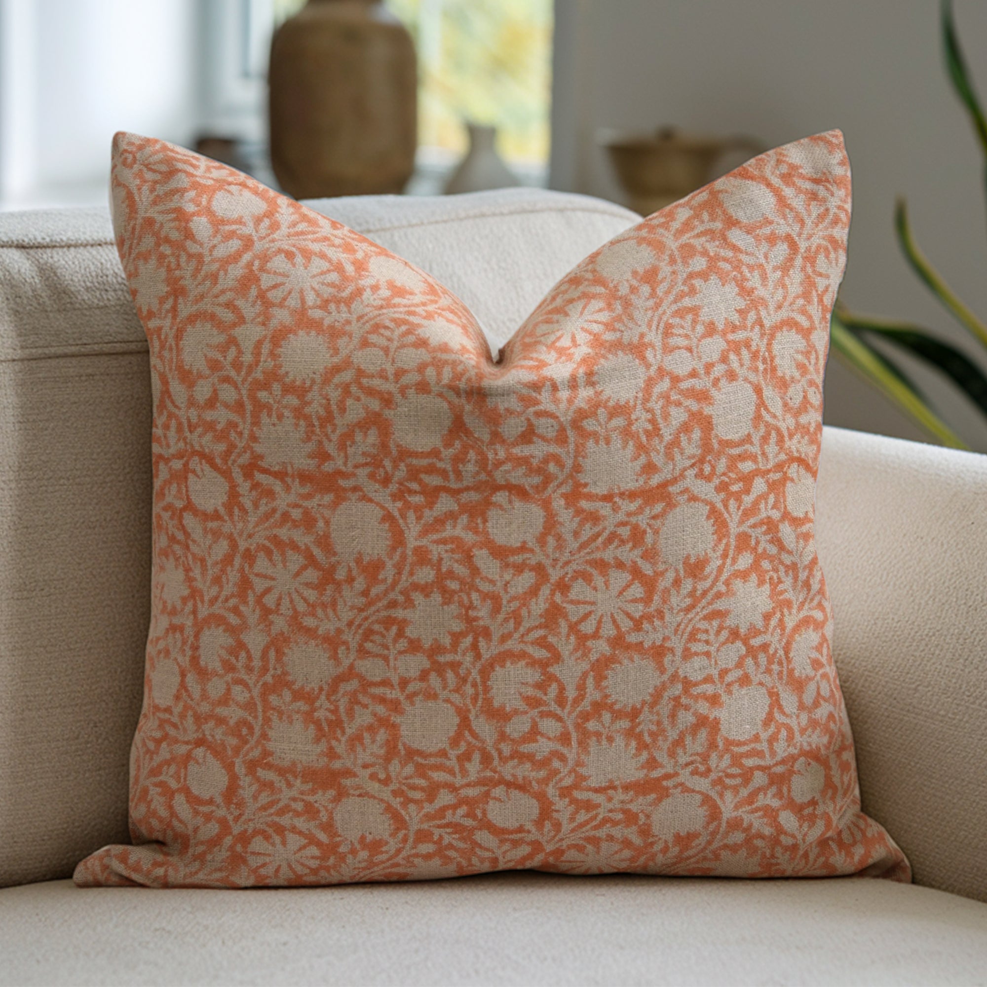 Block print pure linen throw pillow cover- KUM KUM - Fabdivine