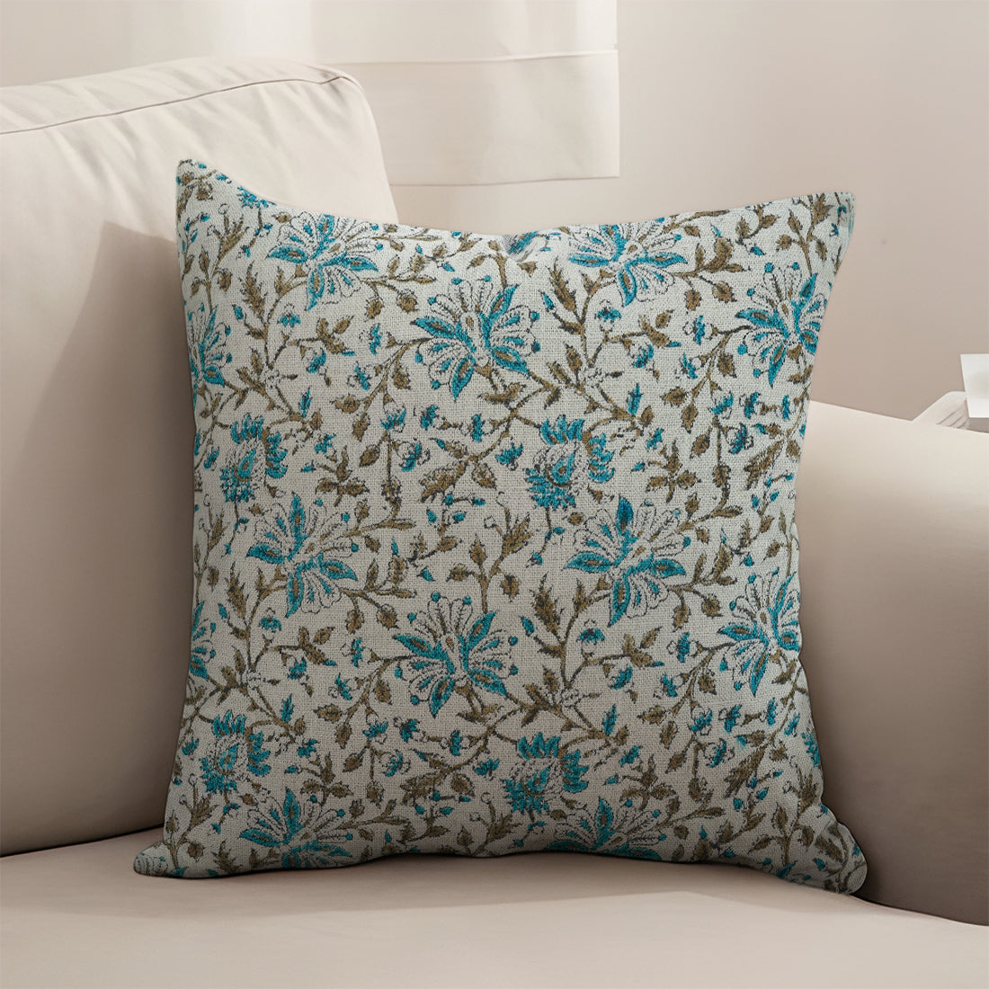 Blue Floral Hand Block Printed Square Pillow Cover – Linen Blend