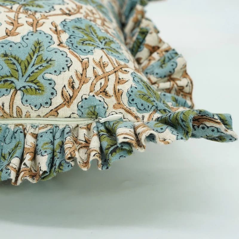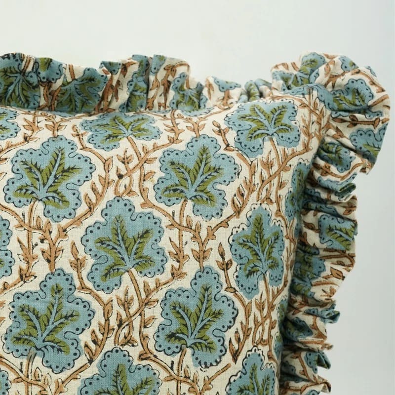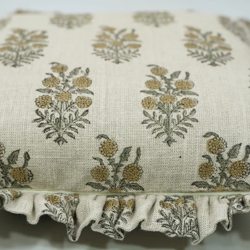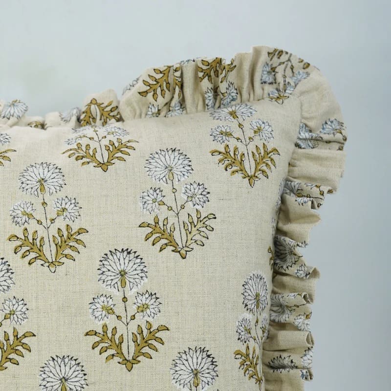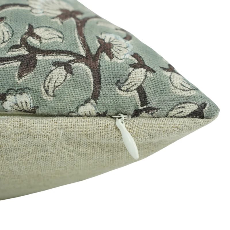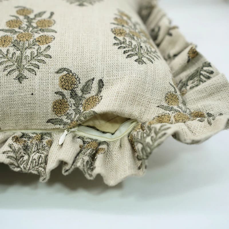 Block Printed Thick Linen Throw Pillow Cover - Bael Patra By Fabdivine