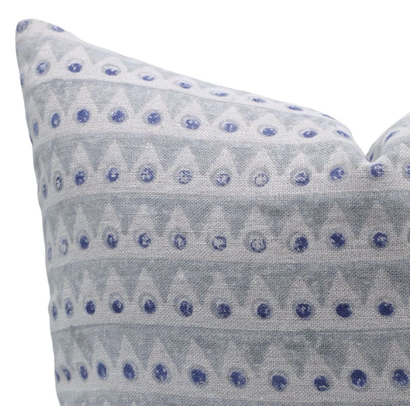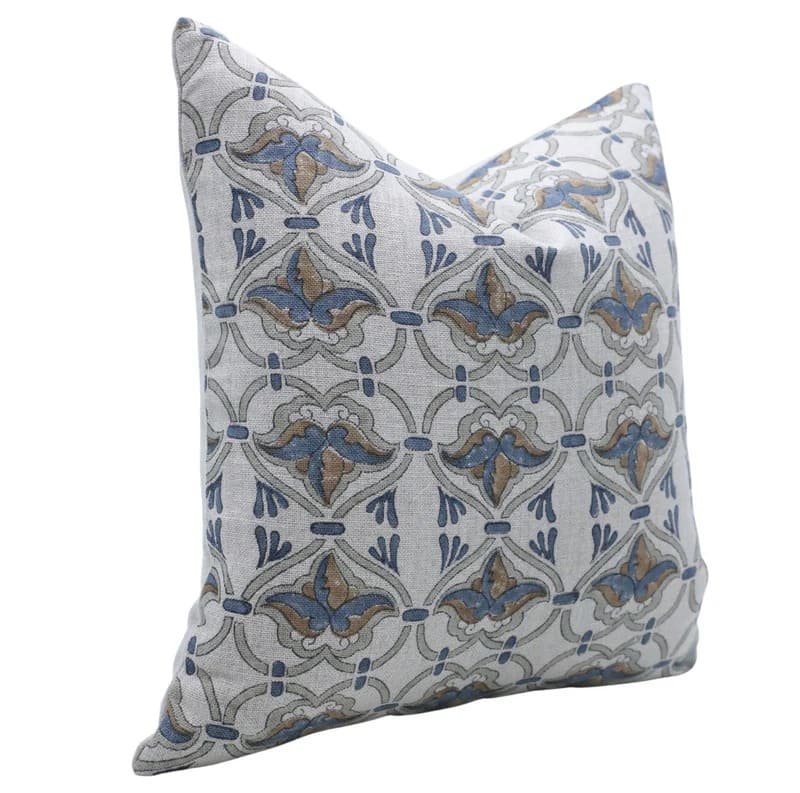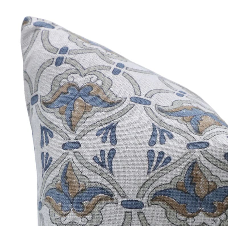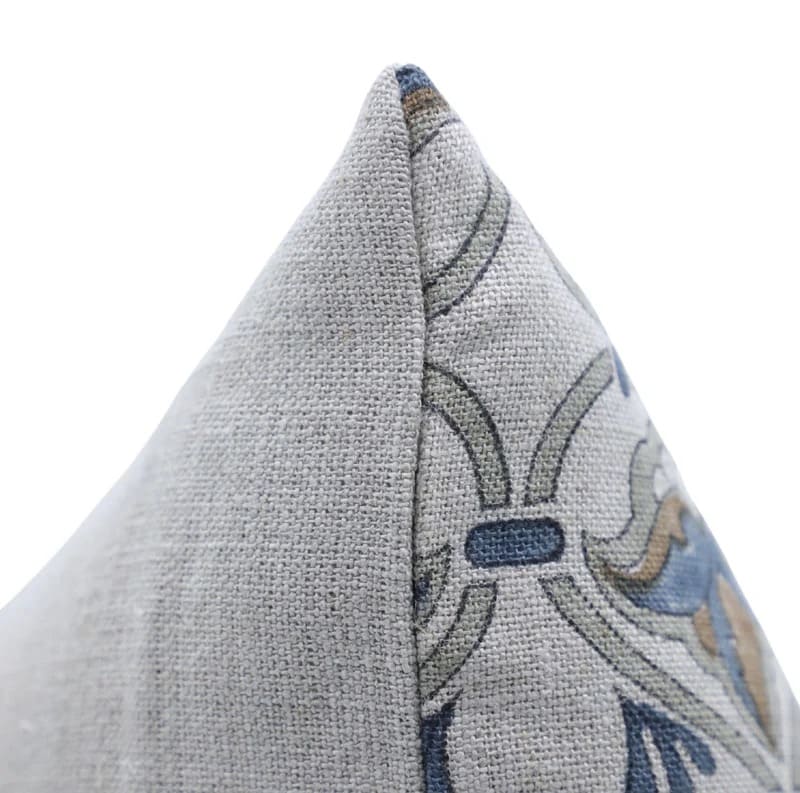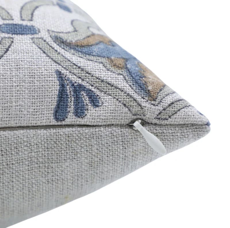 Decorative pillow with blue floral pattern on a white background