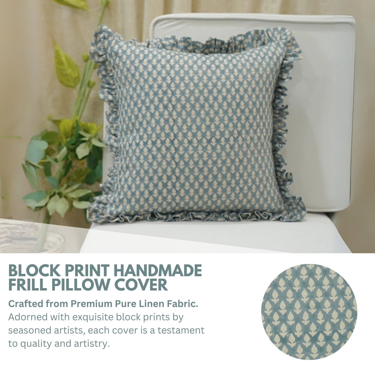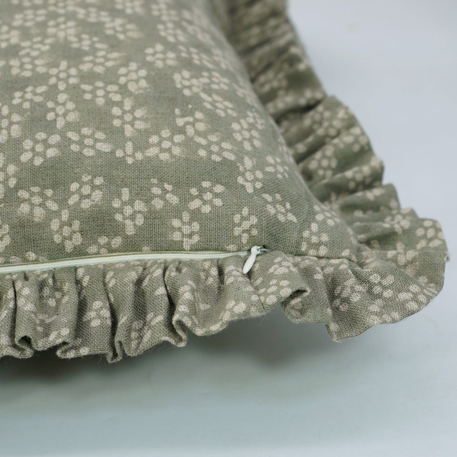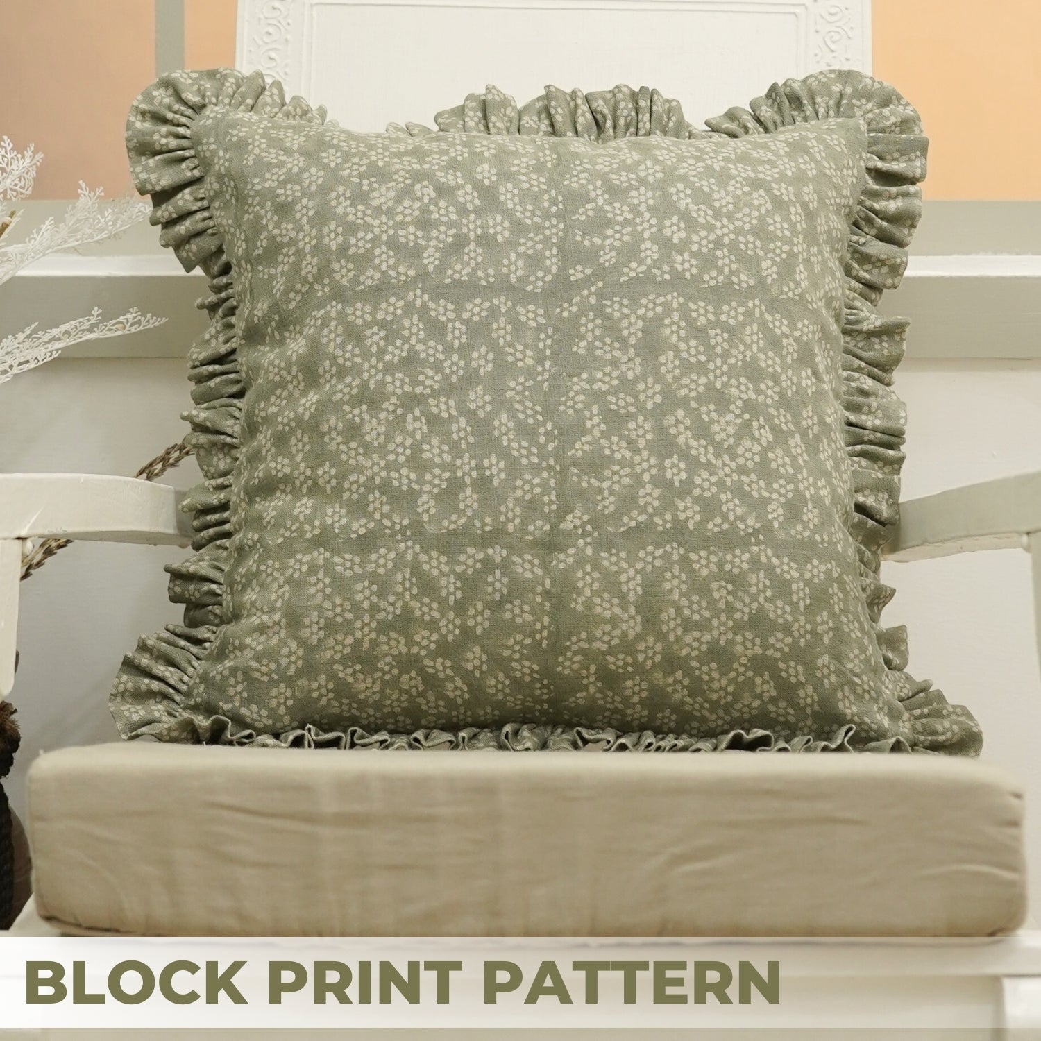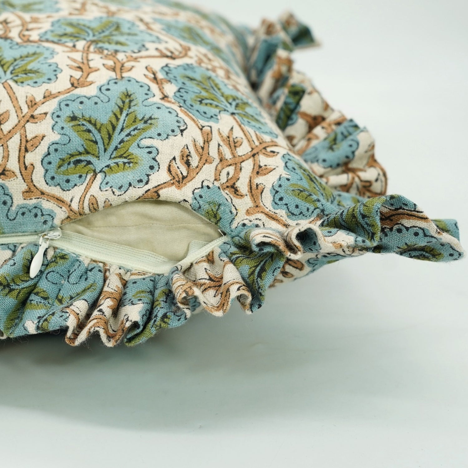Block Printed Thick Linen Frill Pillow Cover - Tulsi Buti By Fabdivine
