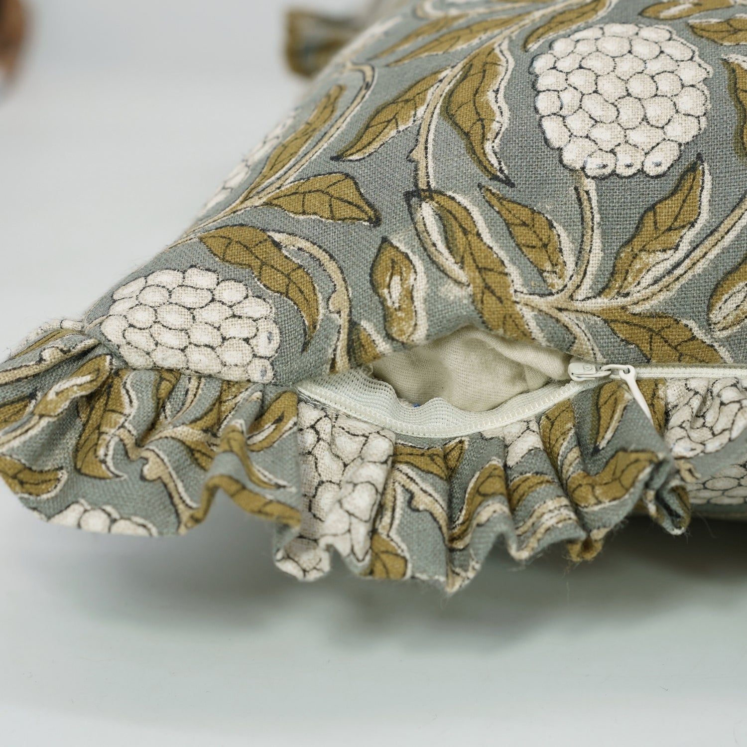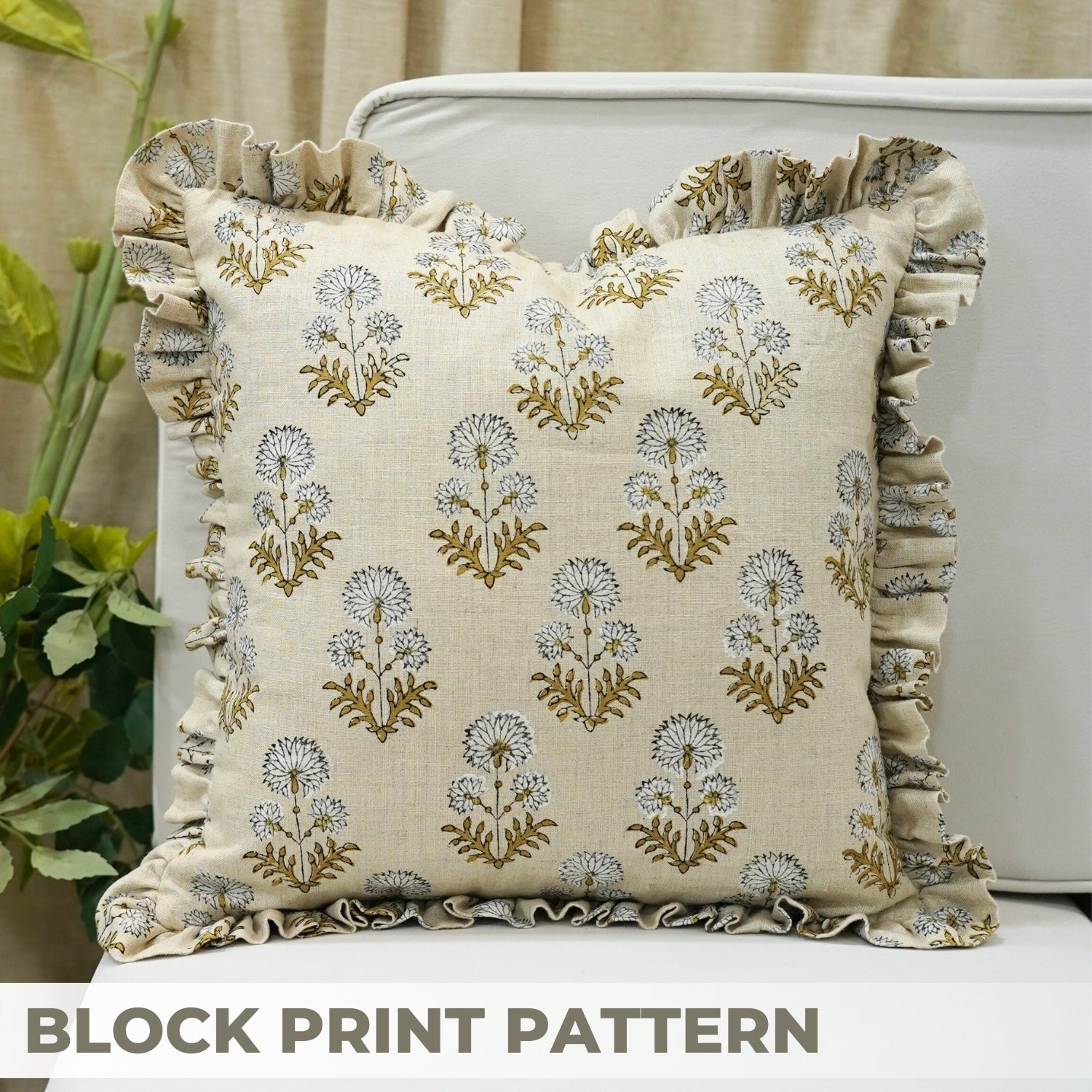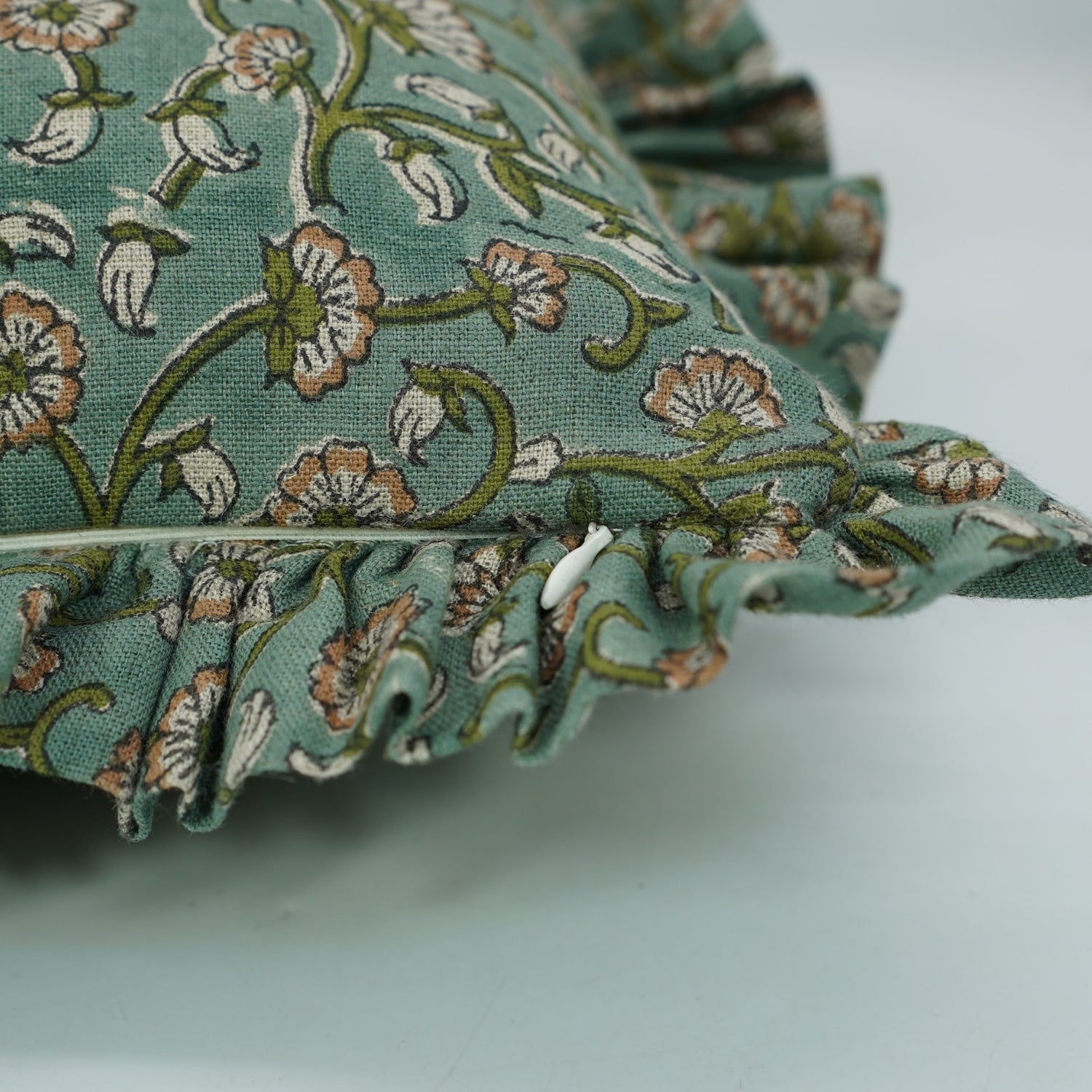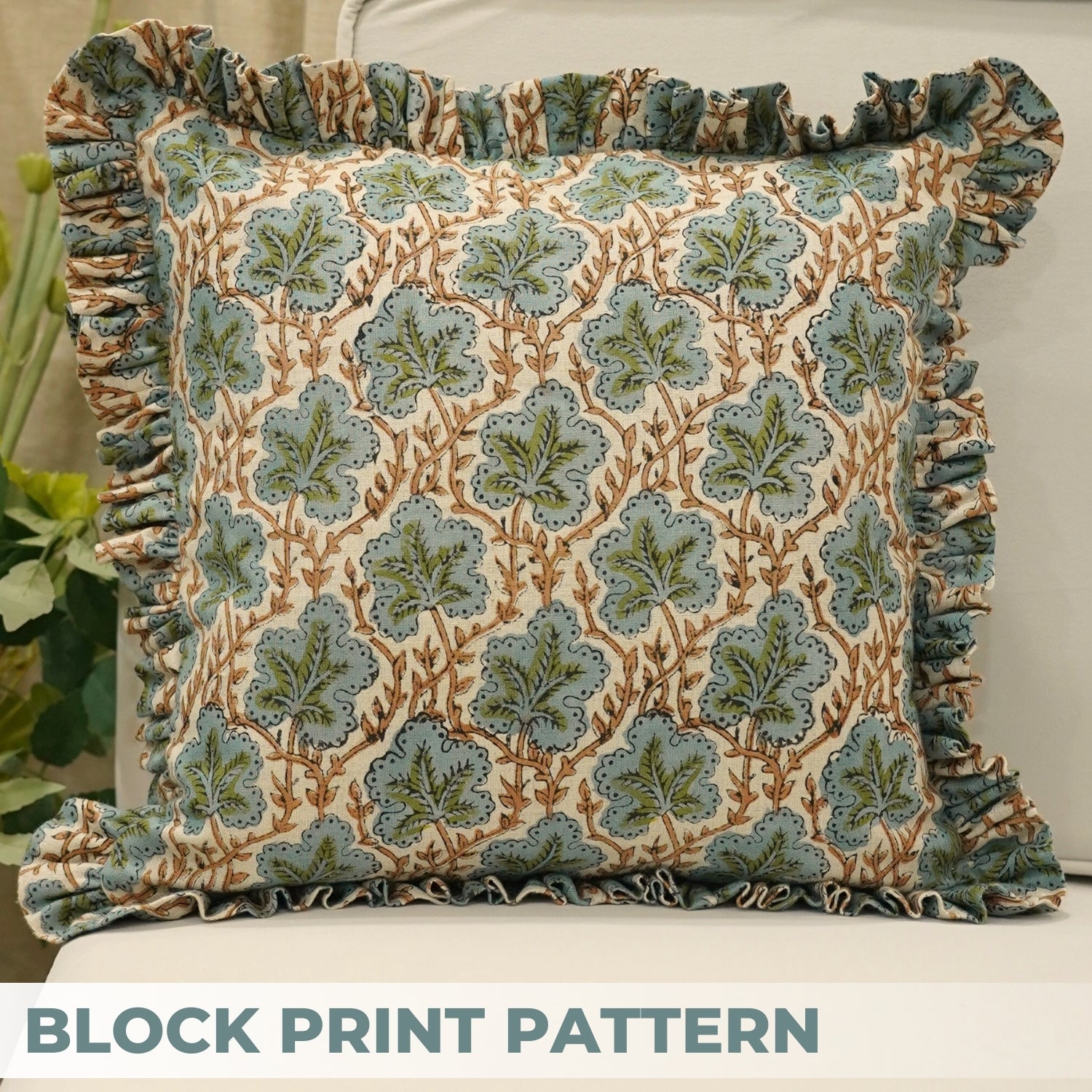 Block Printed Thick Linen Frill Pillow Cover - Tulsi Buti By Fabdivine