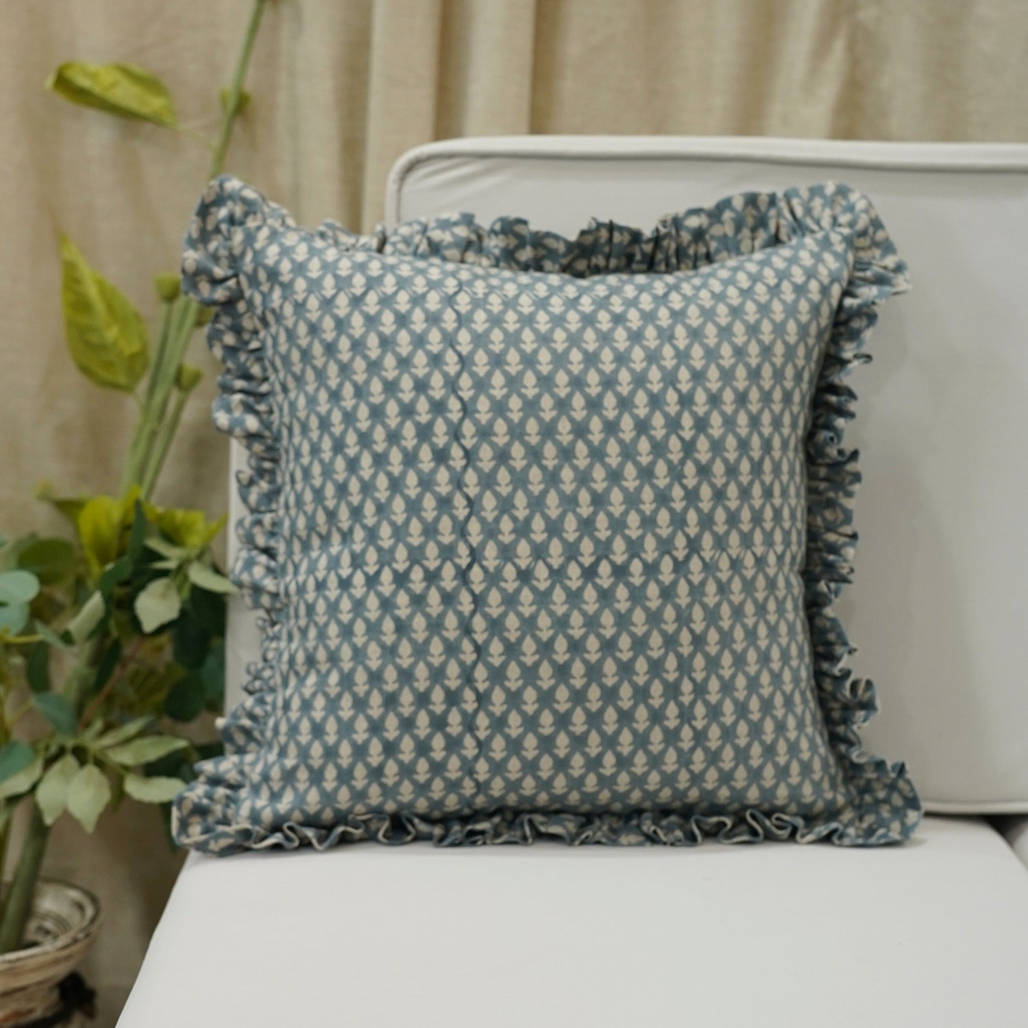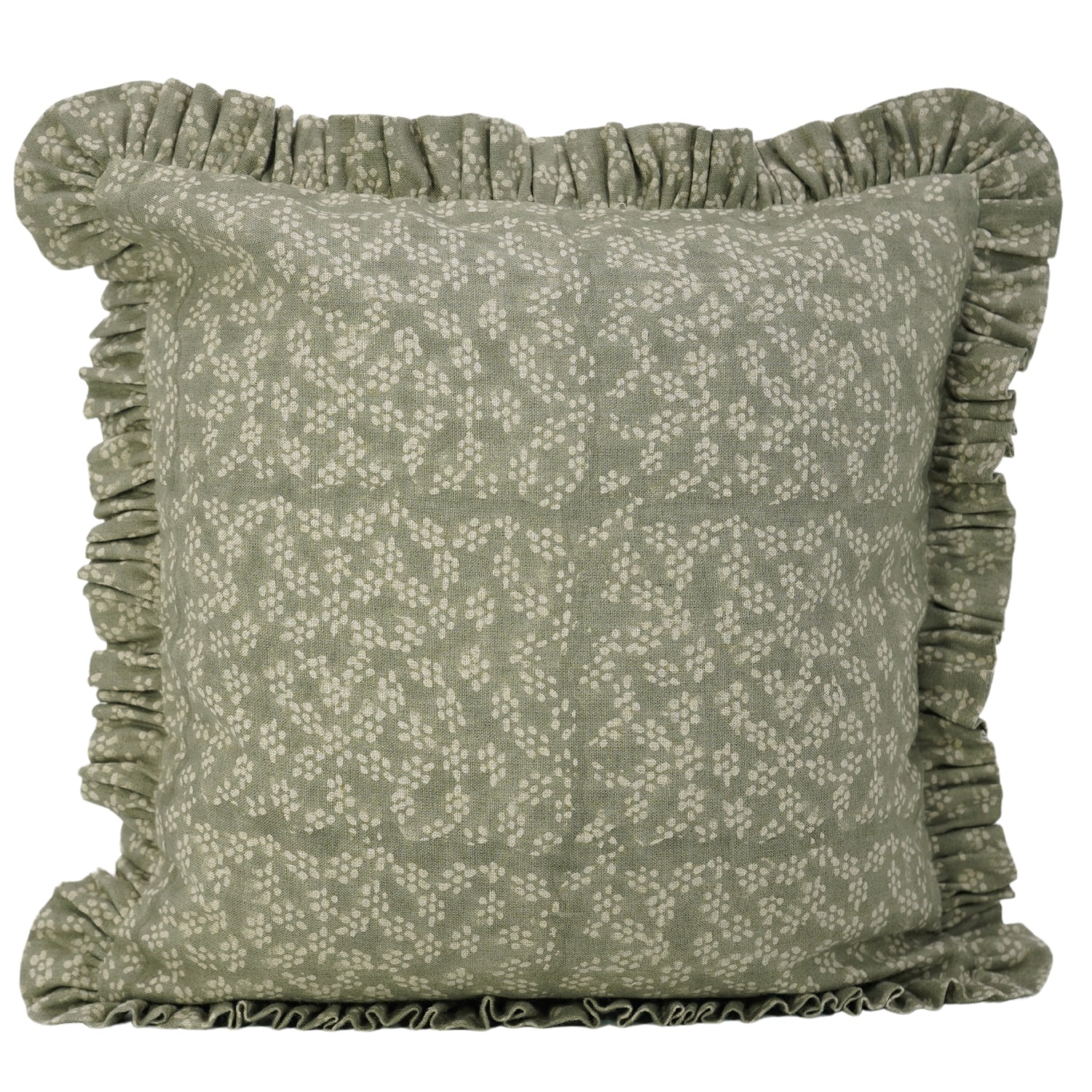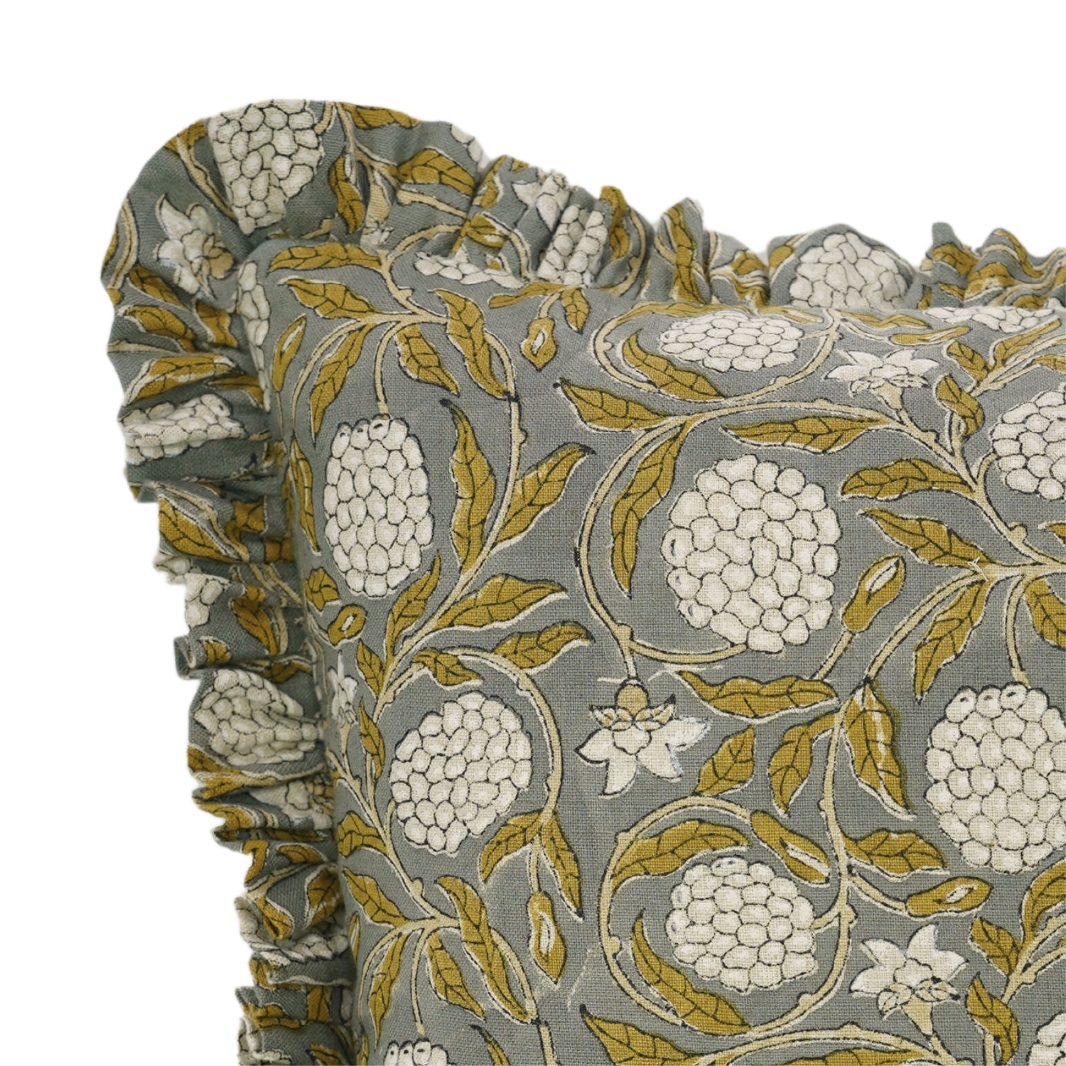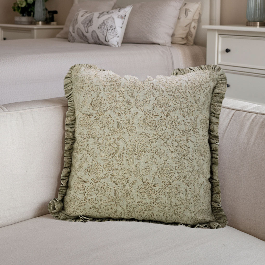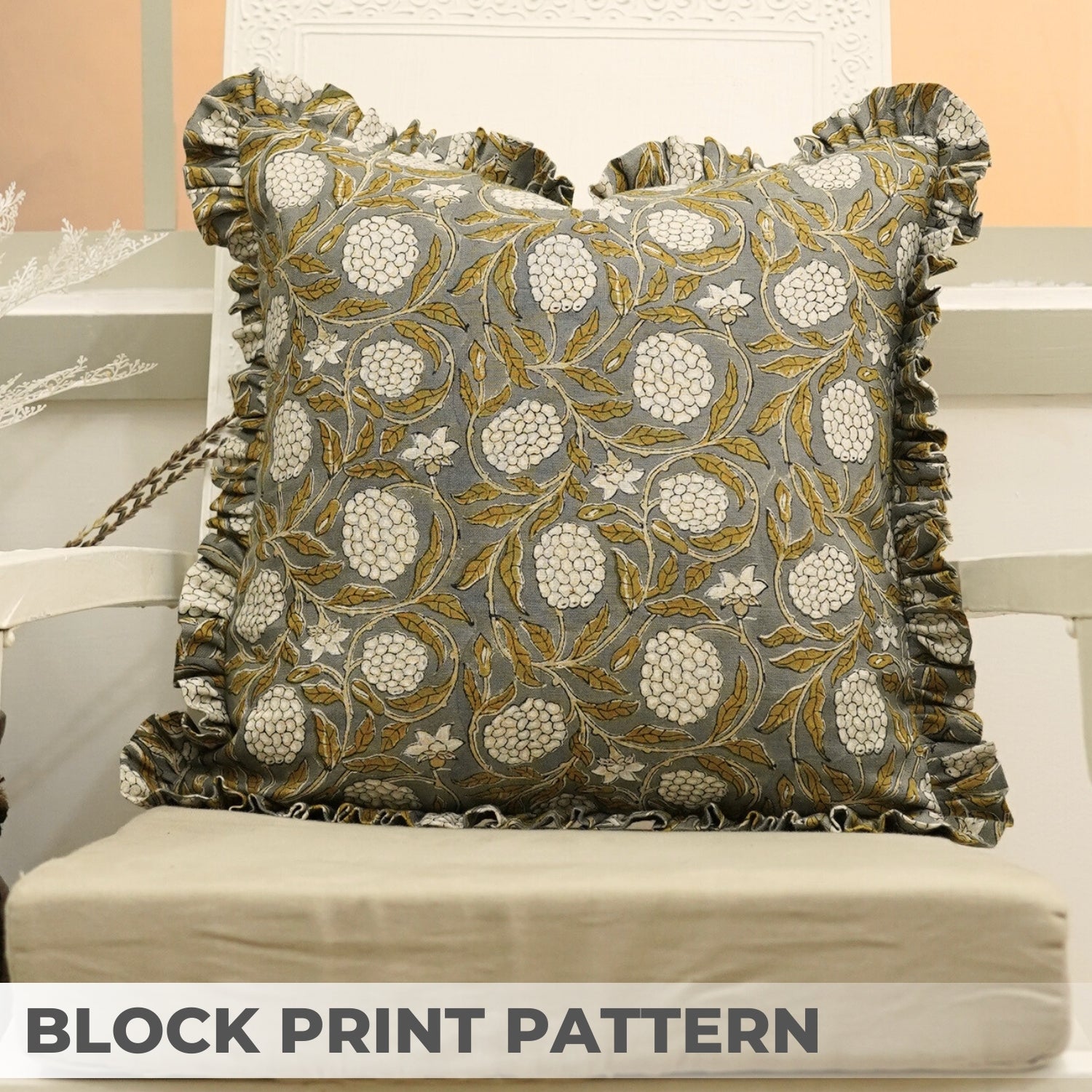A square-shaped pillow cover with a floral block print design and frill edge, predominantly in gray and green tones.
