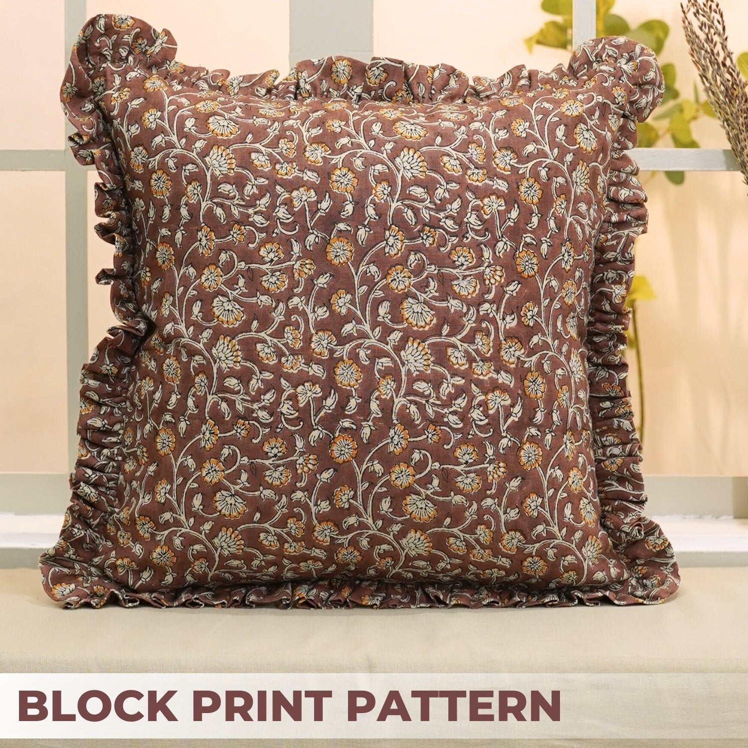 Handblock Printed Floral Design Indoor Pillow Cover - 6 Kamal Brown By Fabdivine