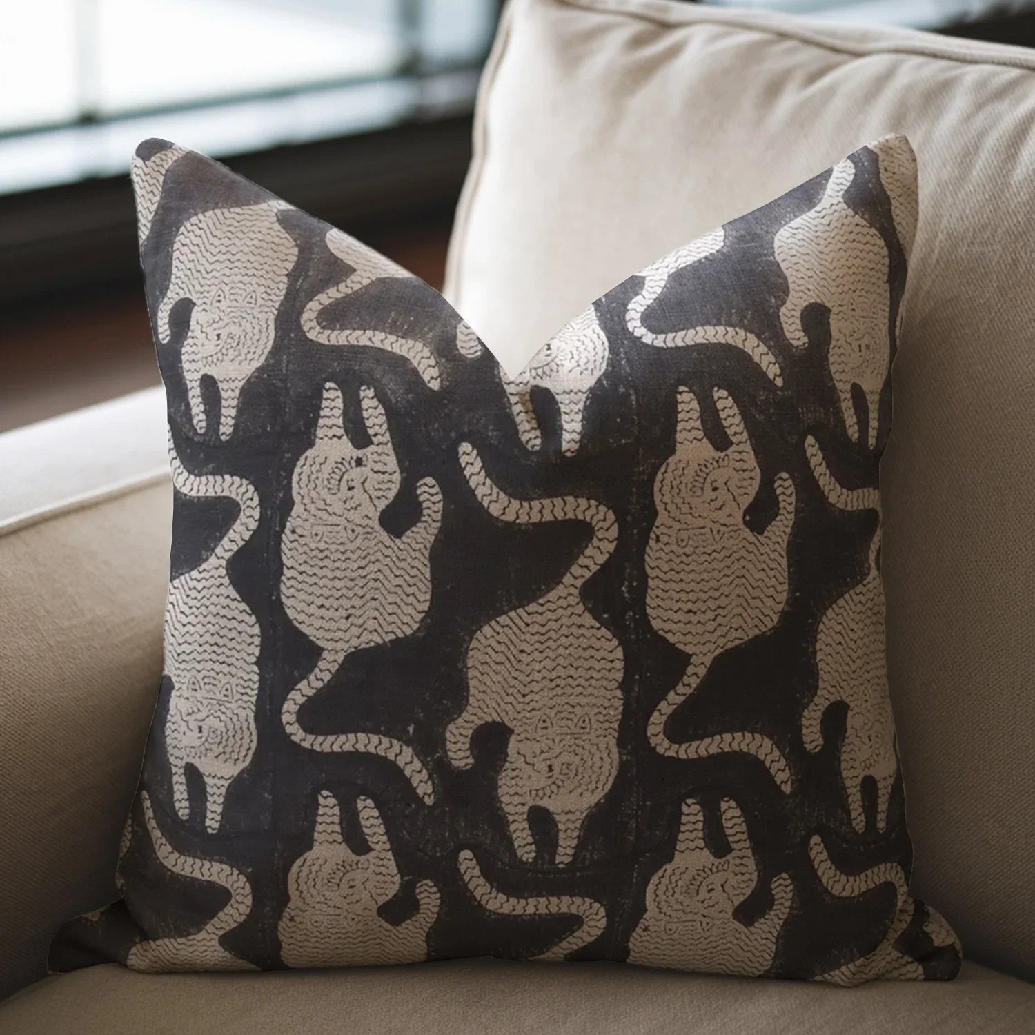 Block print Heavy Linen Pillow Cover - BIJHNI BLACK - Fabdivine