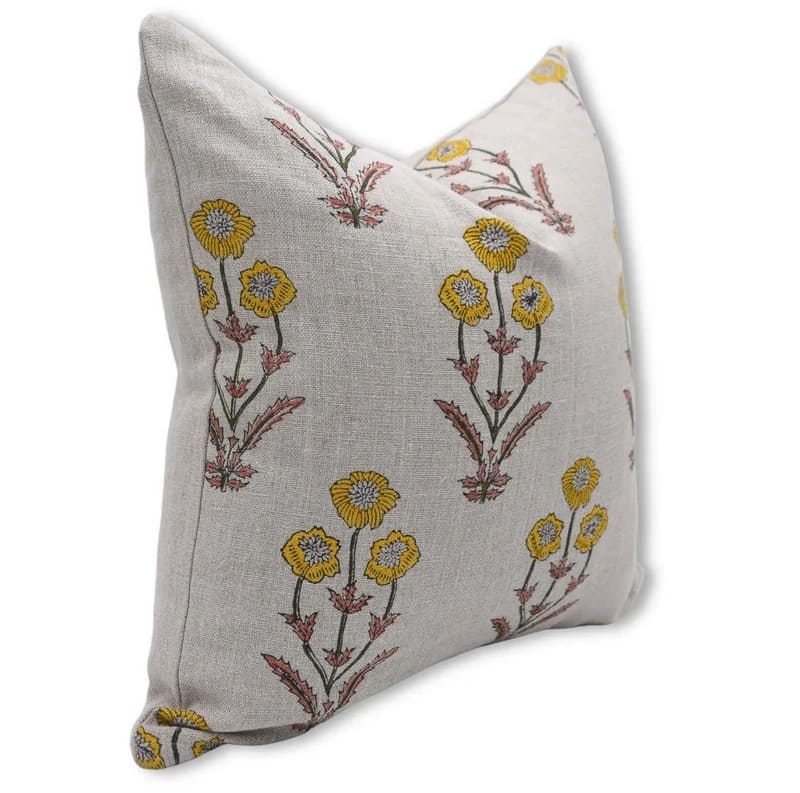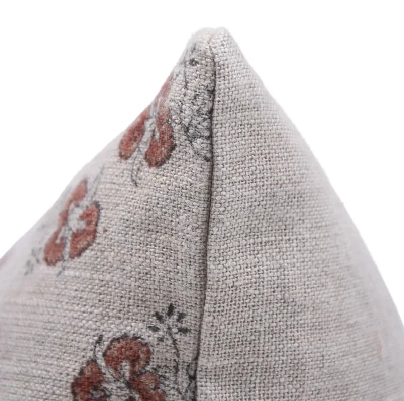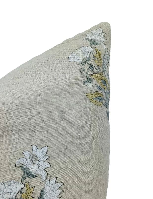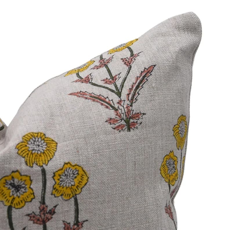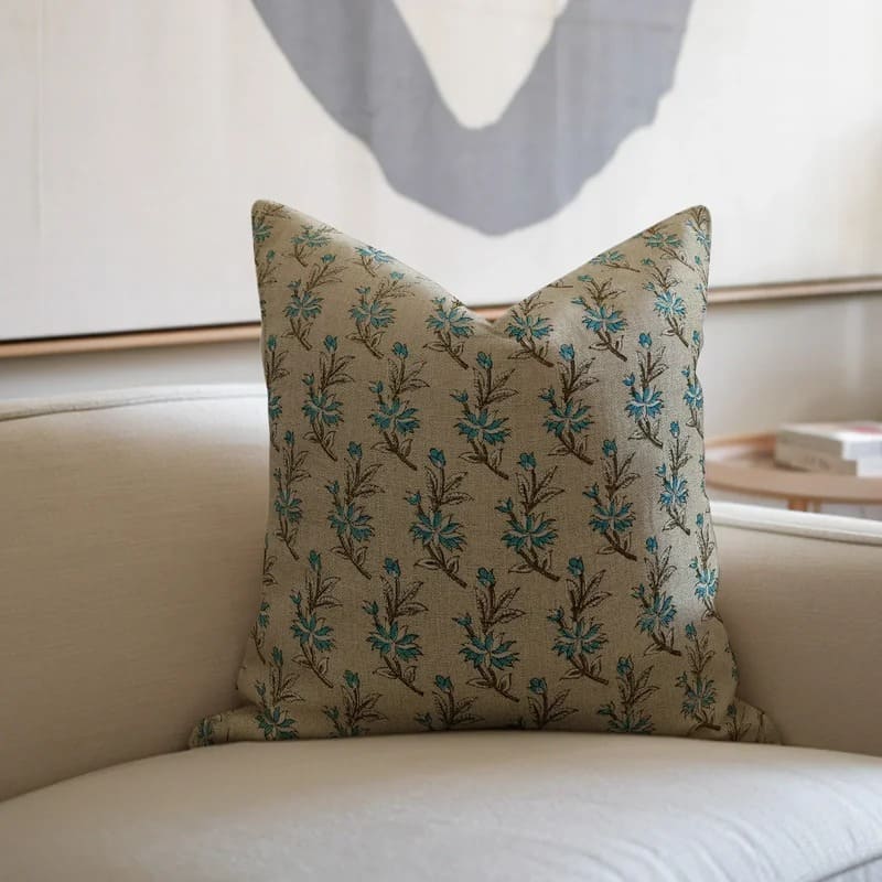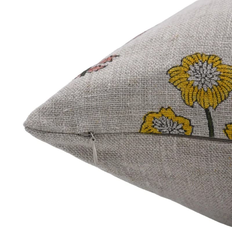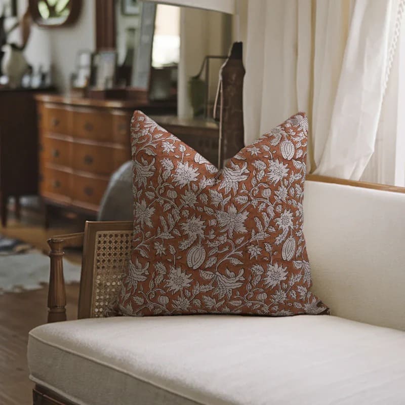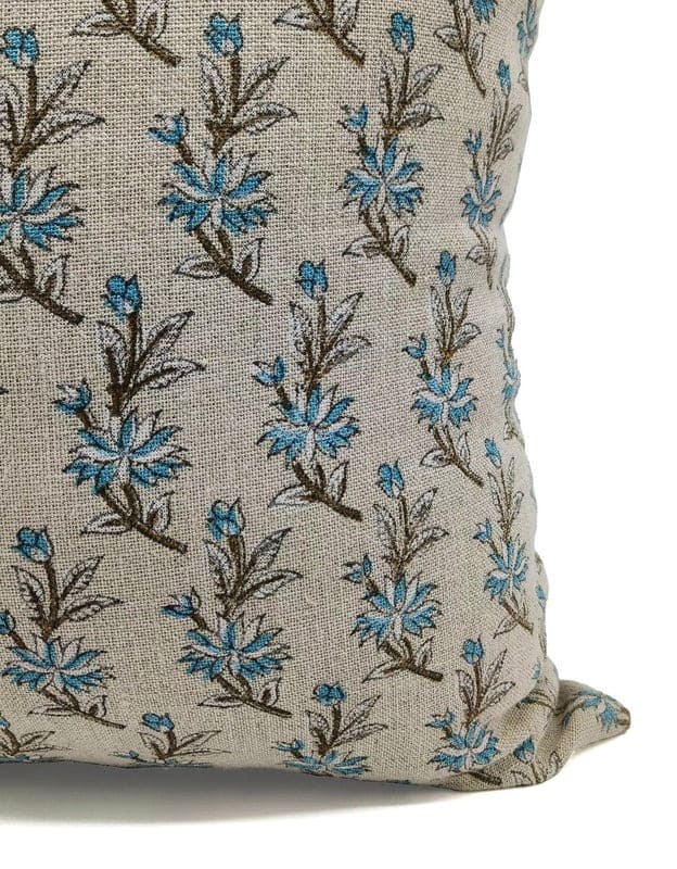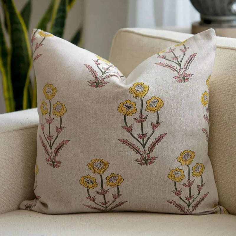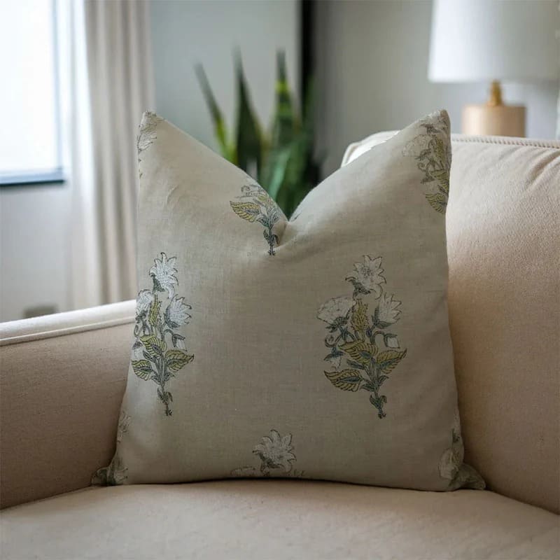 Bring summer magic home with the cushion that carries heritage warmth, linen coolness, and print exuberance.