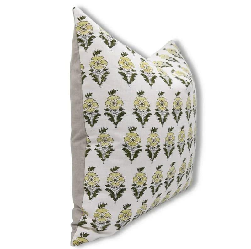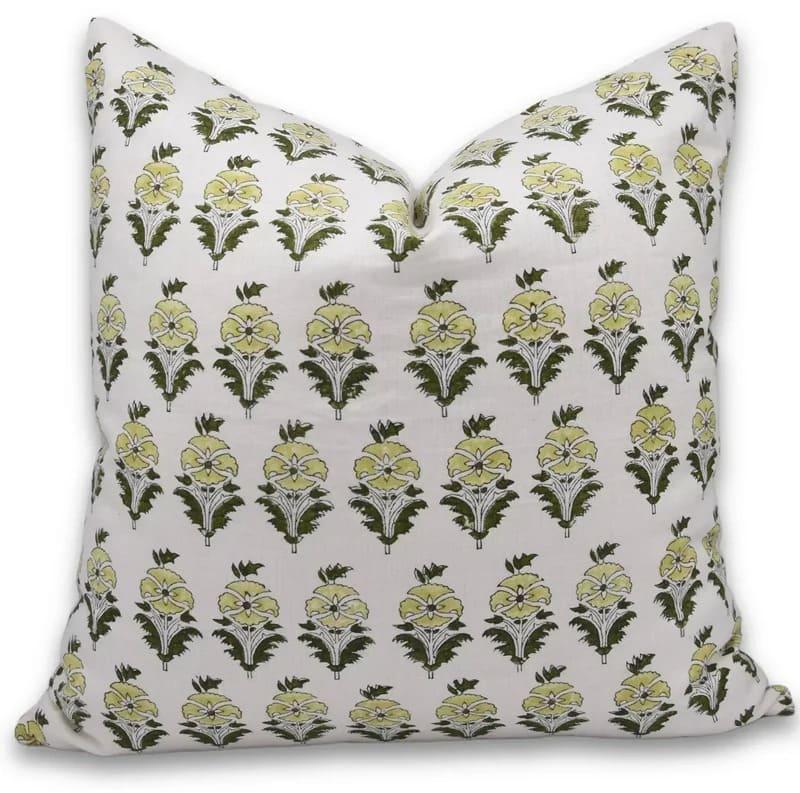 Block Printed Pure Linen Green Boho Throw Pillow Cover with Knife Edges - Sunflower
