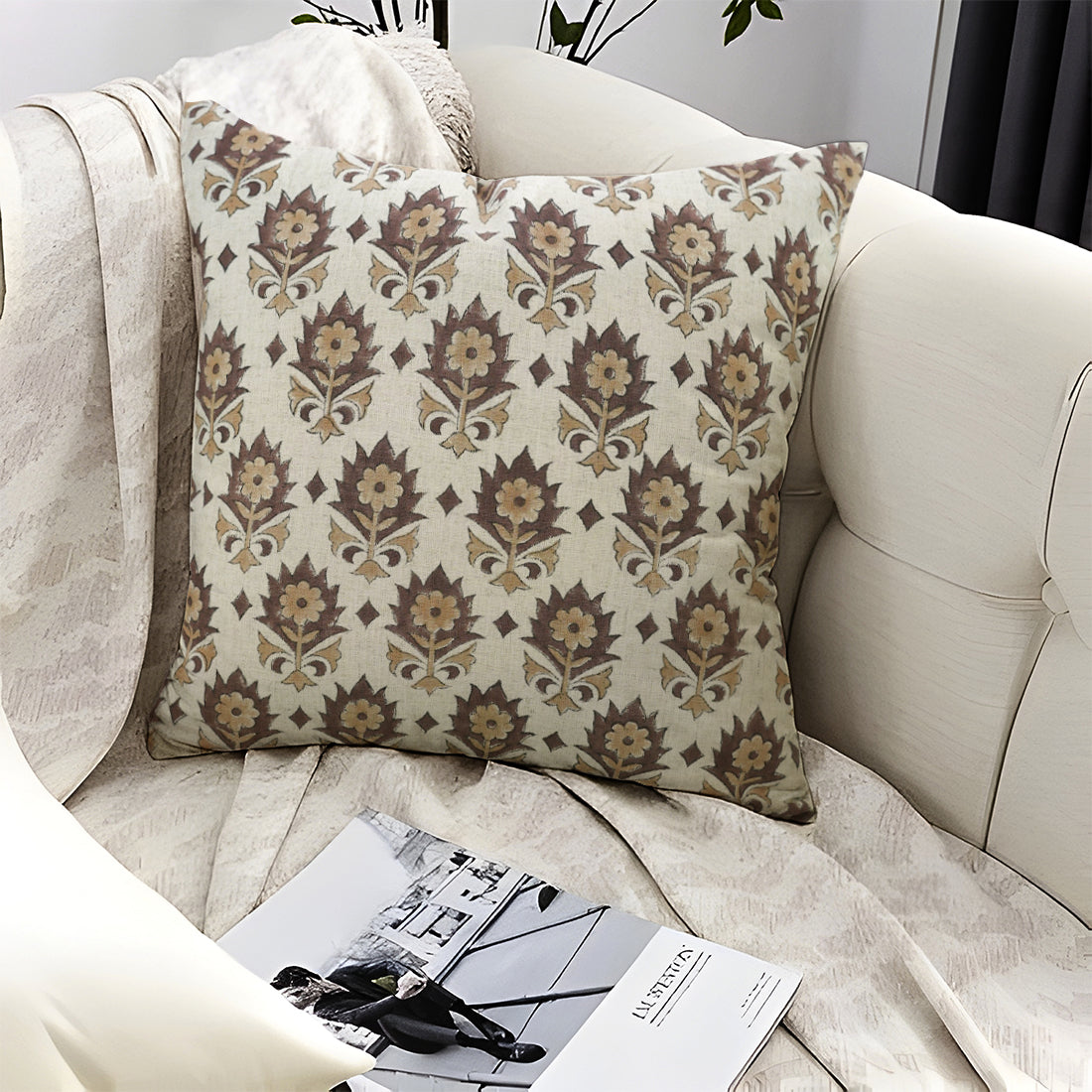 Elegant Floral Handblock Printed Linen Blend Square Pillow Case – Mrignayani Brown