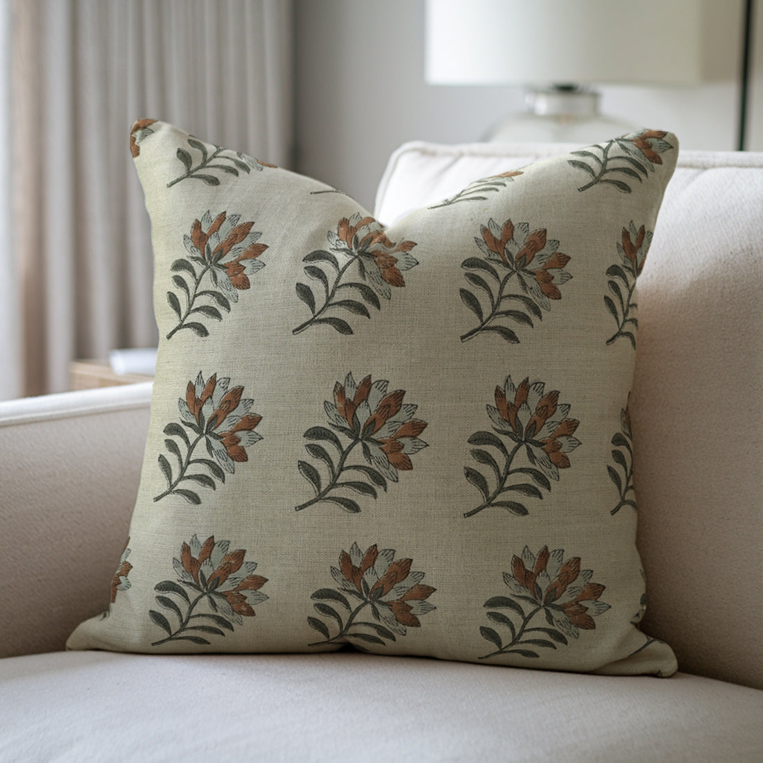 Farmhouse Floral Designer Pillow Cover – Handmade Indian Block Printed Linen Blend - Rohini Brown