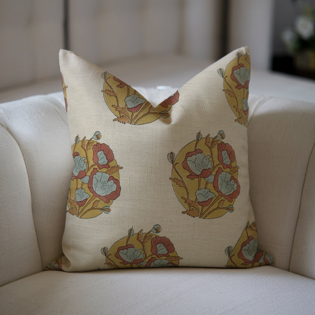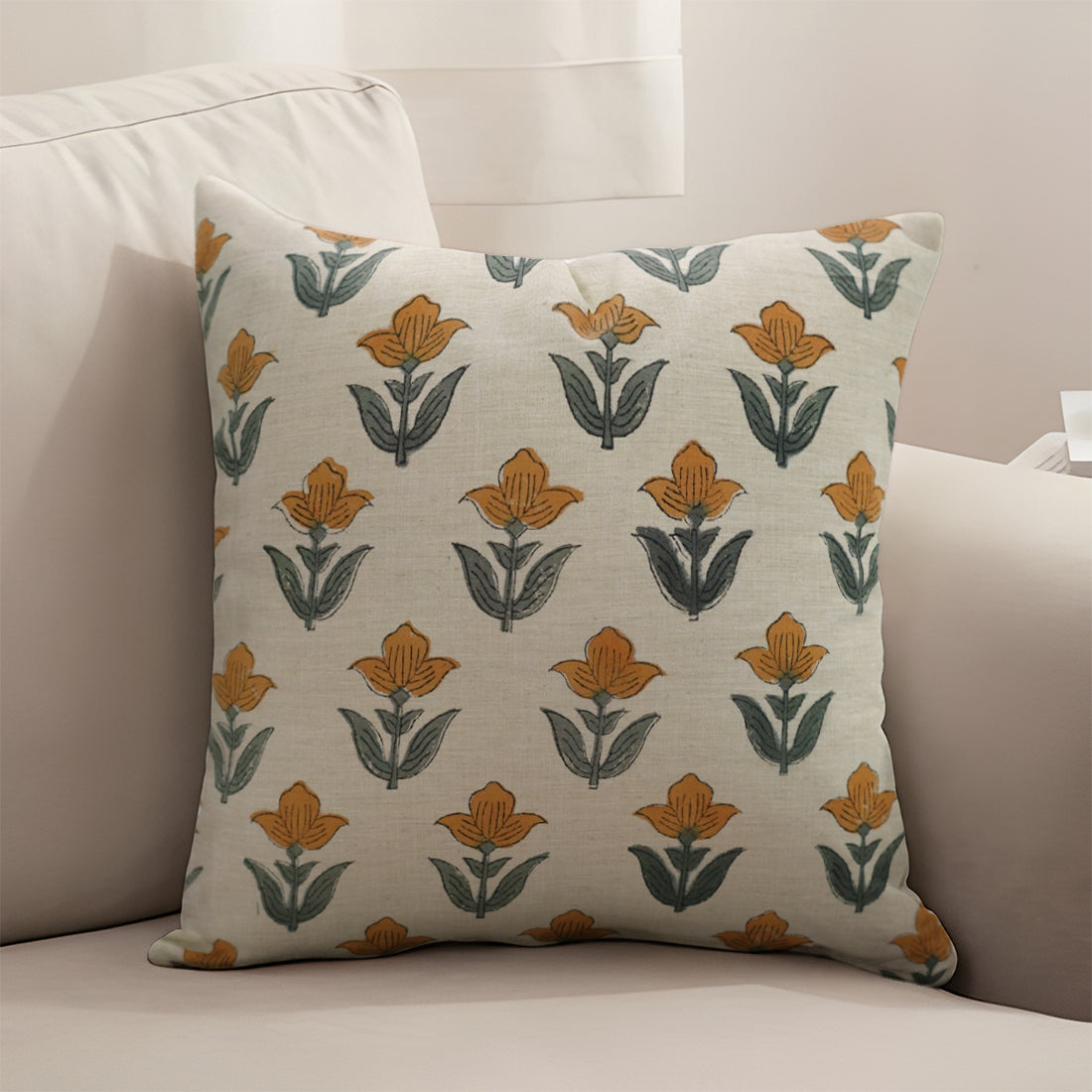 Tulip Yellow Handmade Floral Cushion Case – Indian Block Printed Linen Blend for Indoor Elegance