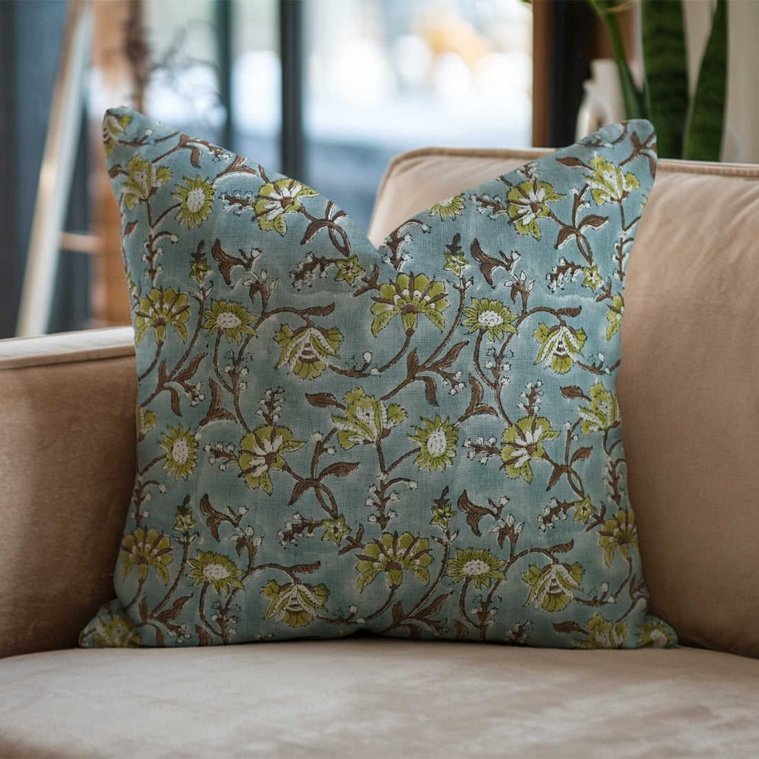 Square Sustainable Throw Pillow Cover Kusum Floral Light Blue – Handmade for Farmhouse Charm Linen Blend
