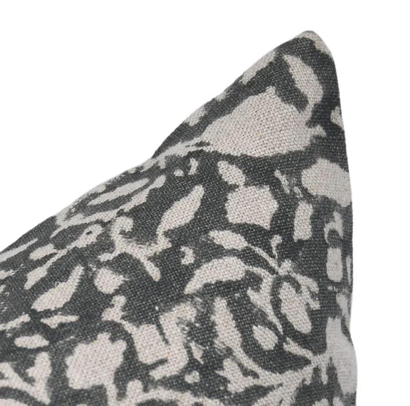 Decorative pillow with black and white floral pattern on a white background