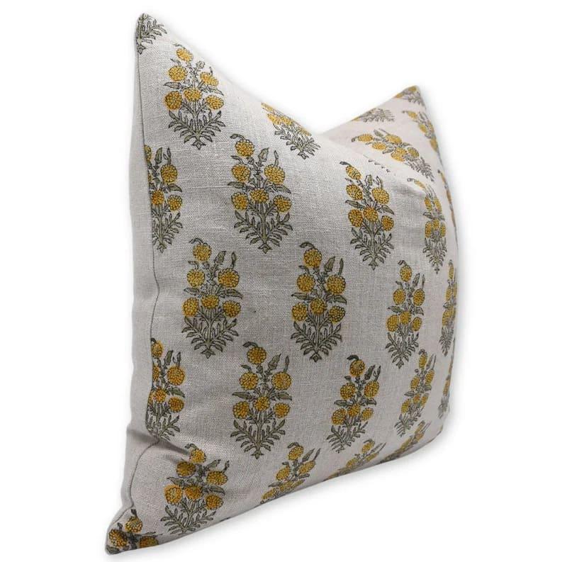 Block print thick cotton white throw pillow cover- ALIA Yellow and White - Fabdivine