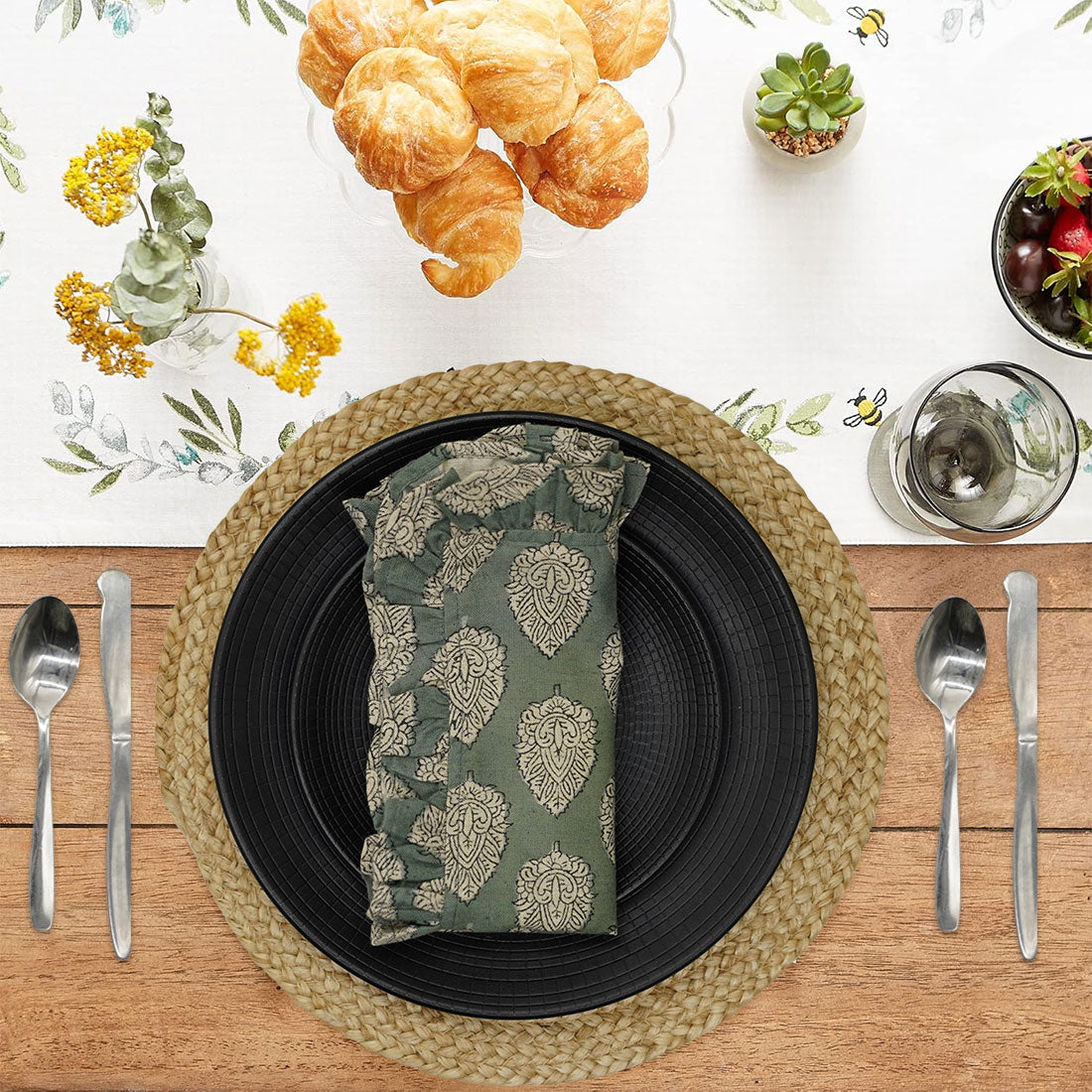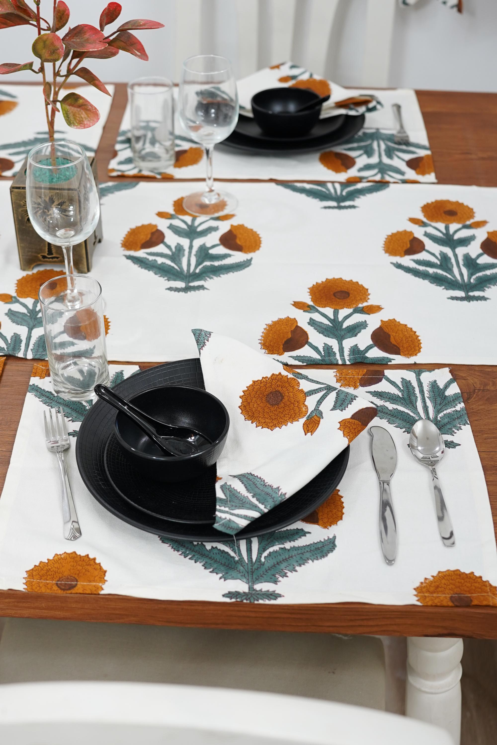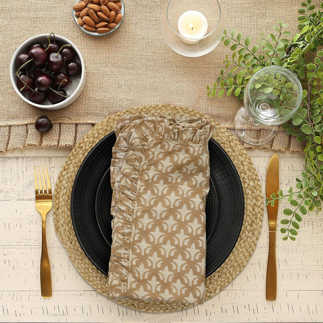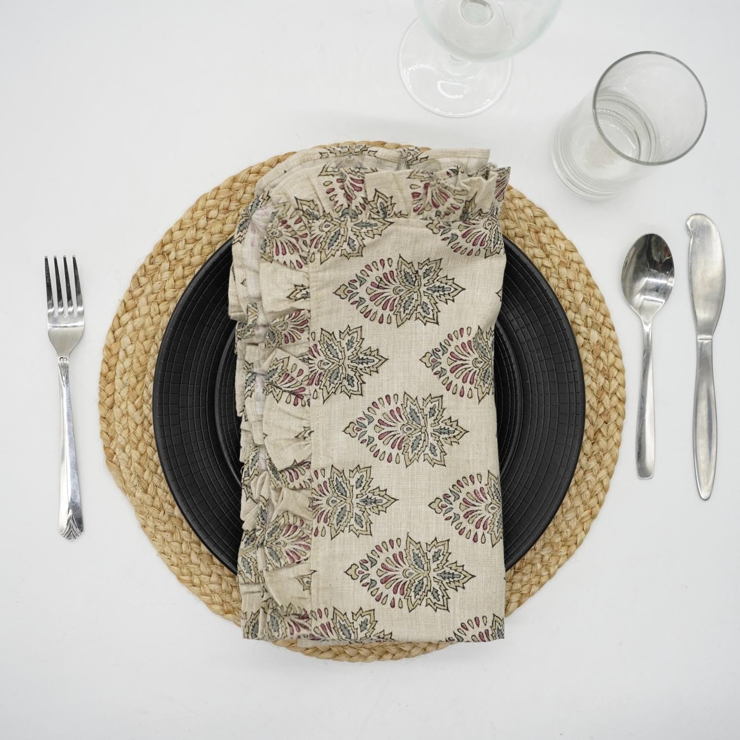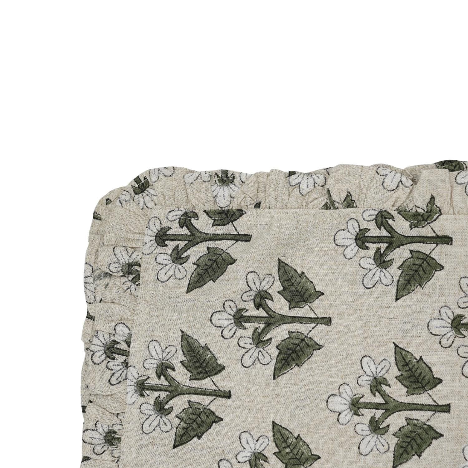 Hand-stamped floral motifs that remind one of block-printing techniques celebrate artisanal work and add some offbeat charm to your dining experience. The romantic frill edging has rustic linen napkins for a wedding kind of vibe, hence very suitable for your family dinners as well as your fashionable events.