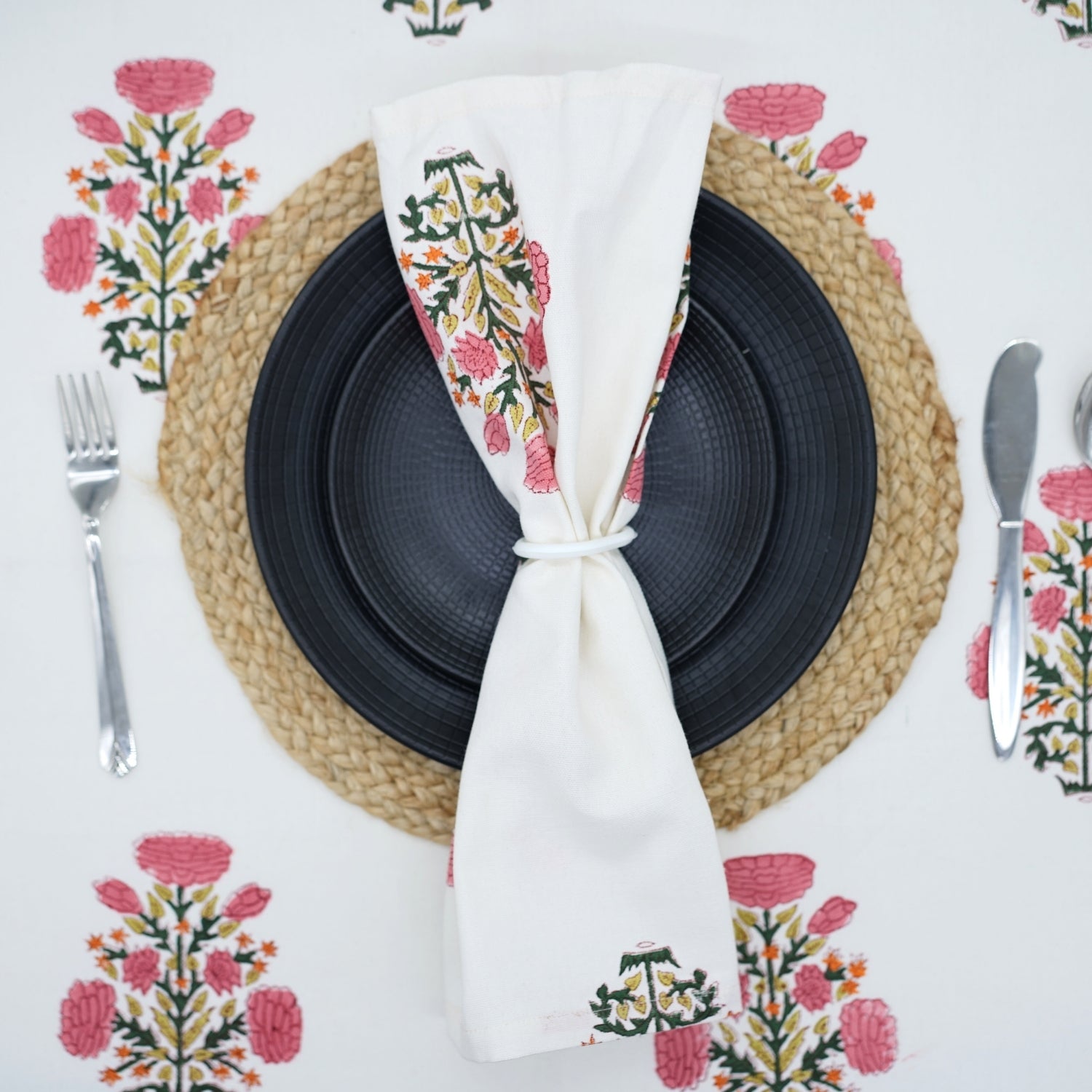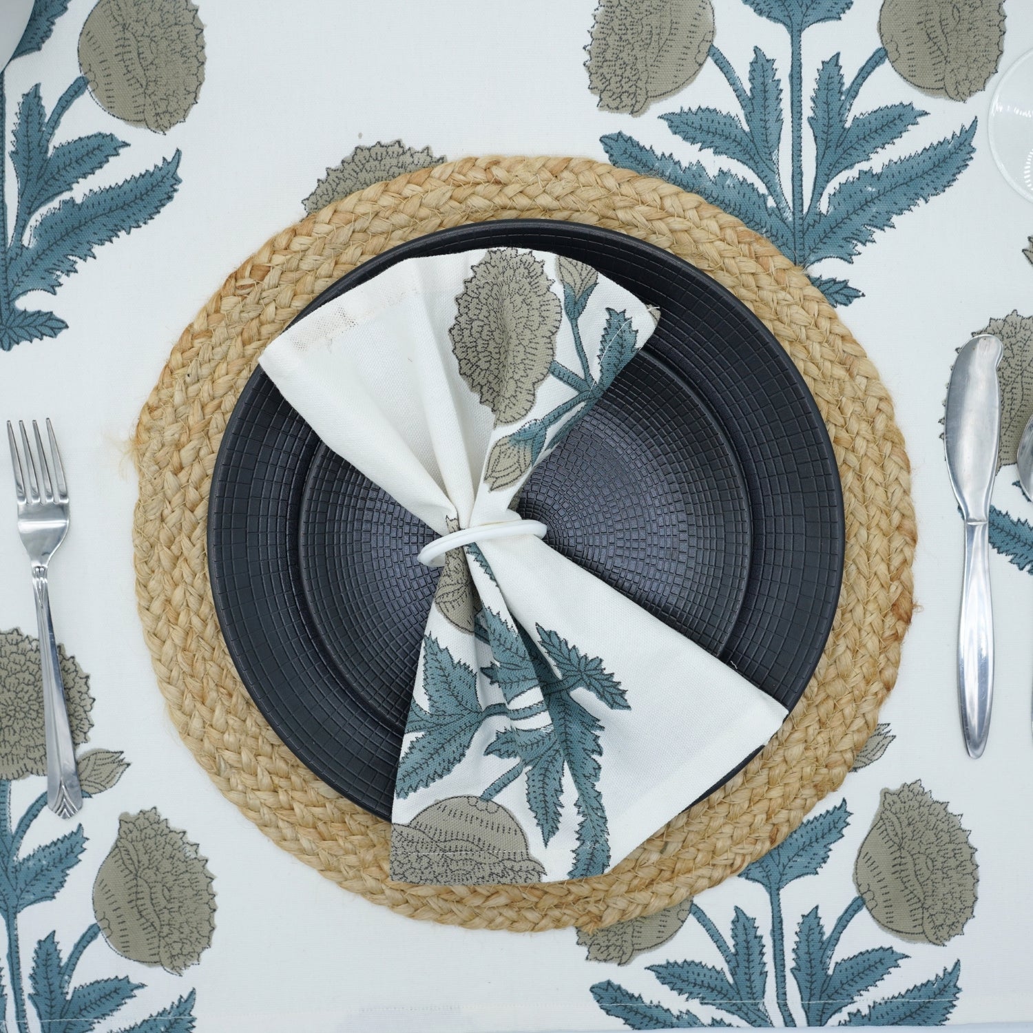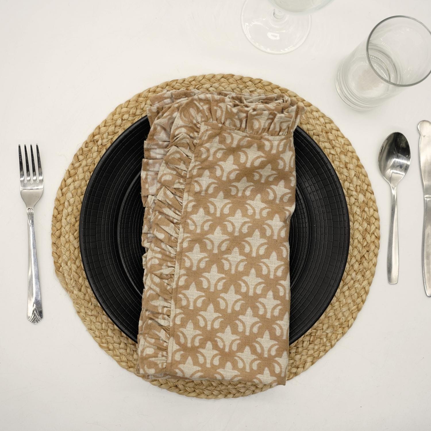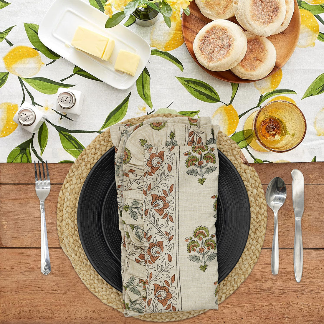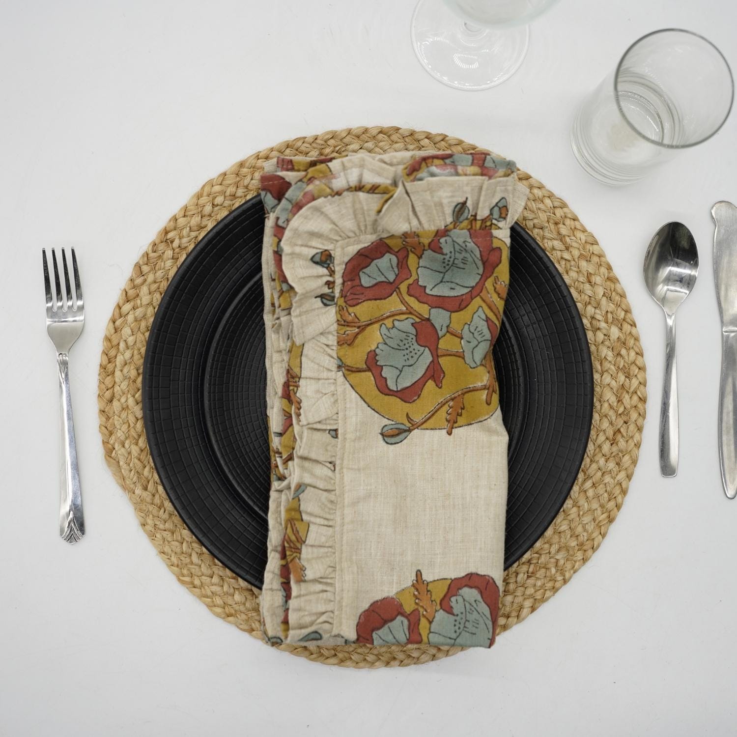 Hand-stamped floral motifs that remind one of block-printing techniques celebrate artisanal work and add some offbeat charm to your dining experience. The romantic frill edging has rustic linen napkins for a wedding kind of vibe, hence very suitable for your family dinners as well as your fashionable events.