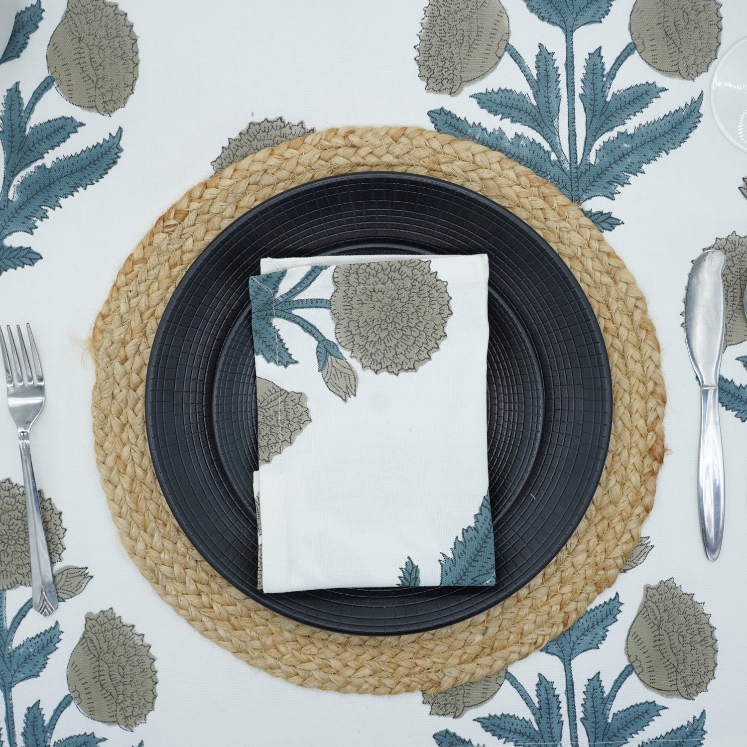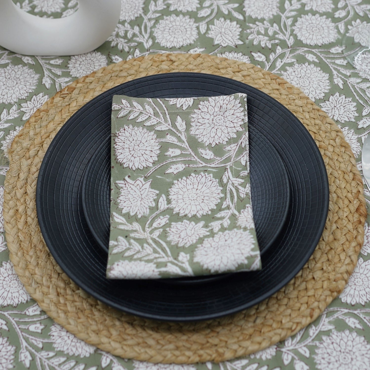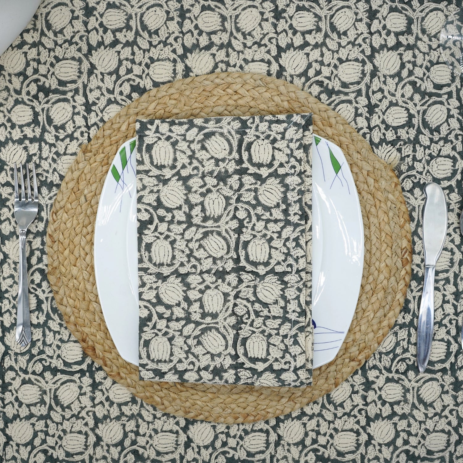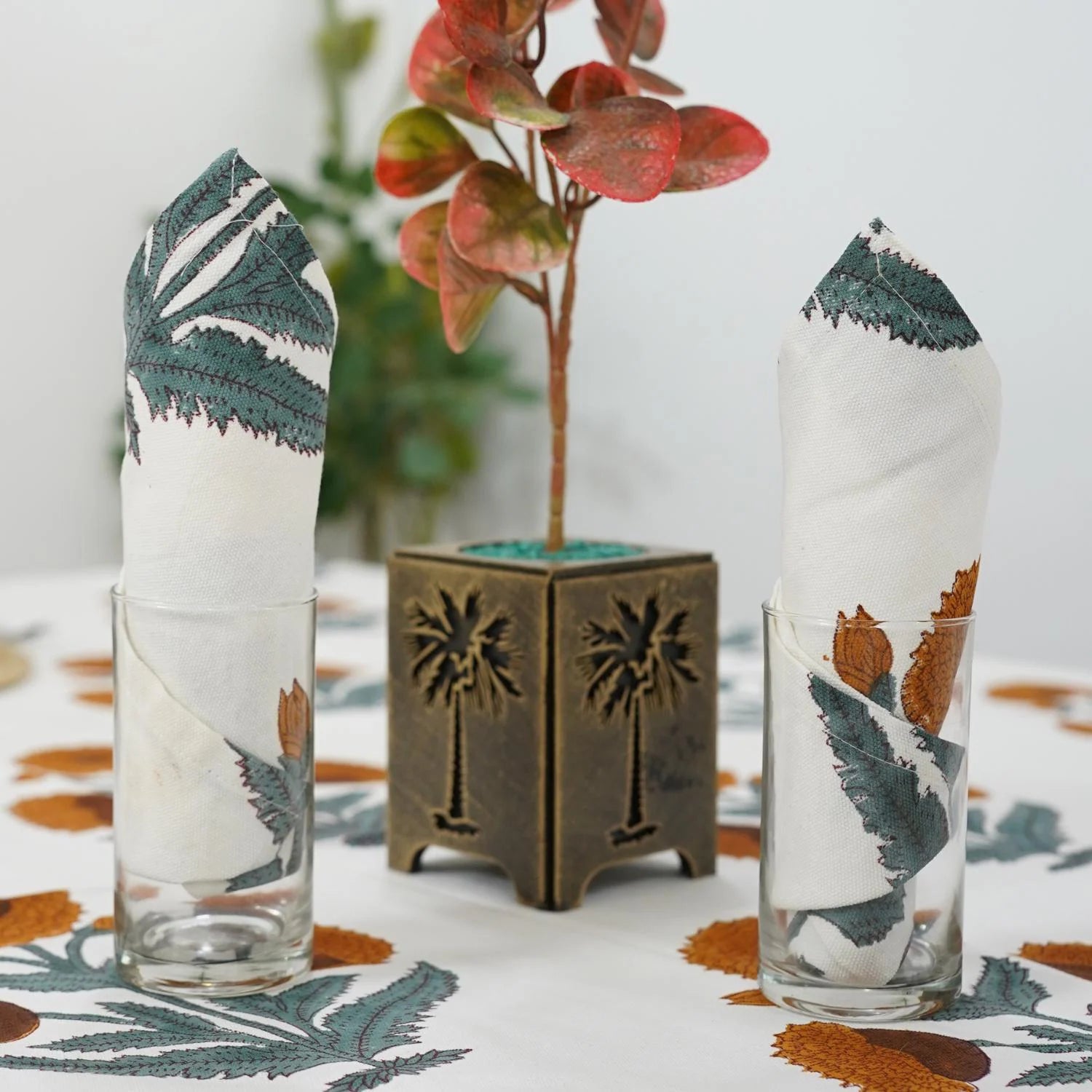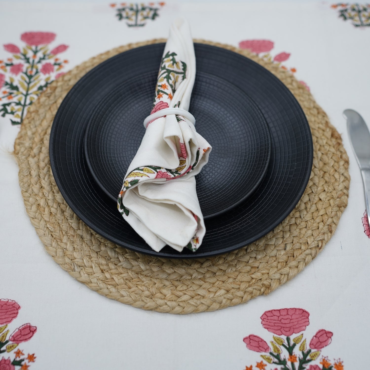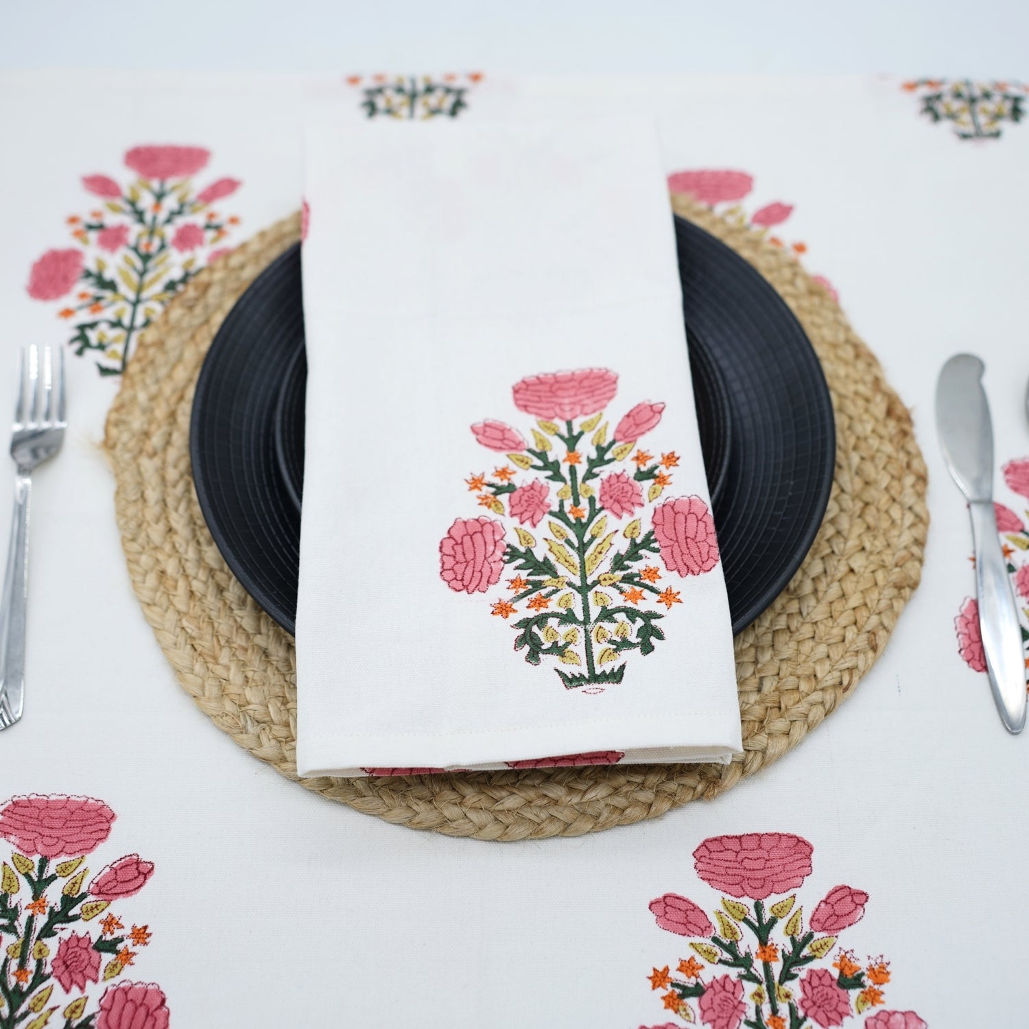 Hand-stamped floral motifs that remind one of block-printing techniques celebrate artisanal work and add some offbeat charm to your dining experience. The romantic frill edging has rustic linen napkins for a wedding kind of vibe, hence very suitable for your family dinners as well as your fashionable events.