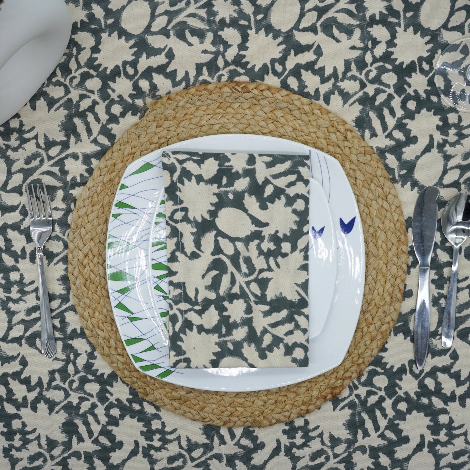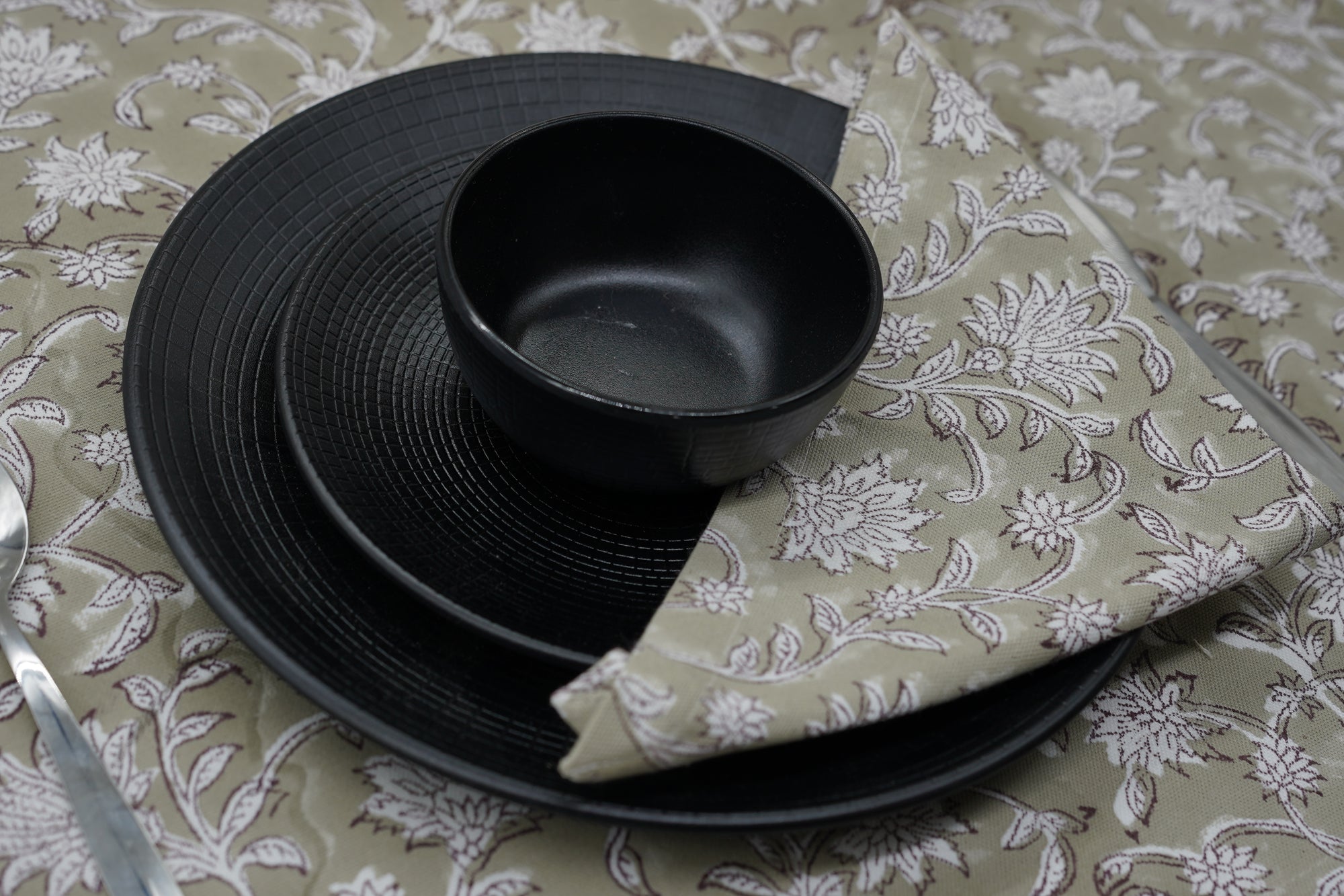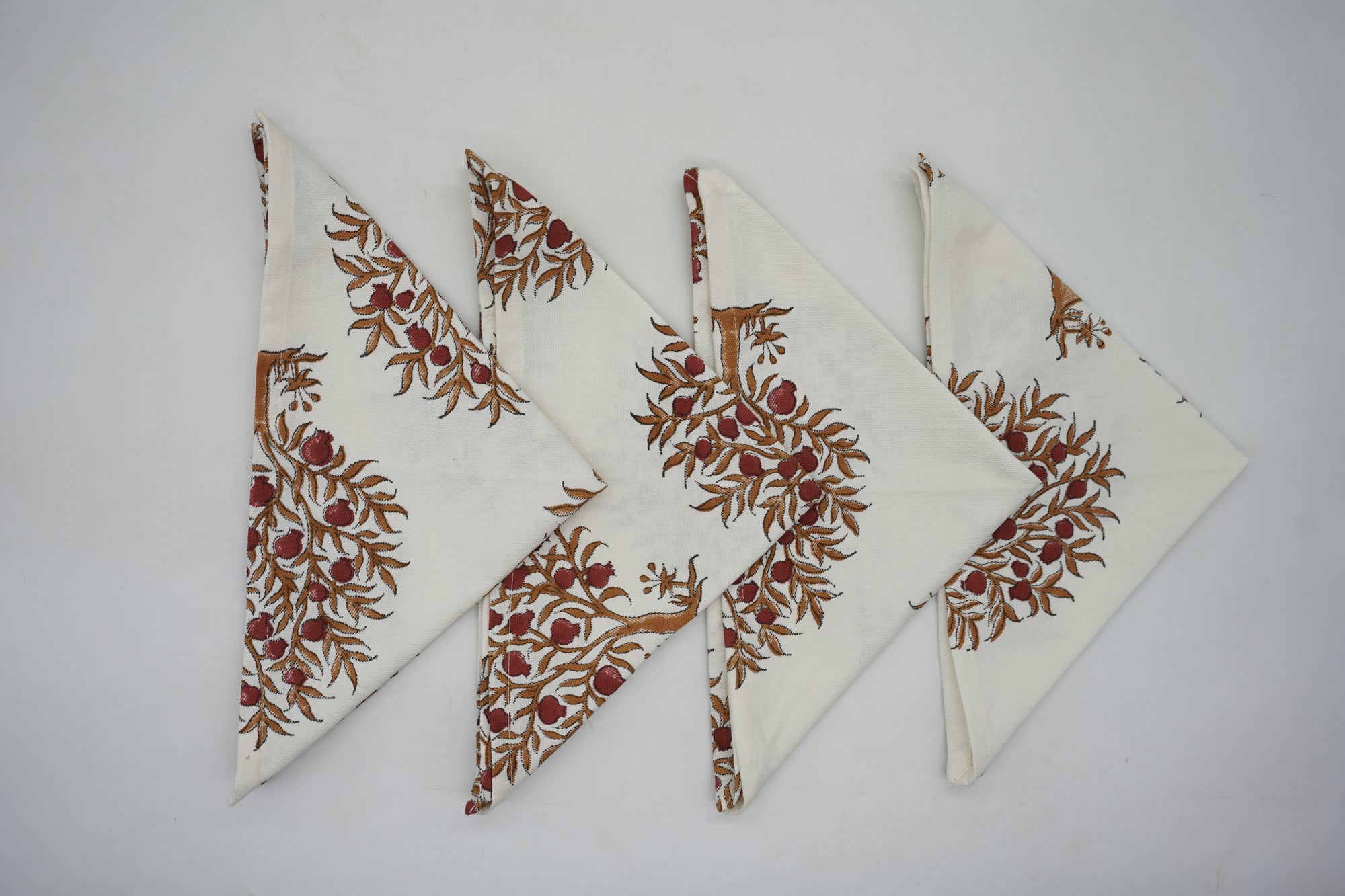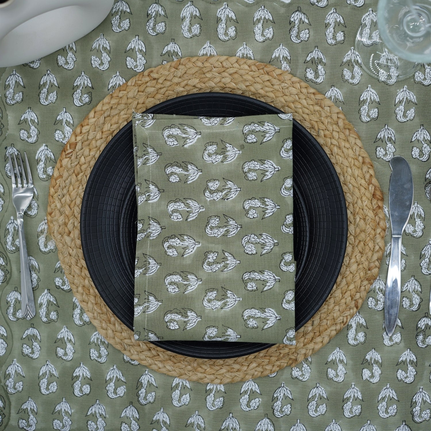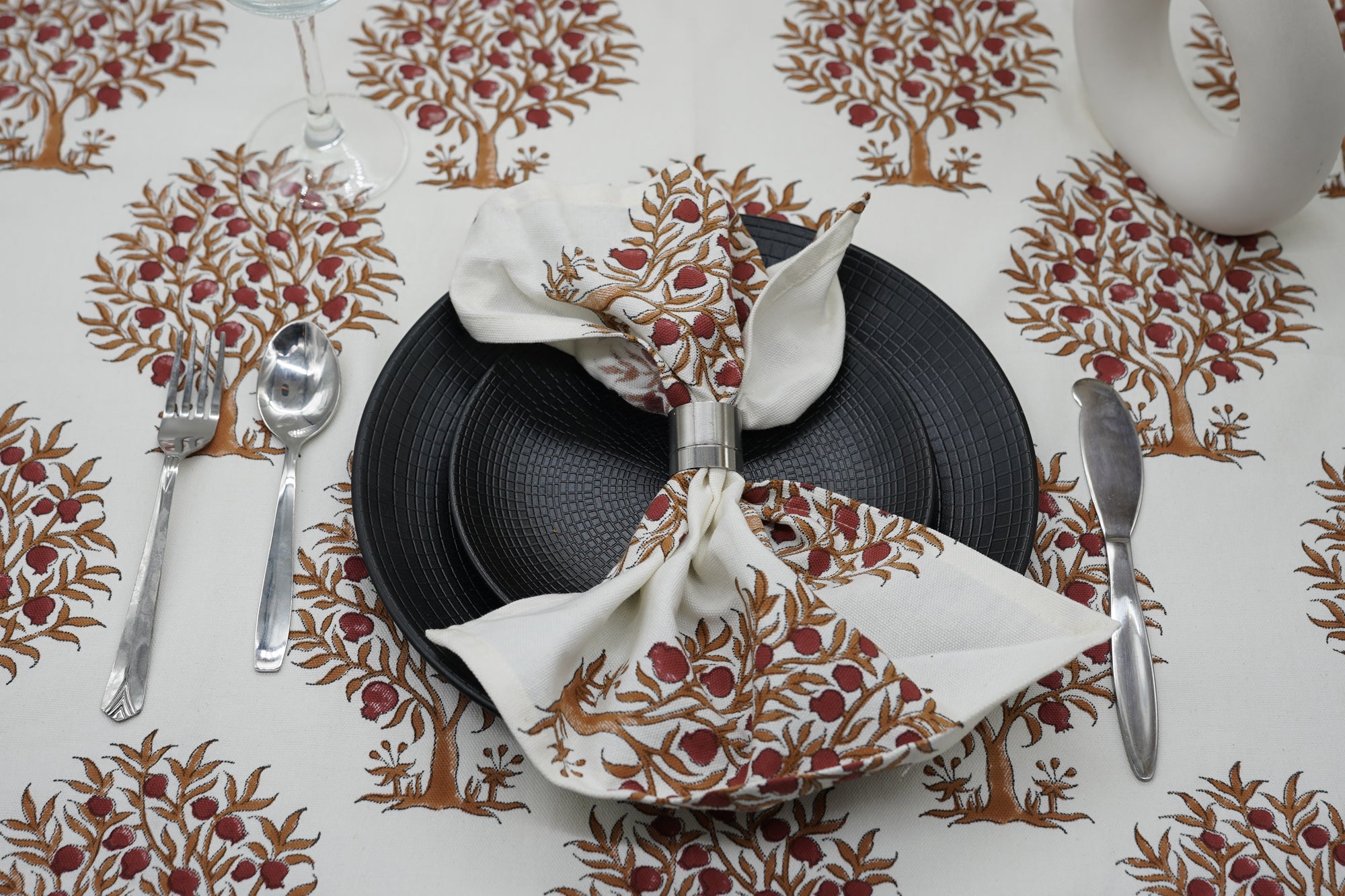 Hand-stamped floral motifs that remind one of block-printing techniques celebrate artisanal work and add some offbeat charm to your dining experience. The romantic frill edging has rustic linen napkins for a wedding kind of vibe, hence very suitable for your family dinners as well as your fashionable events.