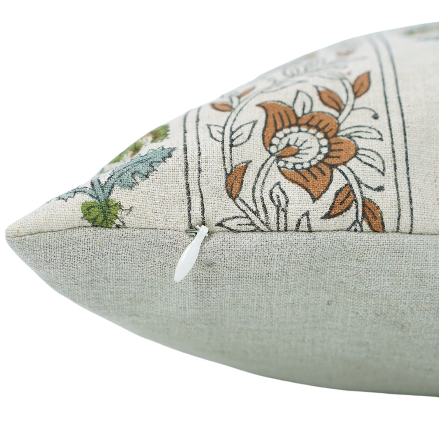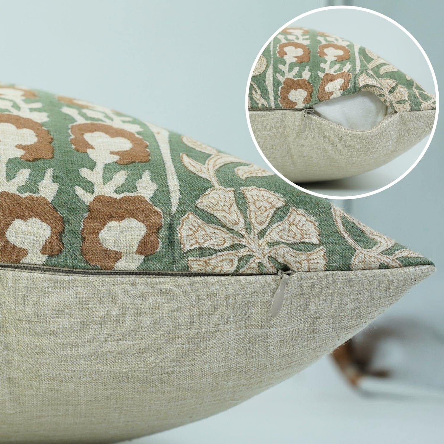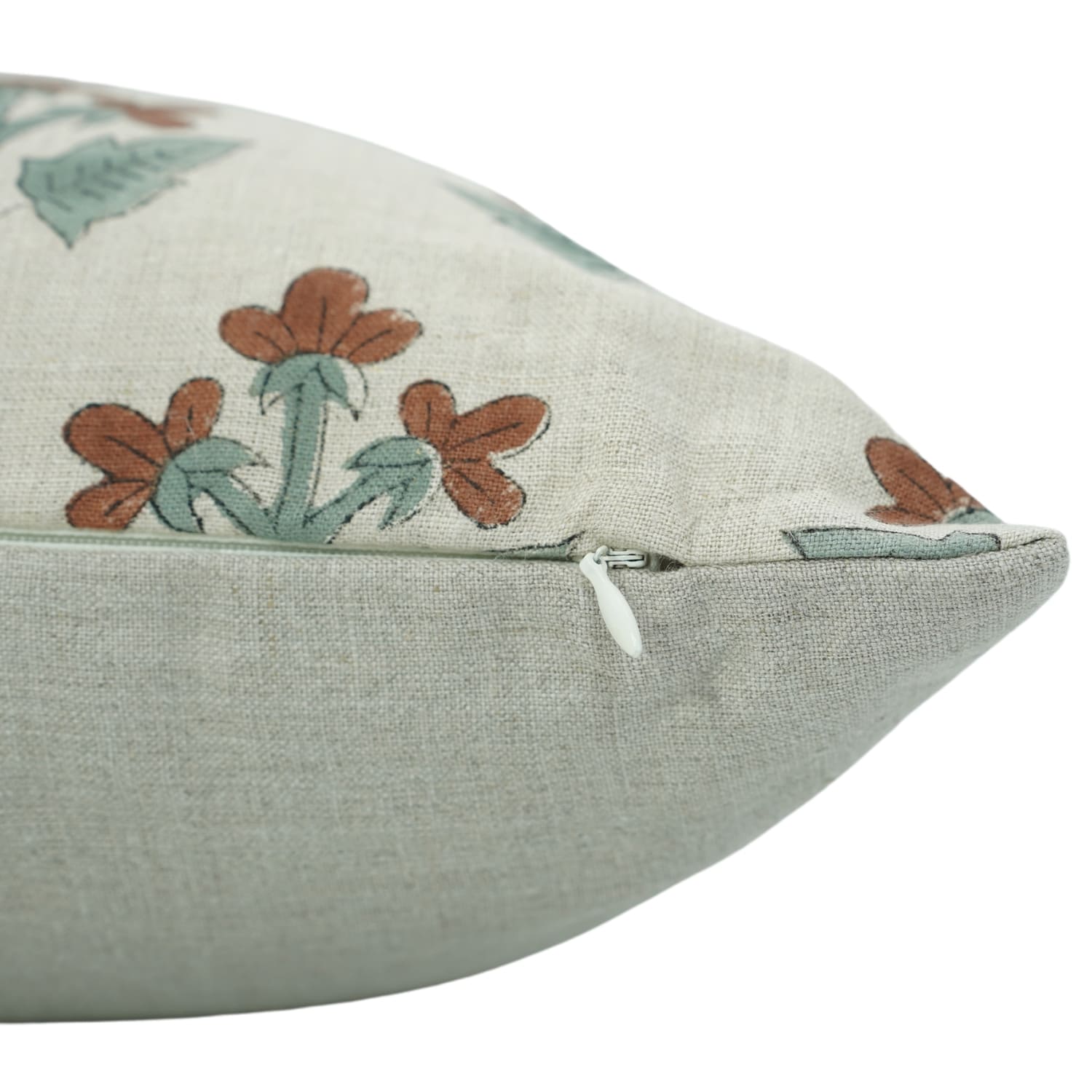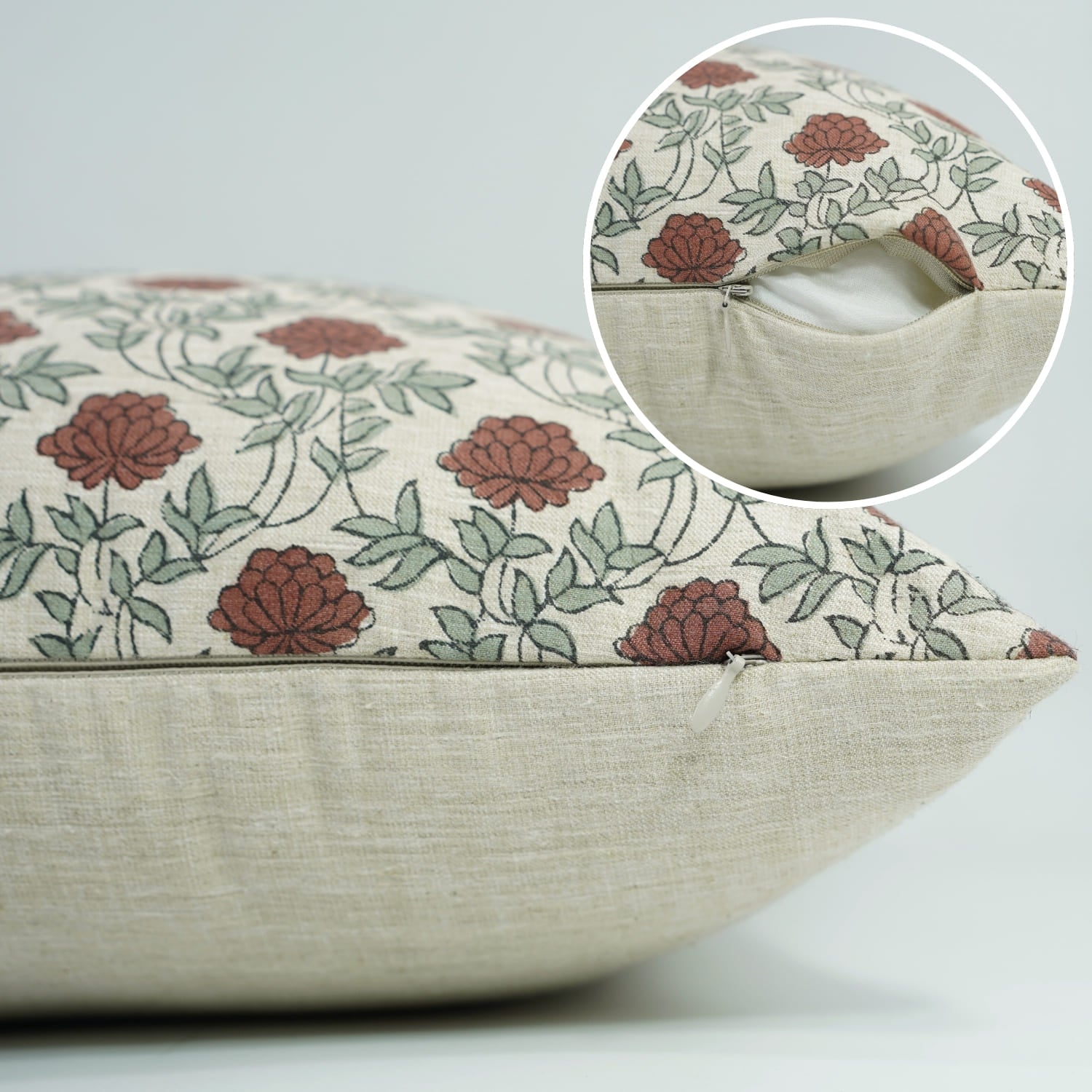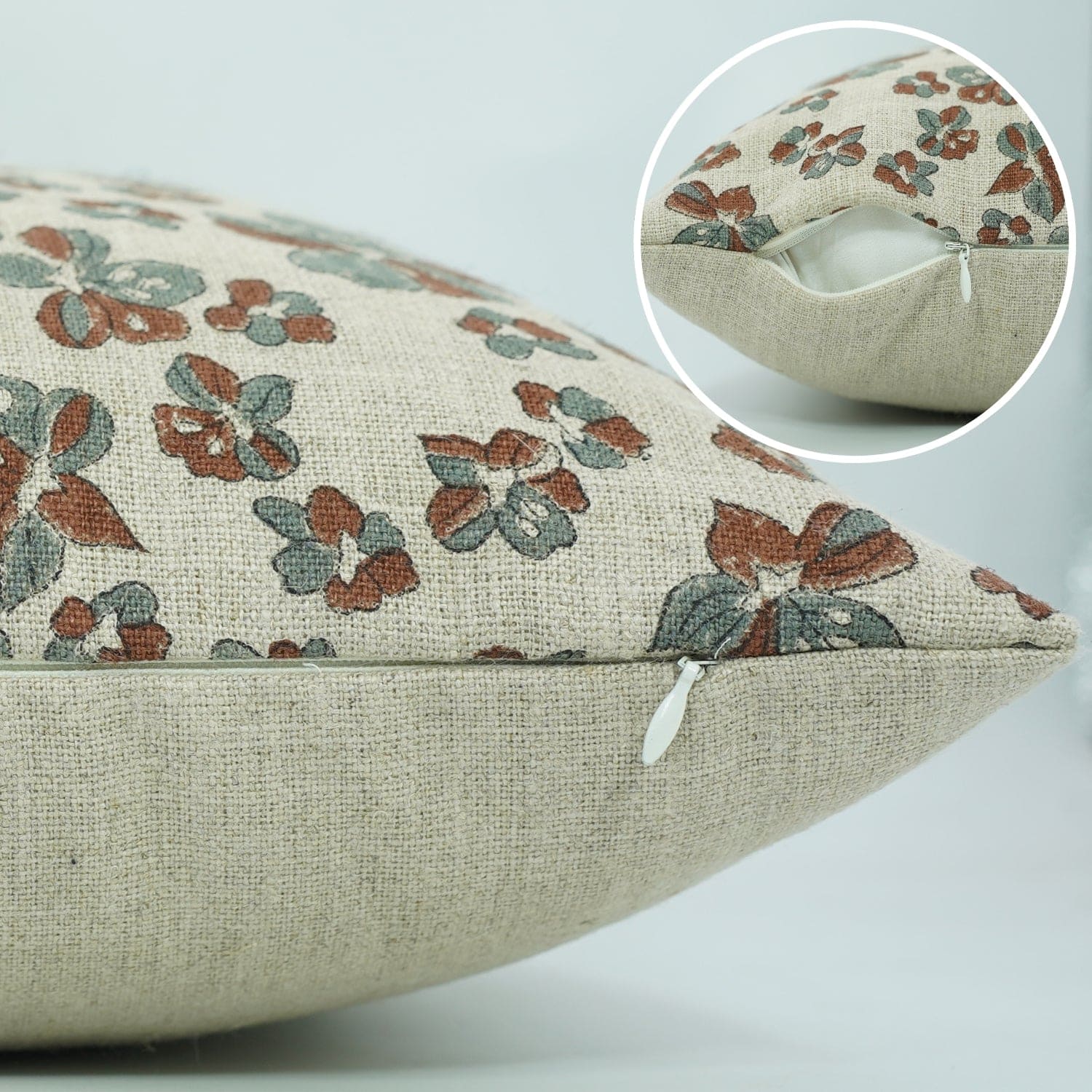Premium Linen Blend Indoor Pillow Cover - Hand Block Printed Brown and Gray Floral with Invisible Zipper