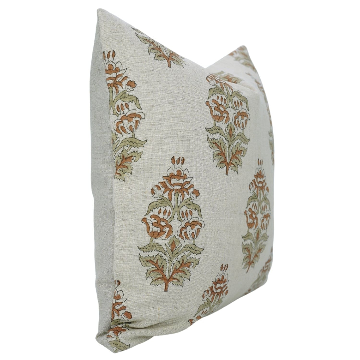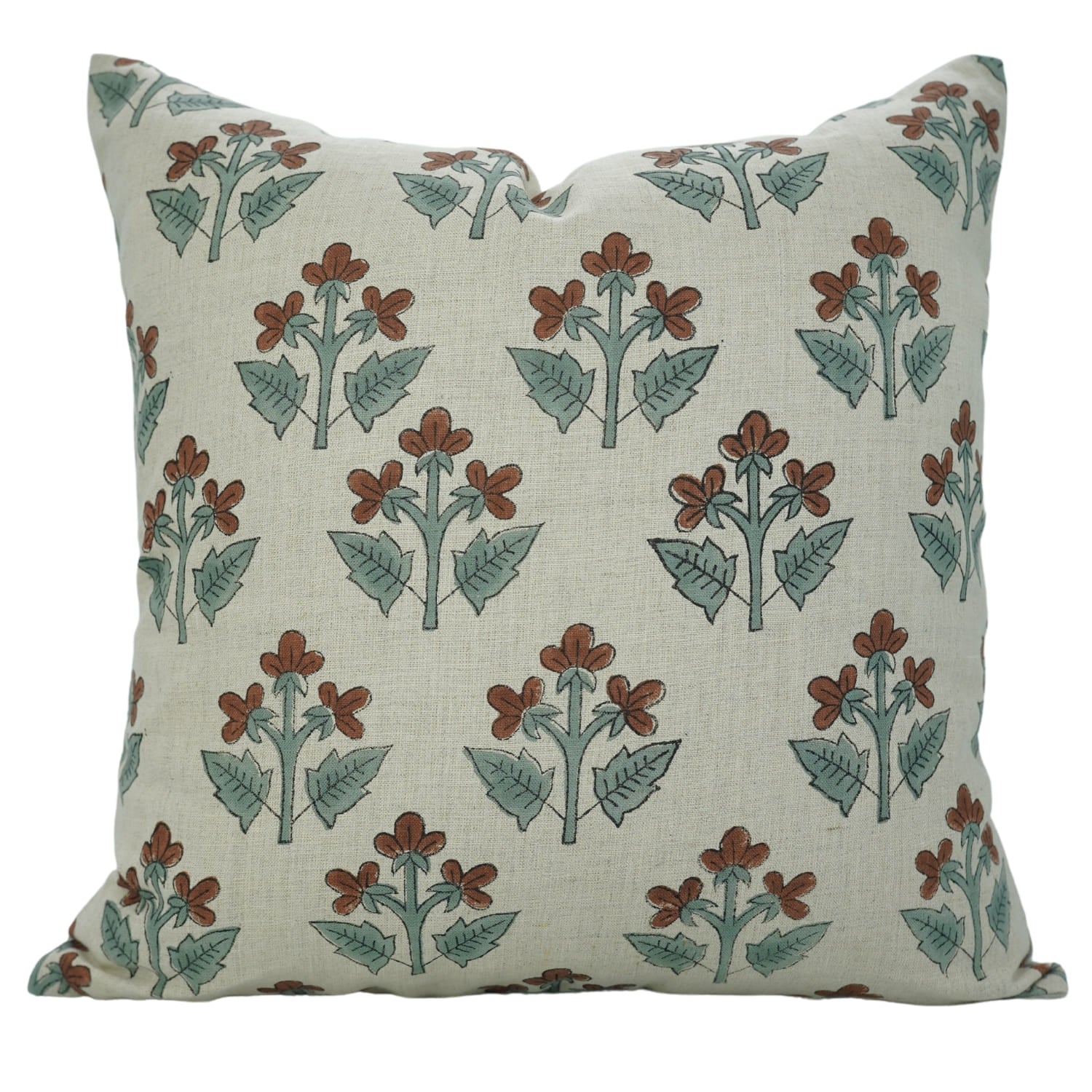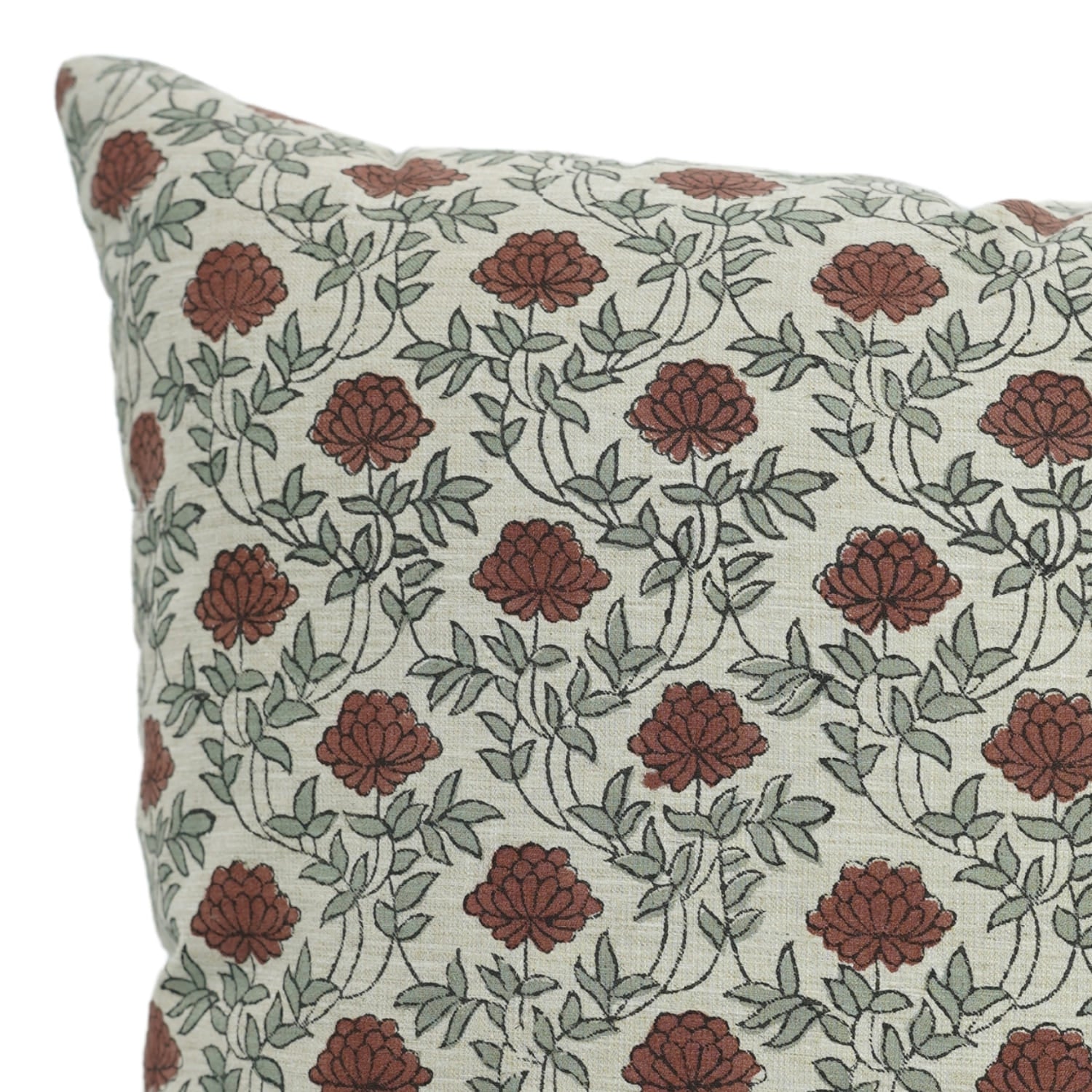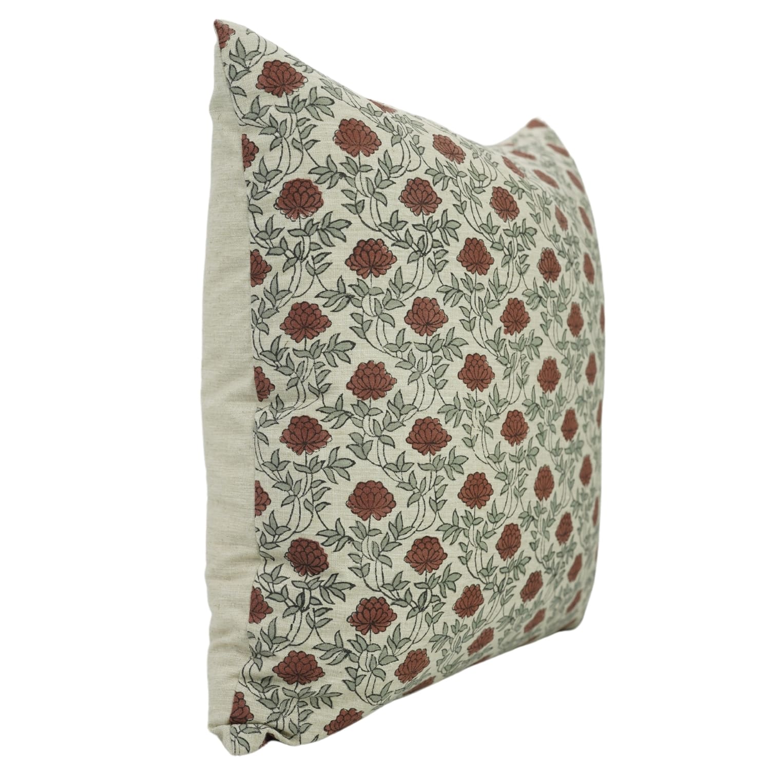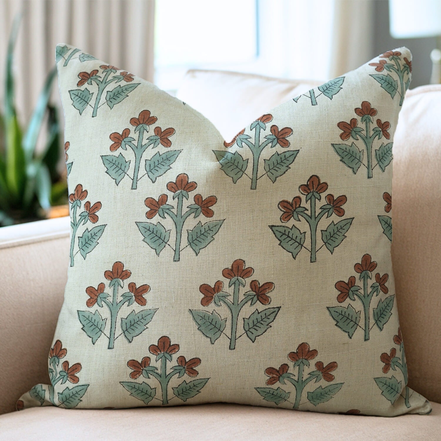 Premium Linen Blend Indoor Pillow Cover - Hand Block Printed Brown and Gray Floral with Invisible Zipper