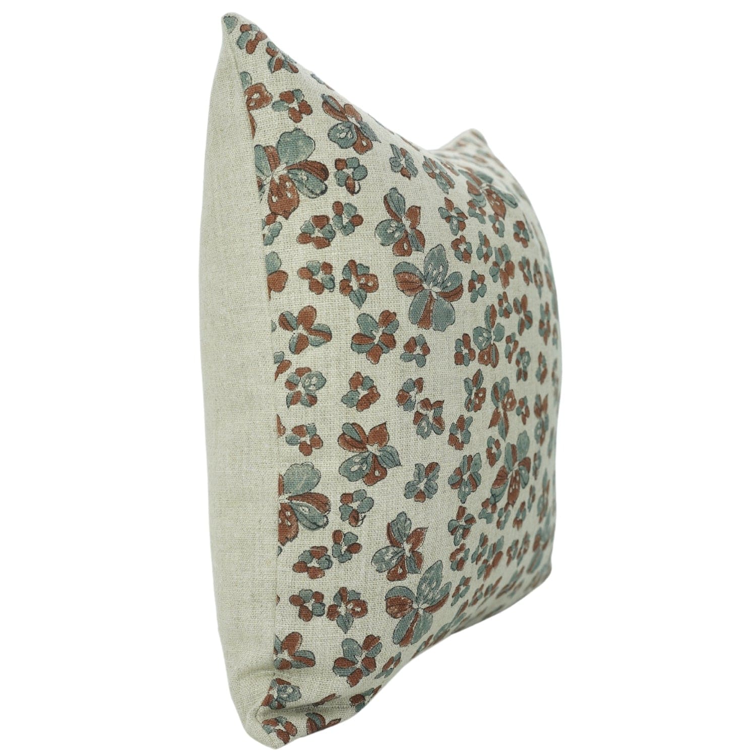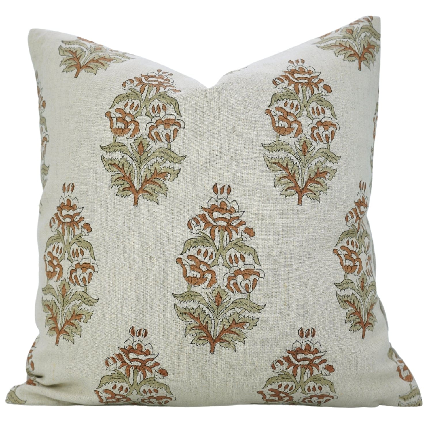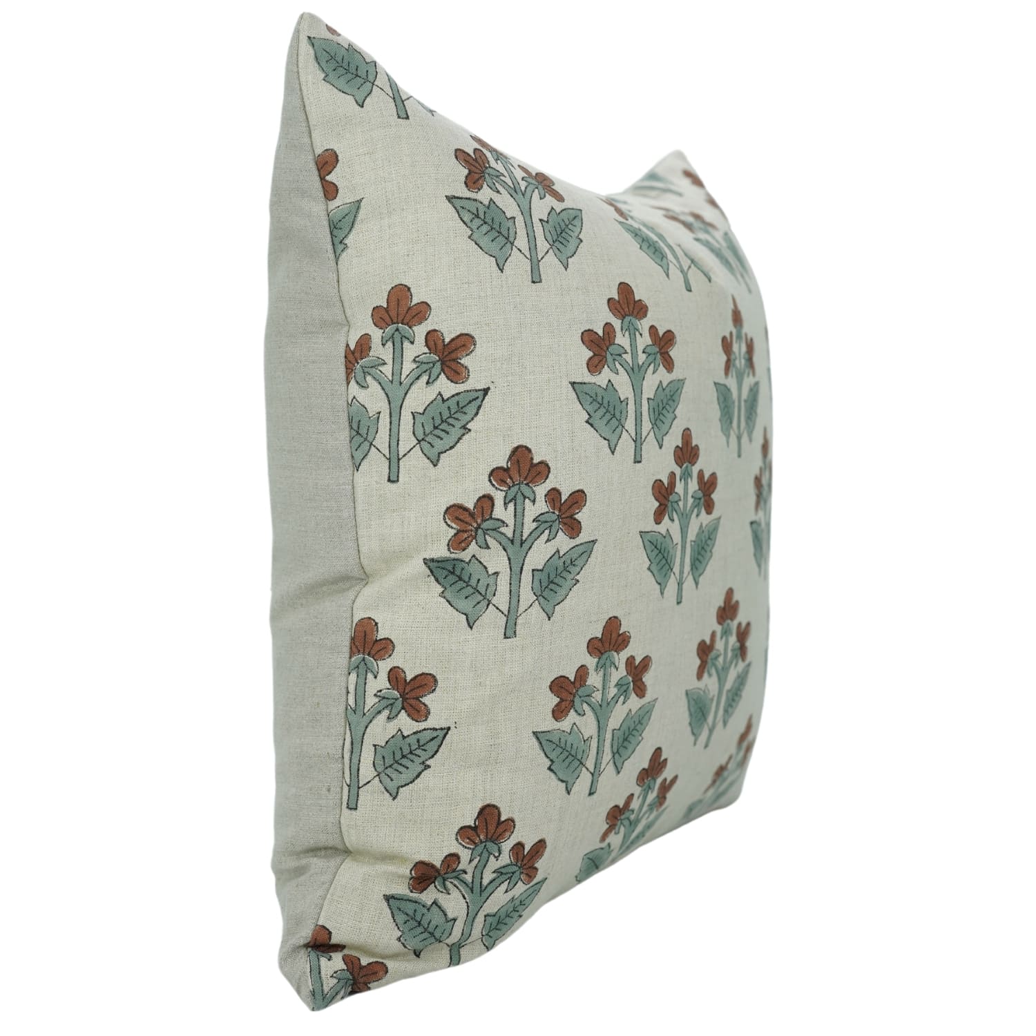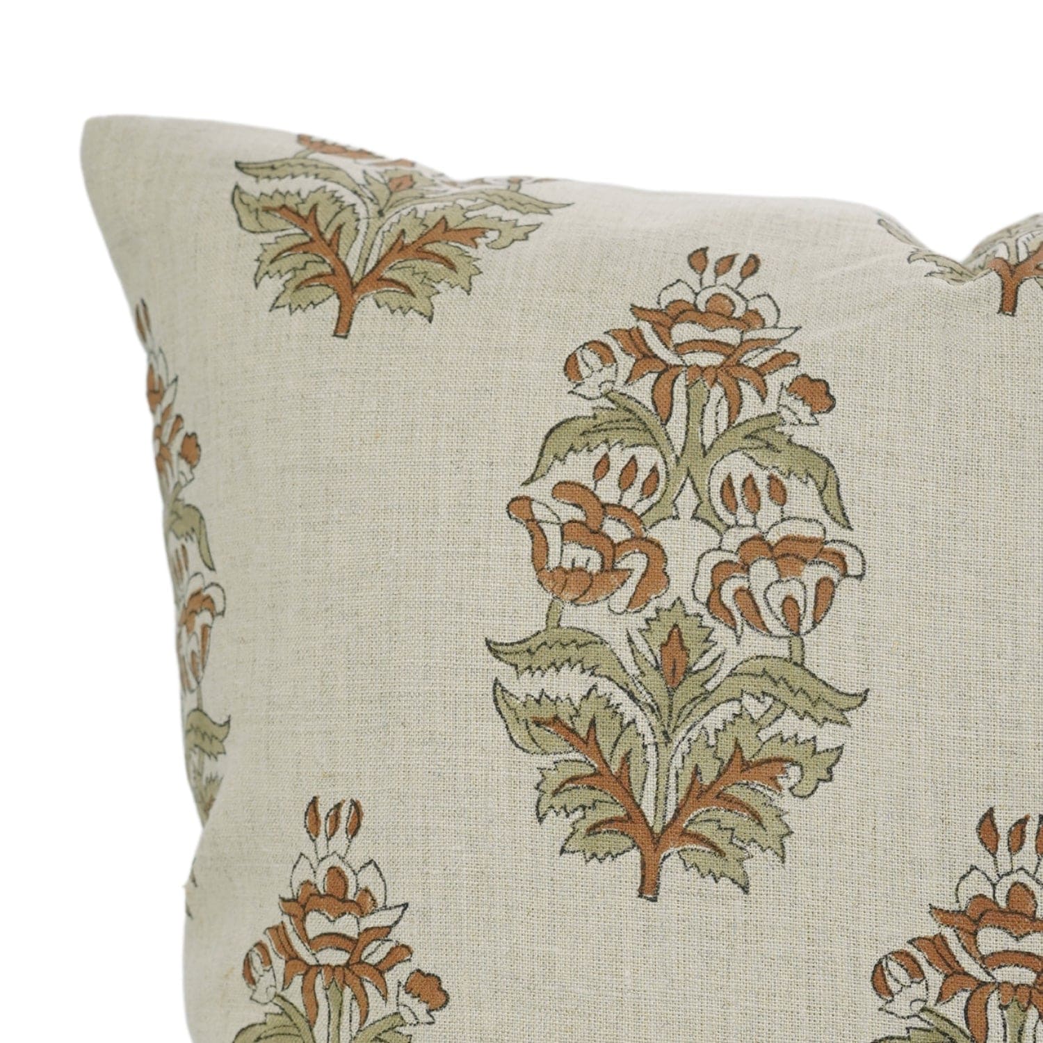 Premium Linen Blend Indoor Pillow Cover - Hand Block Printed Brown and Gray Floral with Invisible Zipper