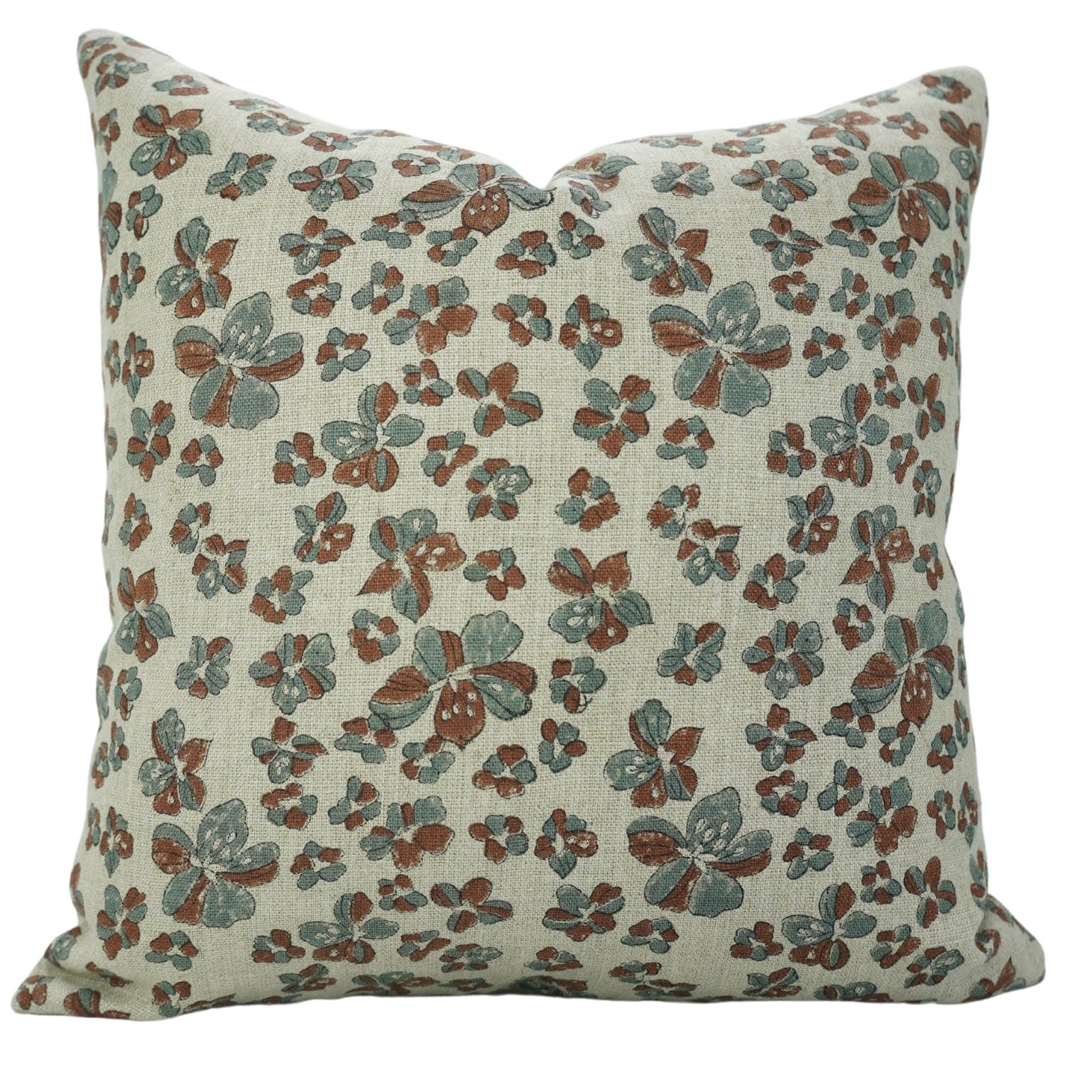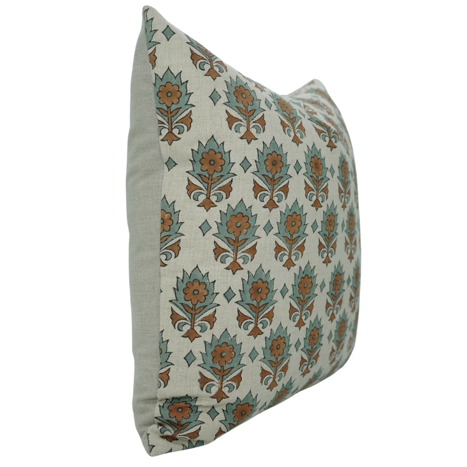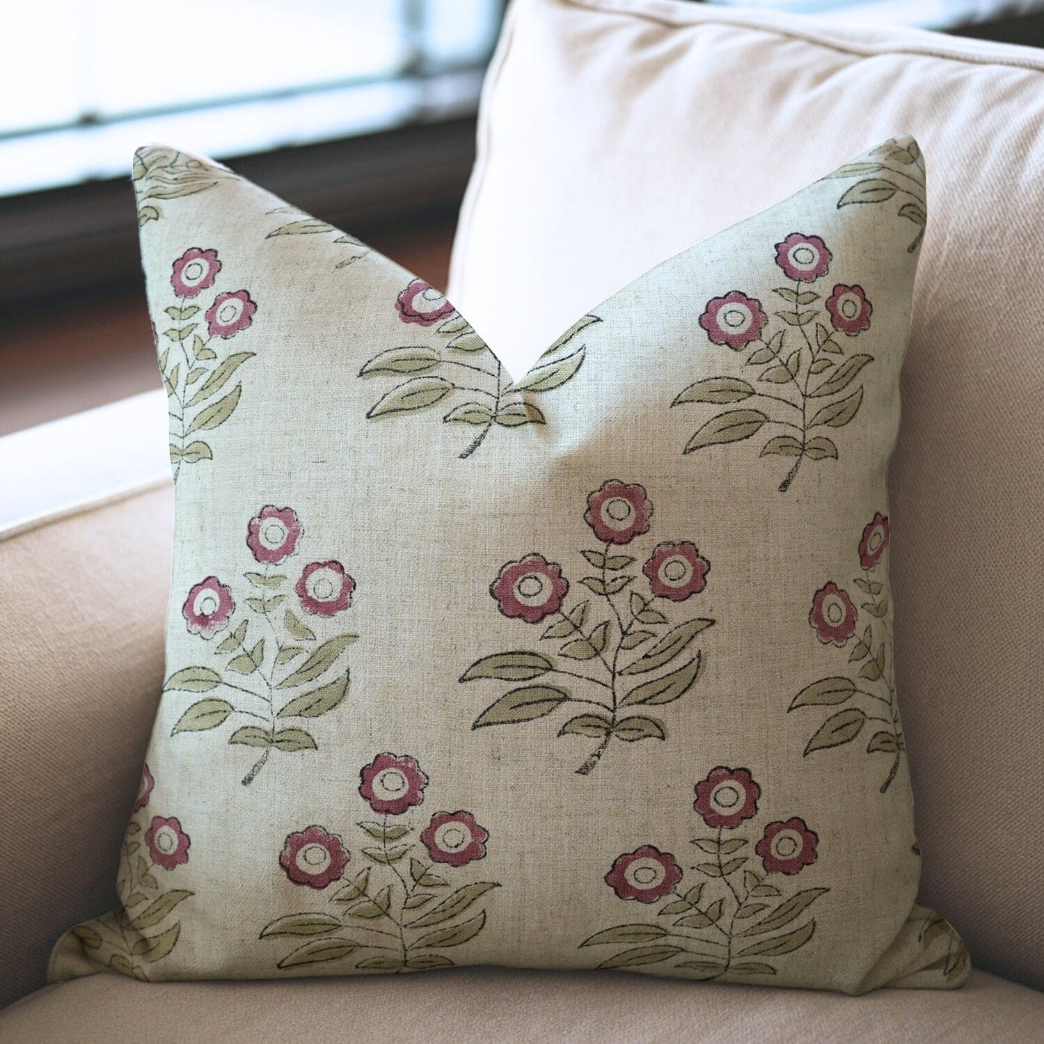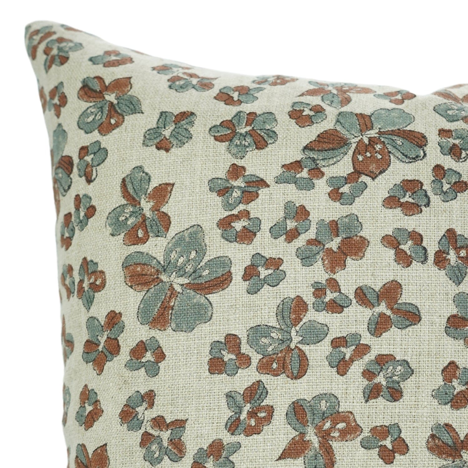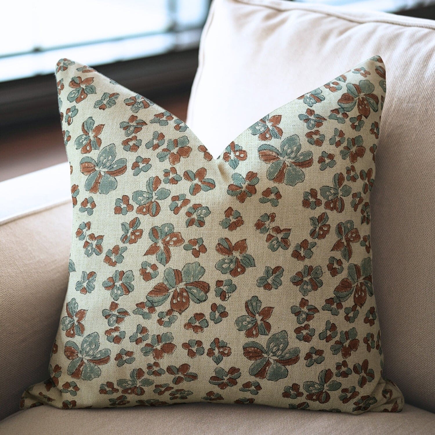 Premium Linen Blend Indoor Pillow Cover - Hand Block Printed Brown and Gray Floral with Invisible Zipper