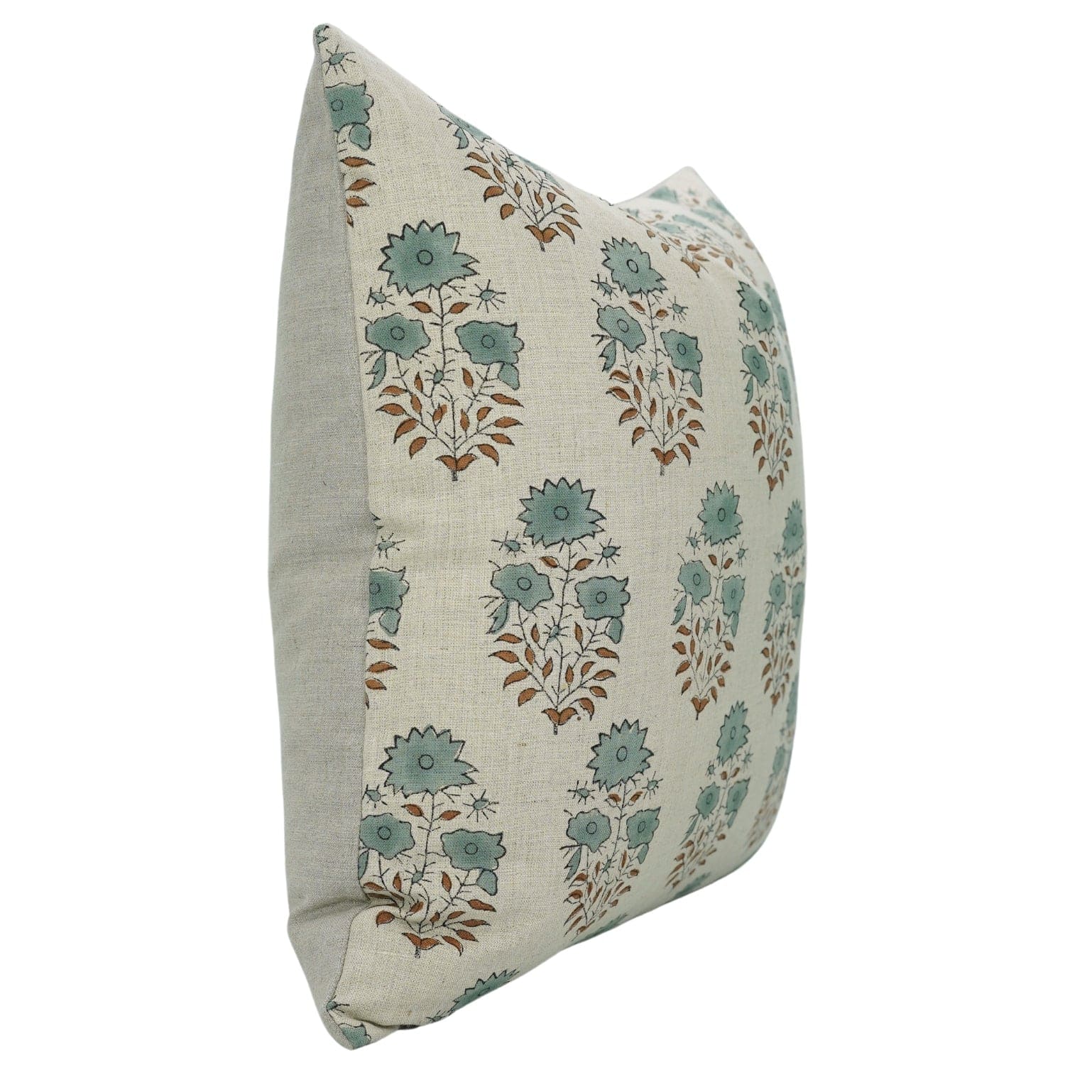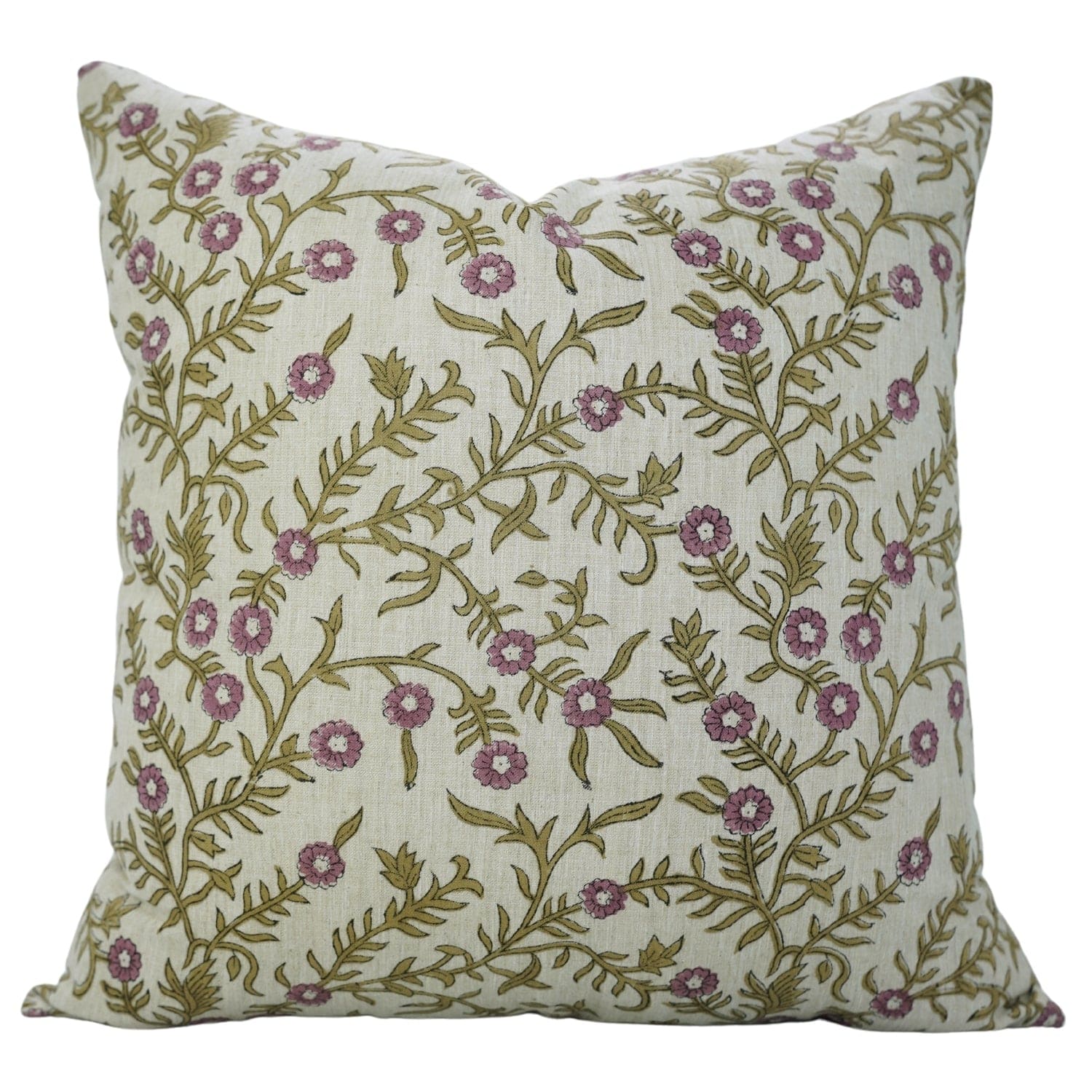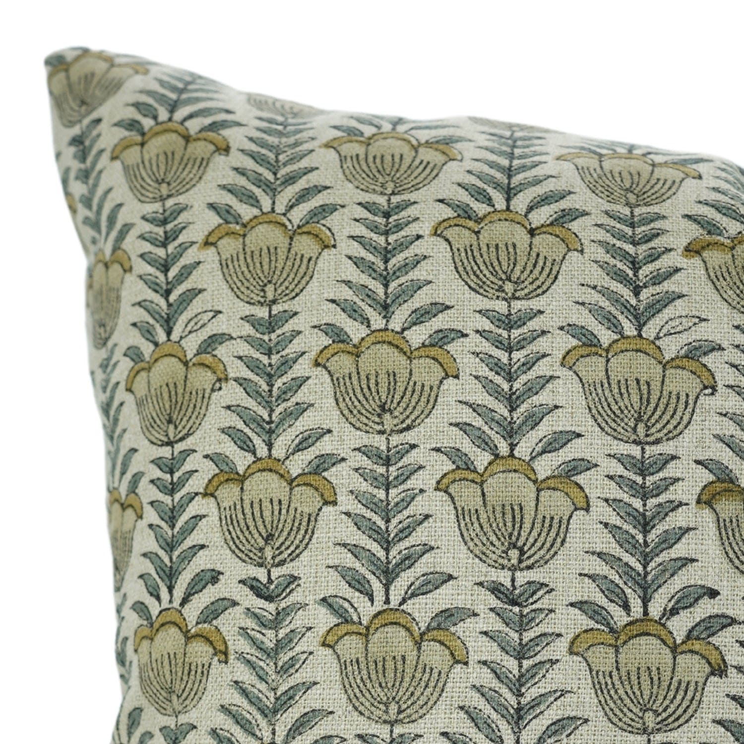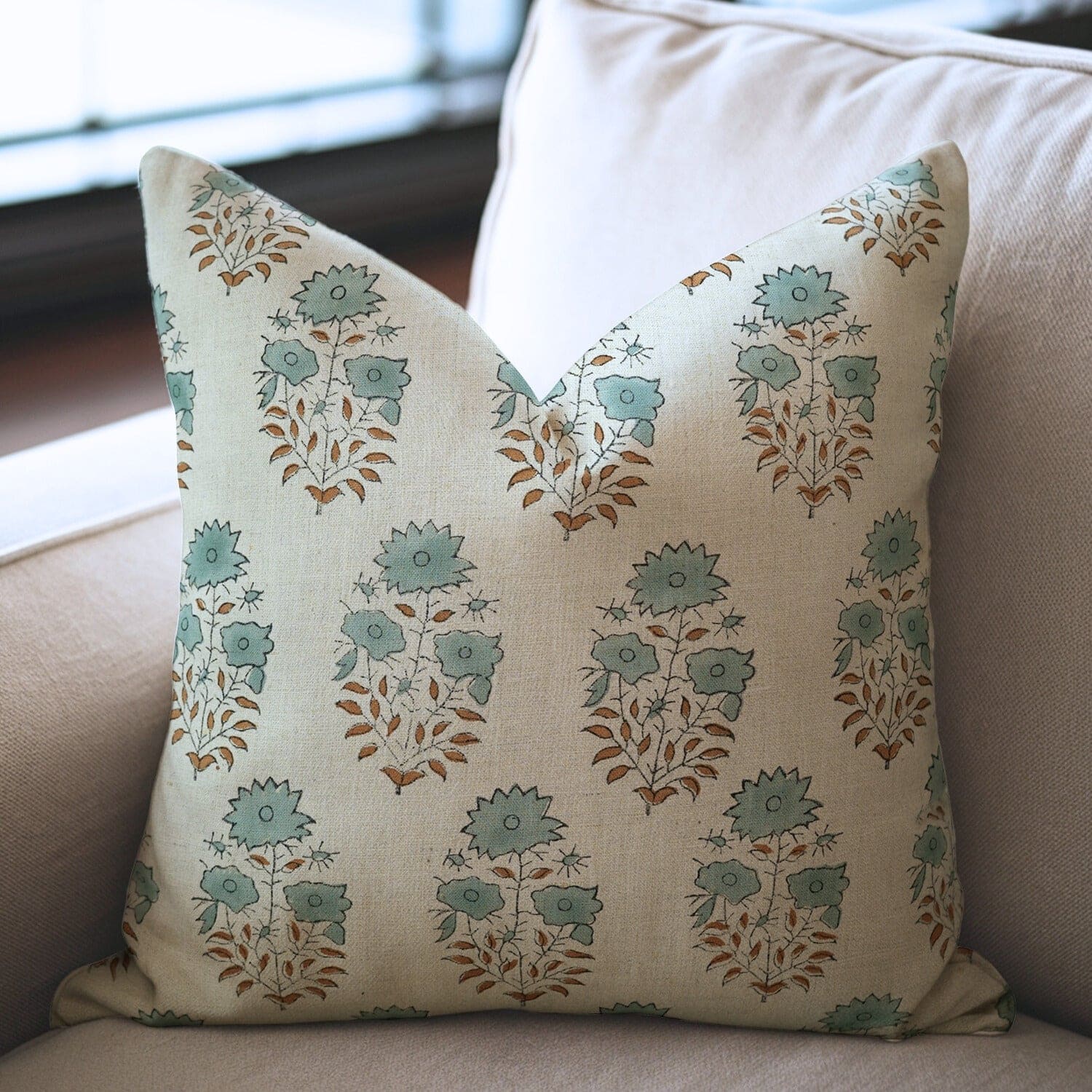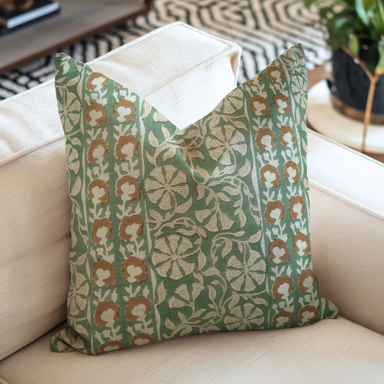 Premium Linen Blend Indoor Pillow Cover - Hand Block Printed Brown and Gray Floral with Invisible Zipper