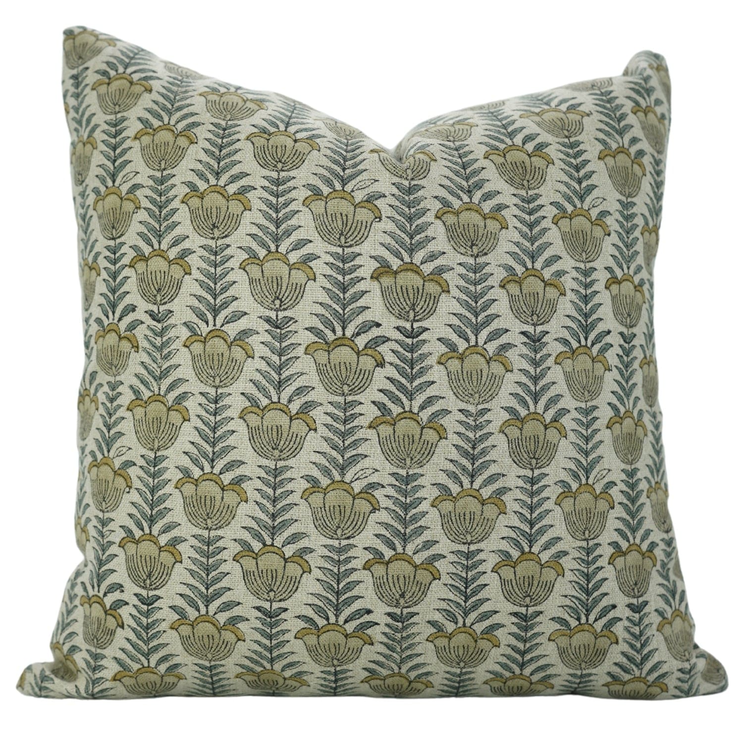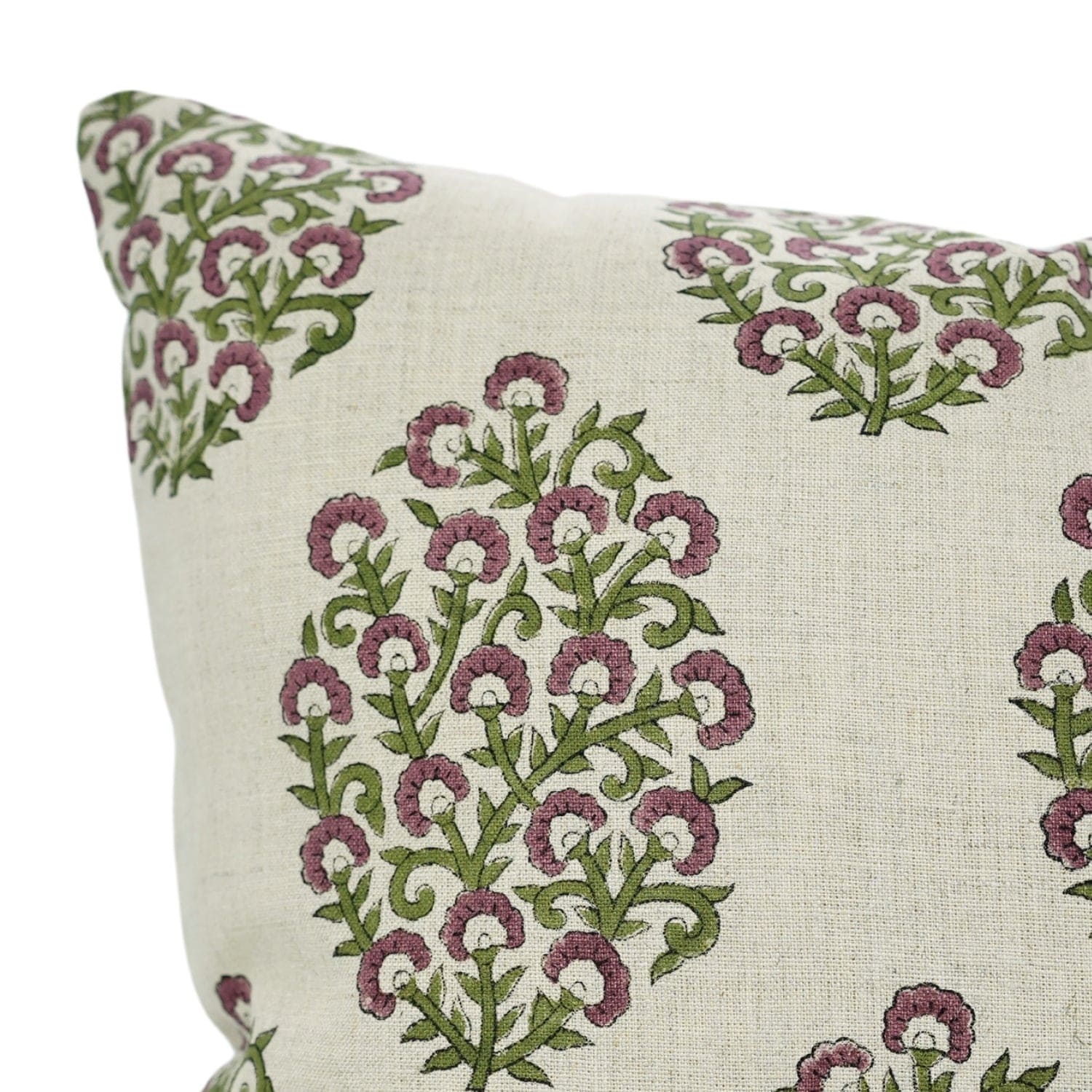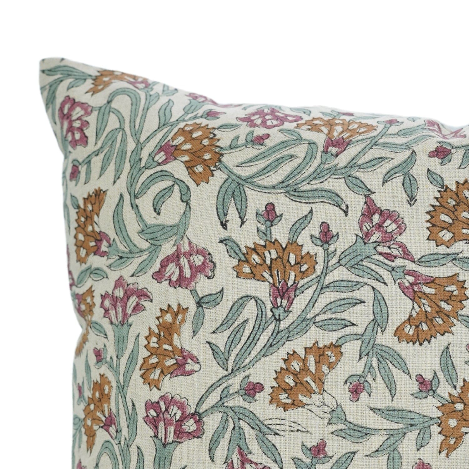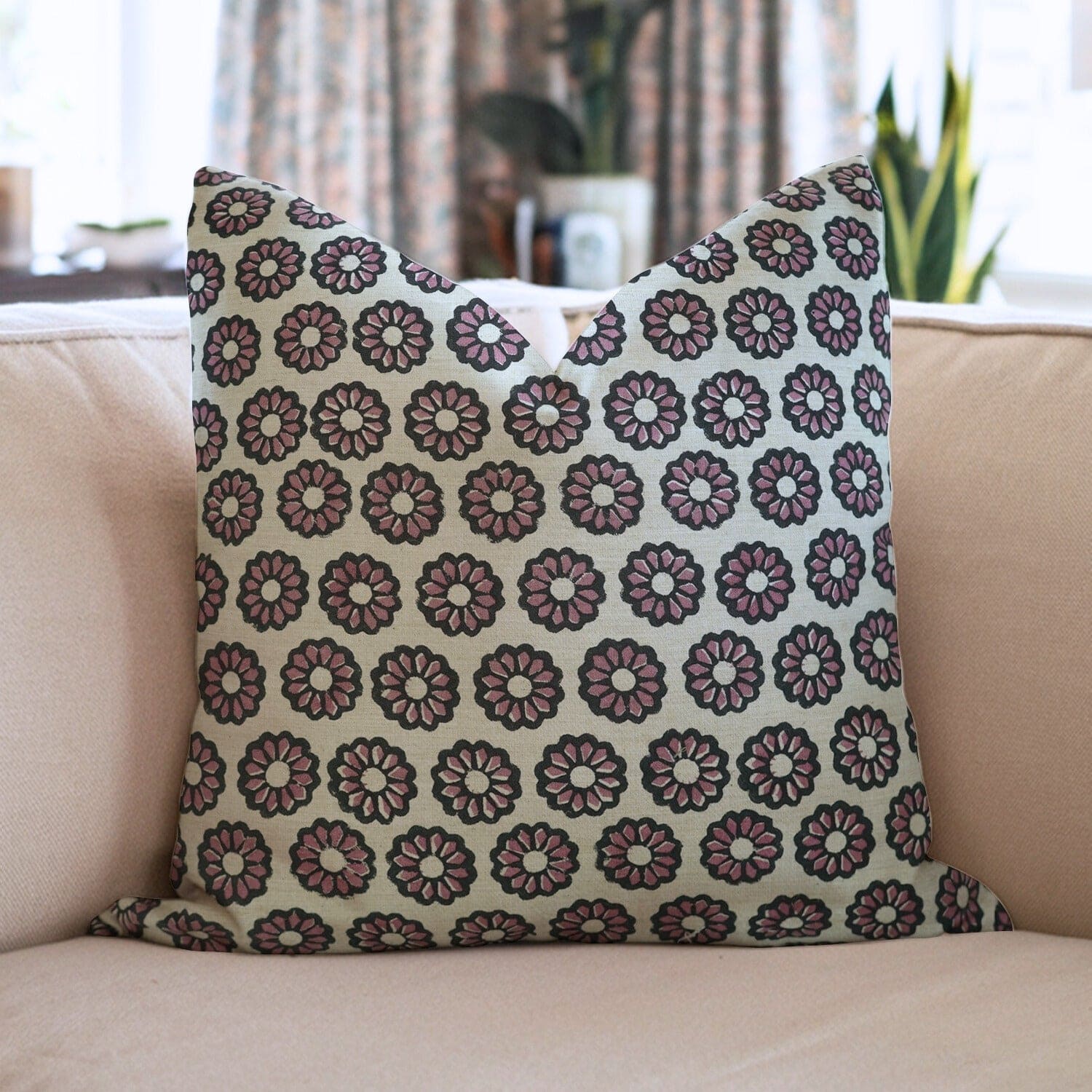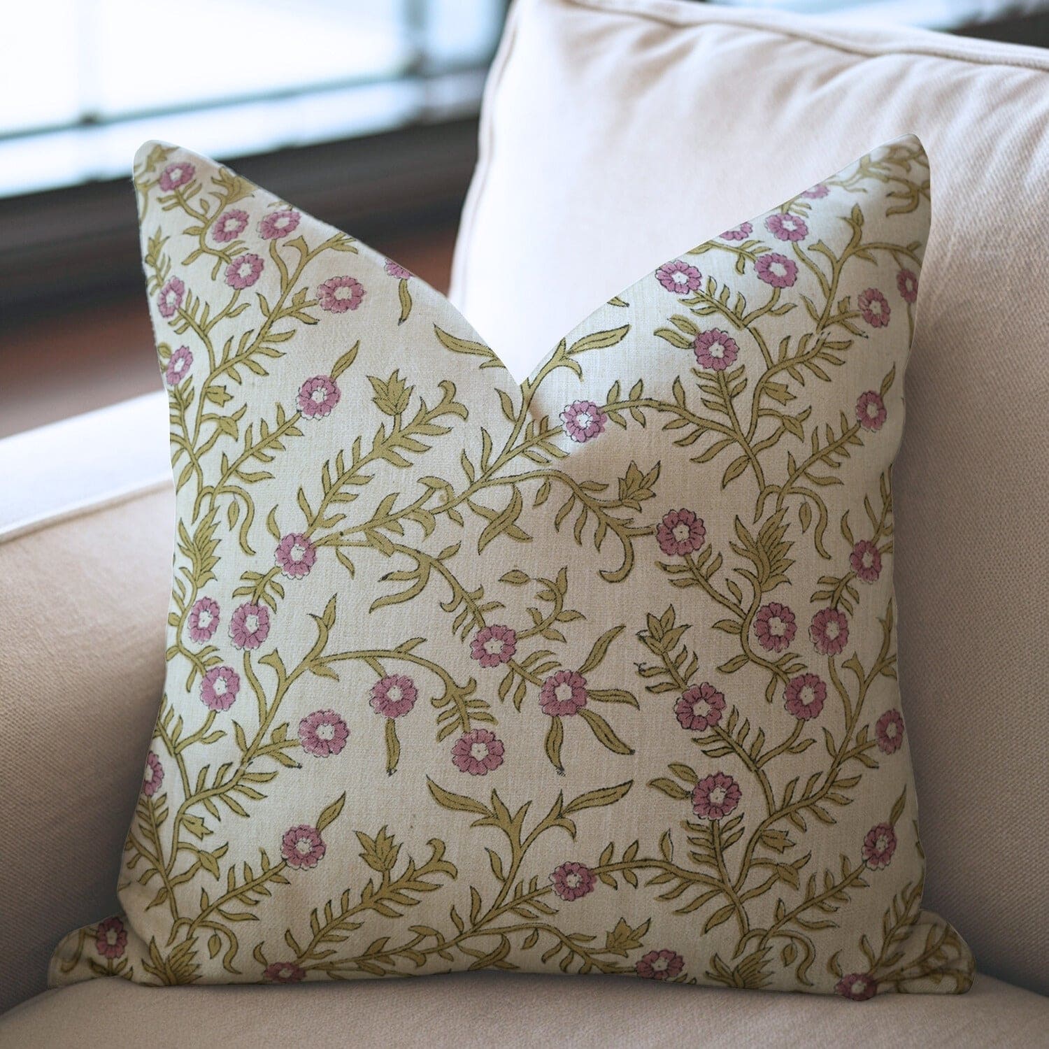 Premium Linen Blend Indoor Pillow Cover - Hand Block Printed Brown and Gray Floral with Invisible Zipper