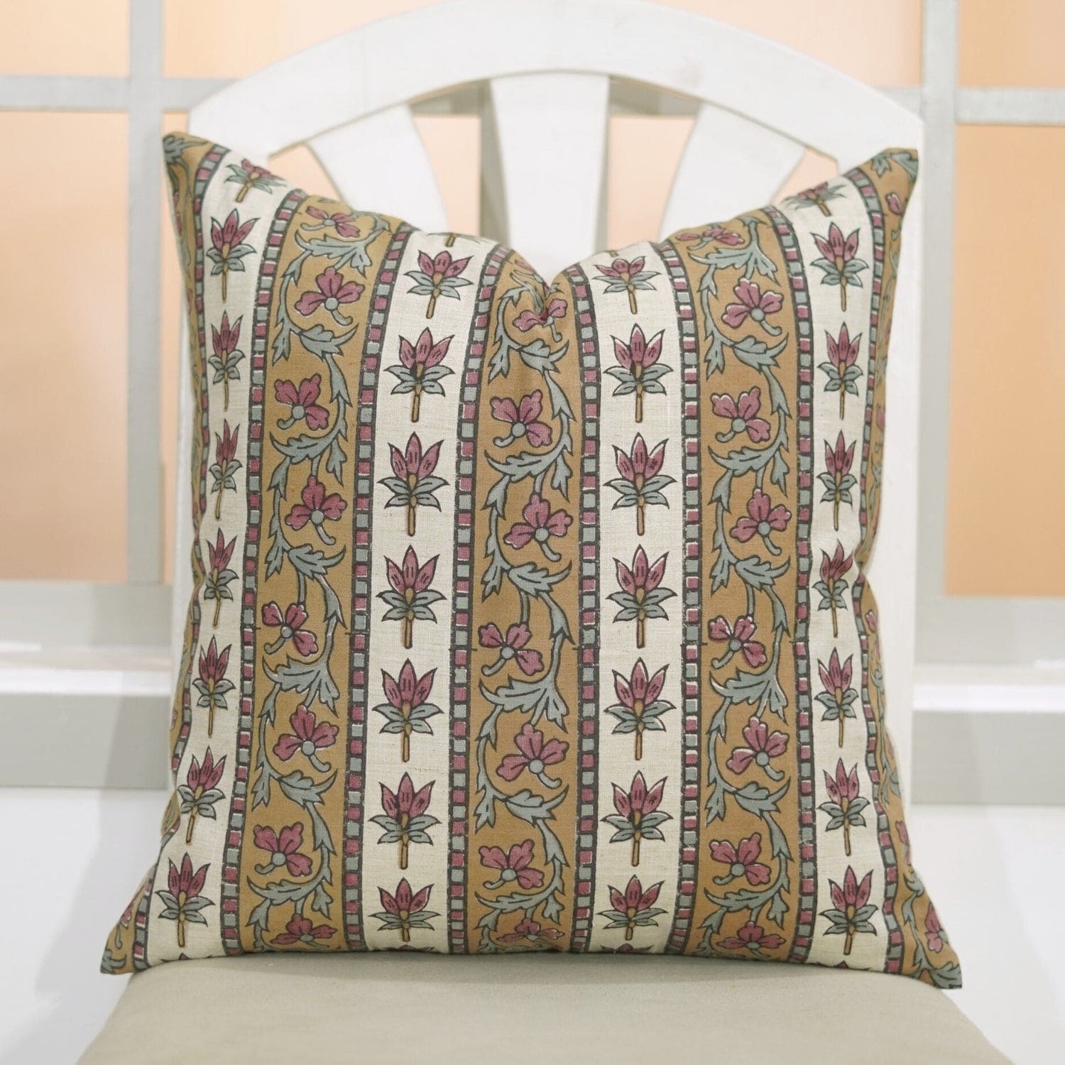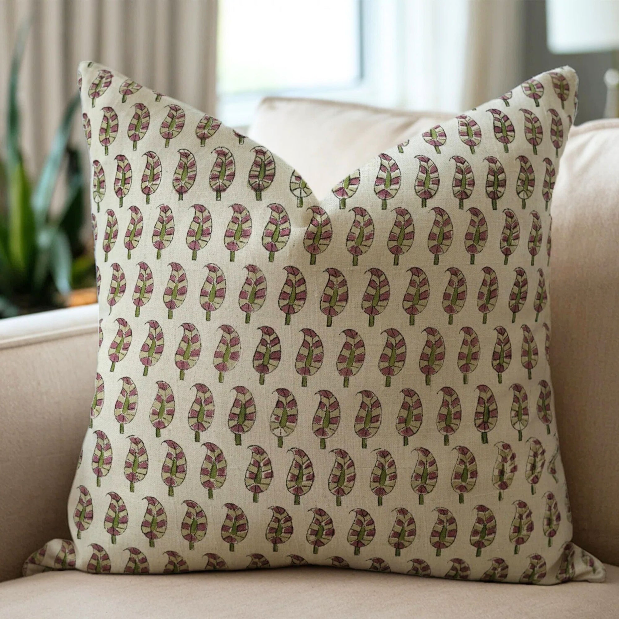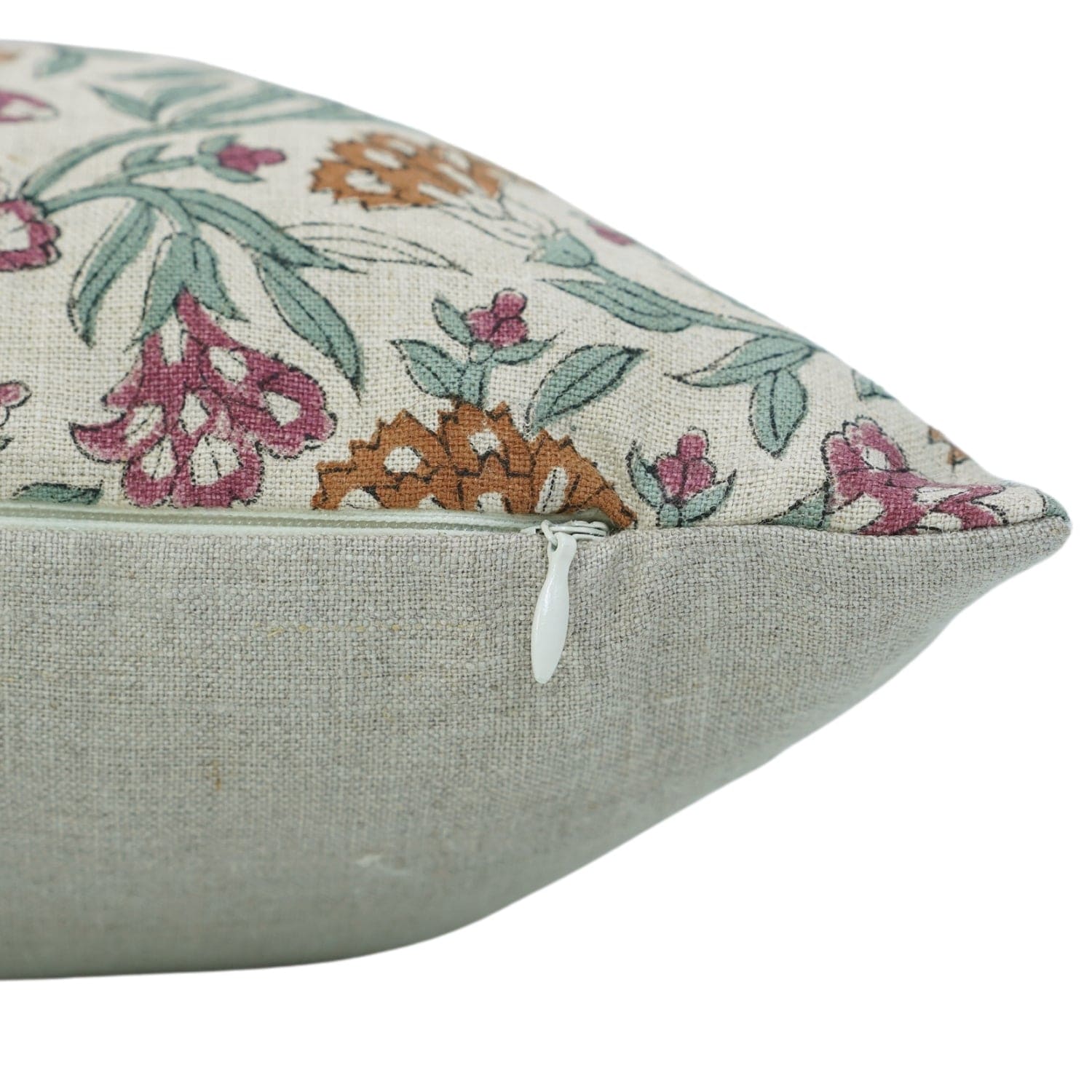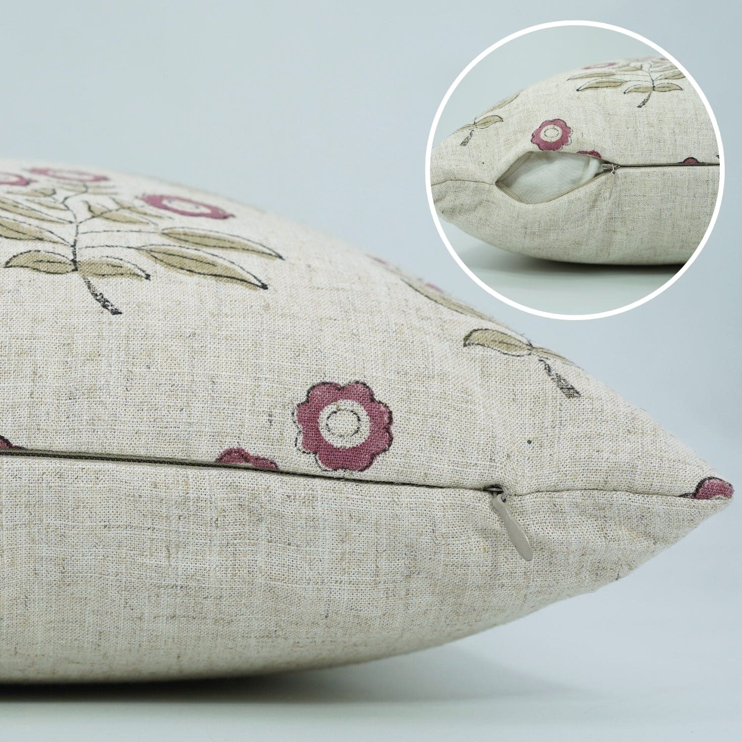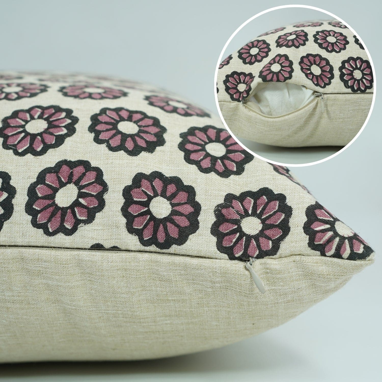 Handblock Printed Throw Cushion Case – Pink, Brown & Gray Linen Blend