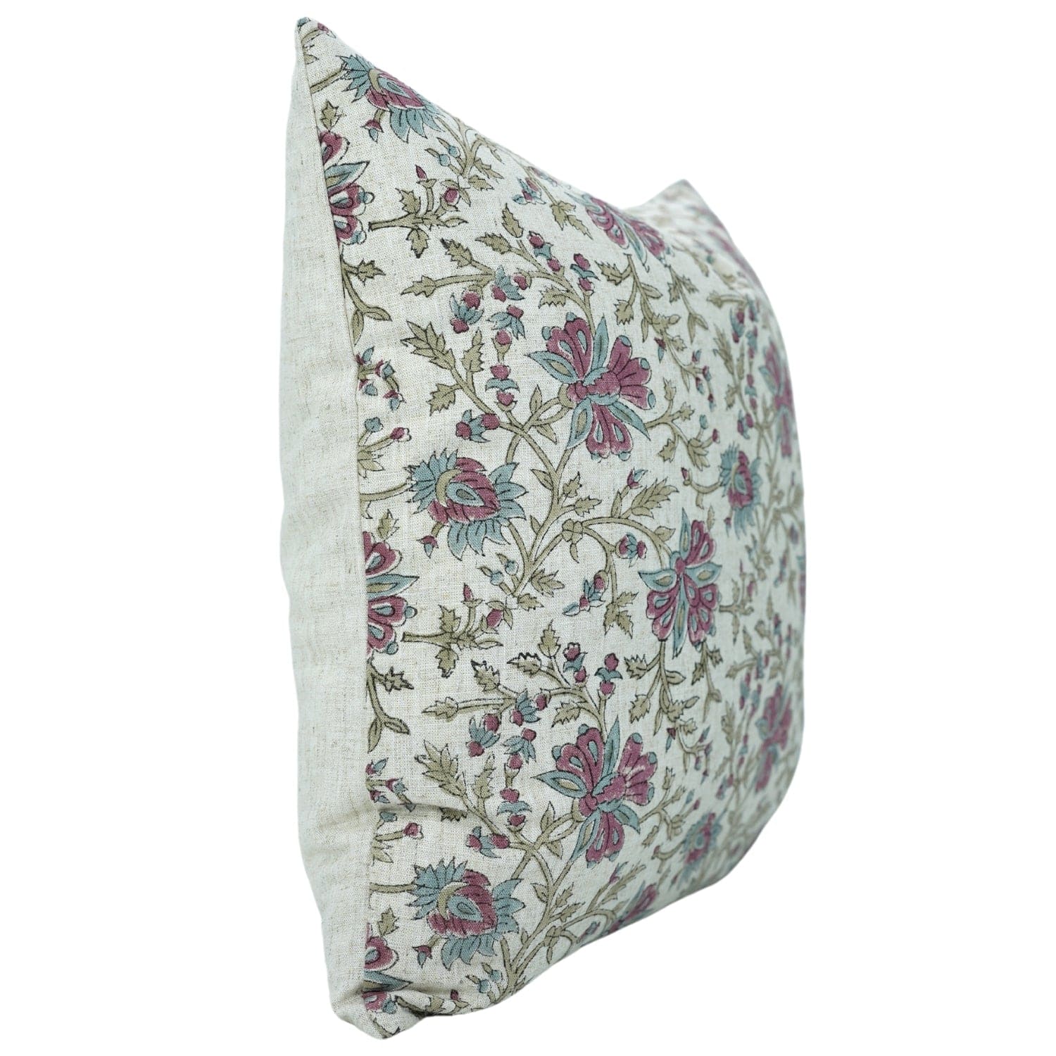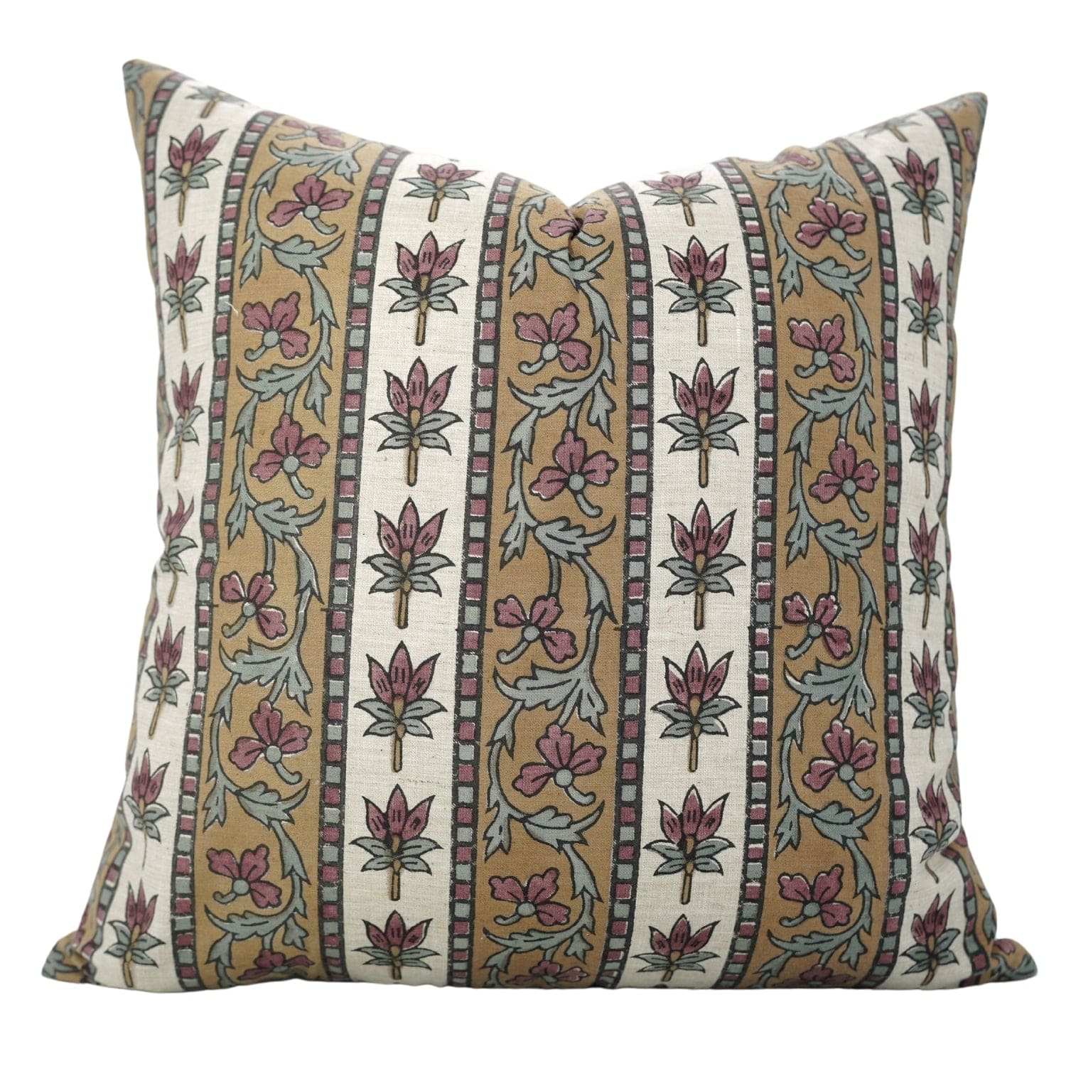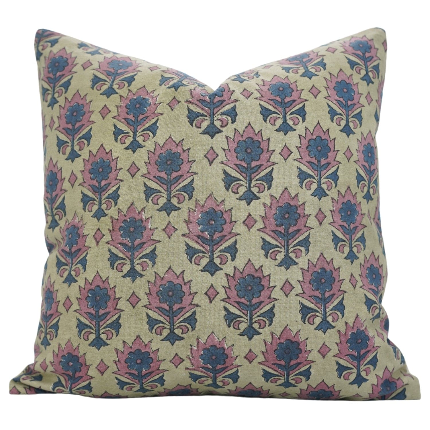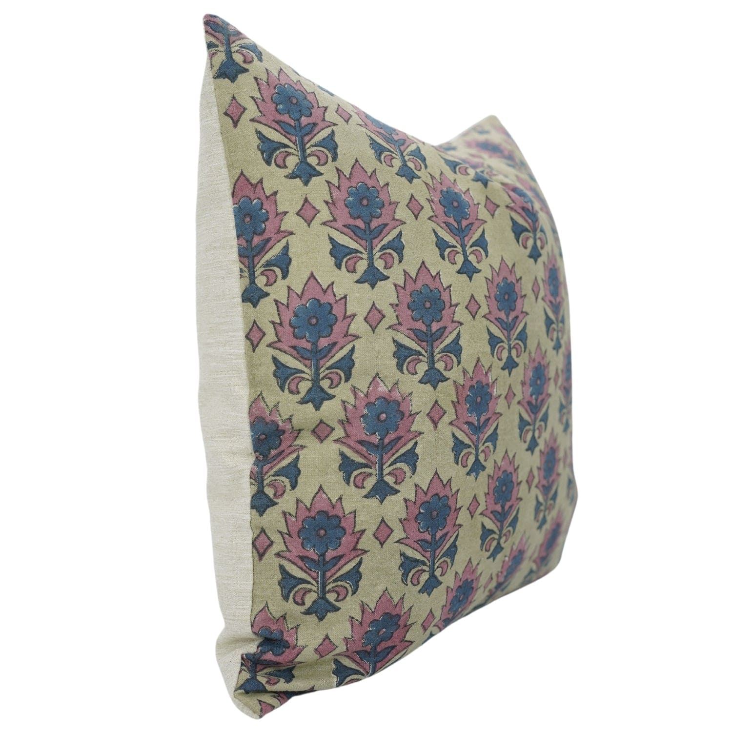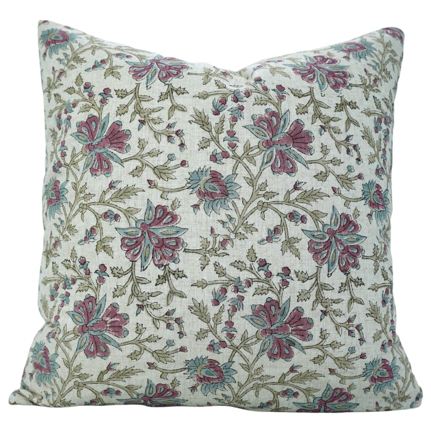 Handblock Printed Throw Cushion Case – Pink, Brown & Gray Linen Blend