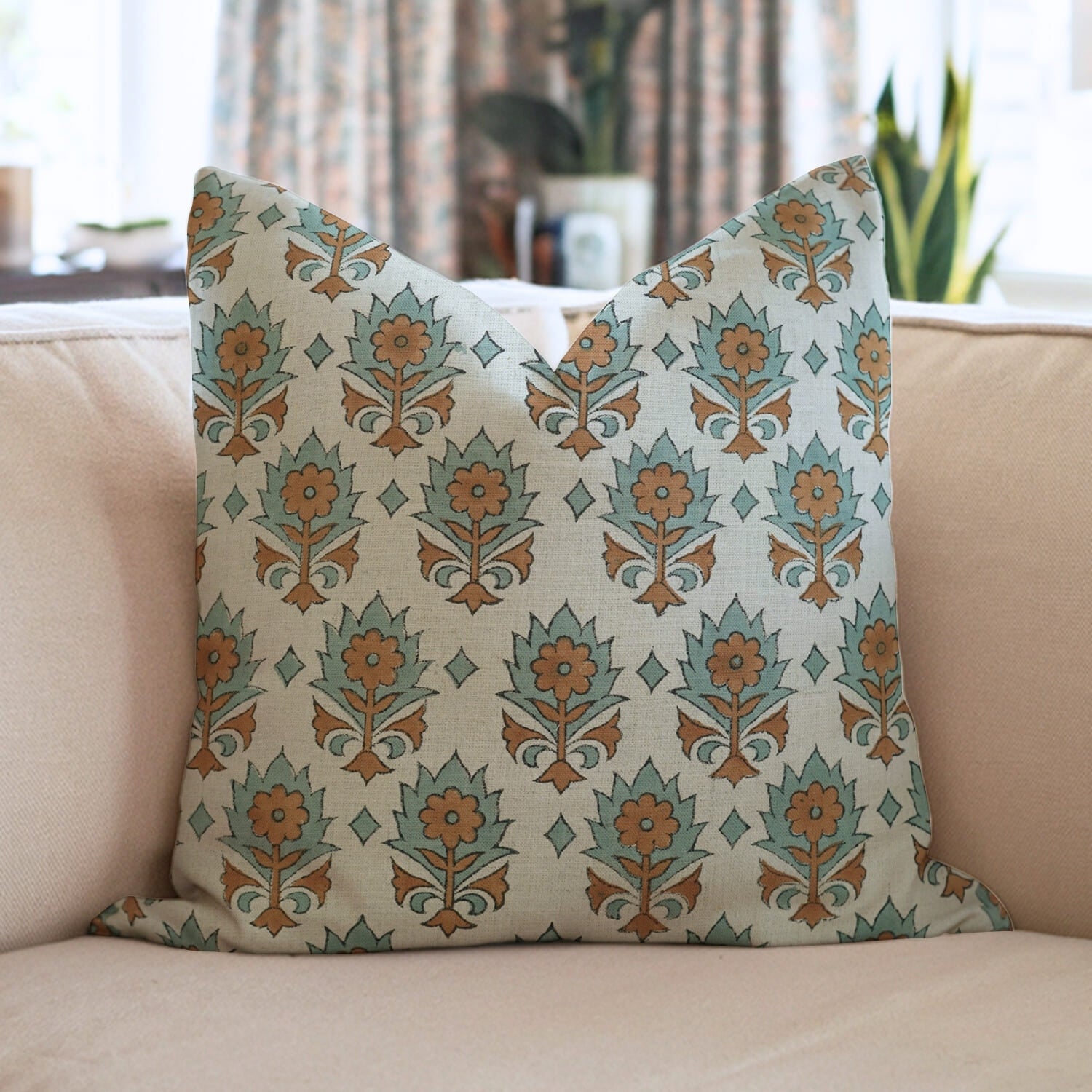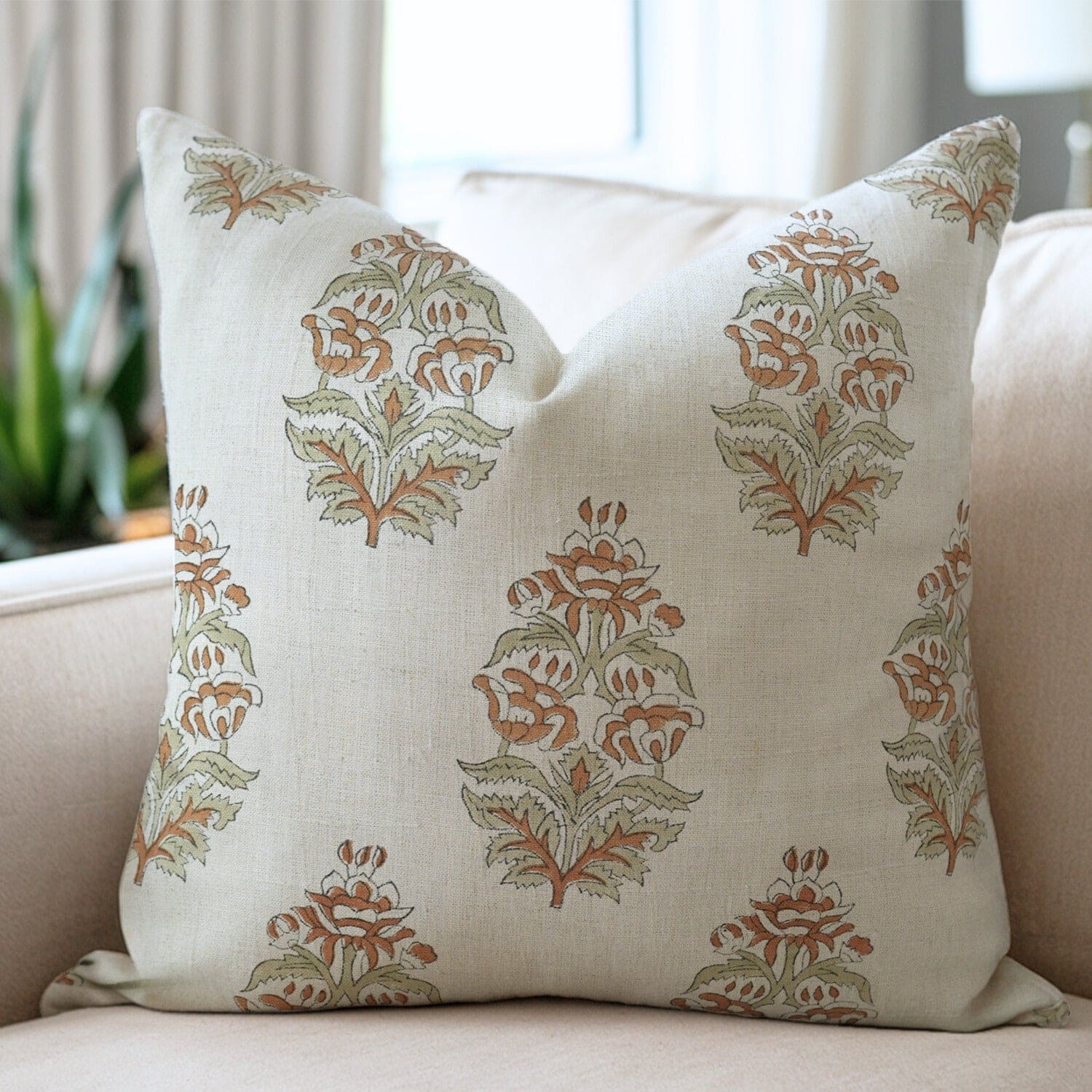 Farmhouse Floral Print Outdoor Pillow Cover in Barfi Orange - Linen Blend