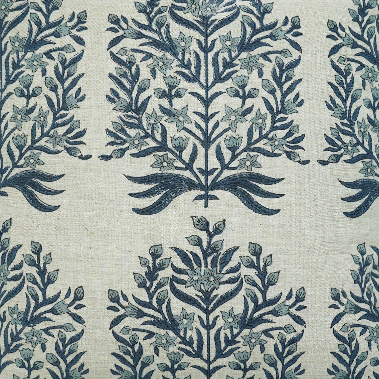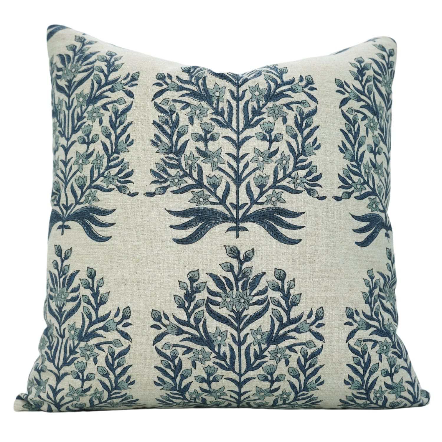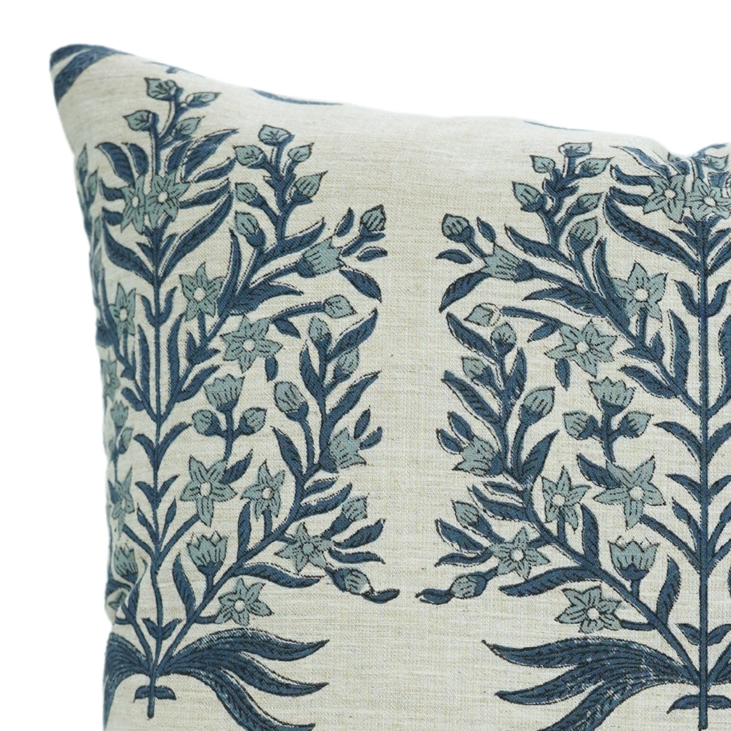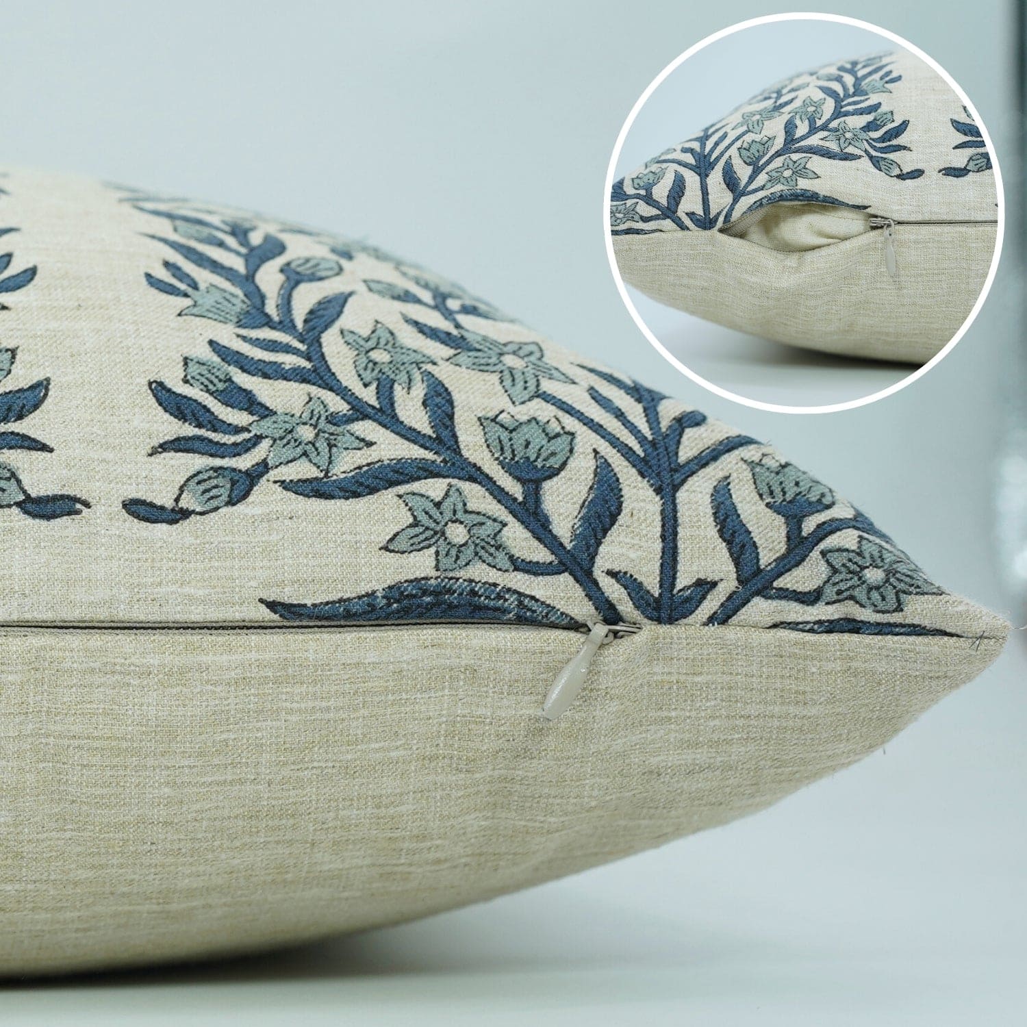 Blue Floral Hand Block Printed Square Pillow Cover – Linen Blend