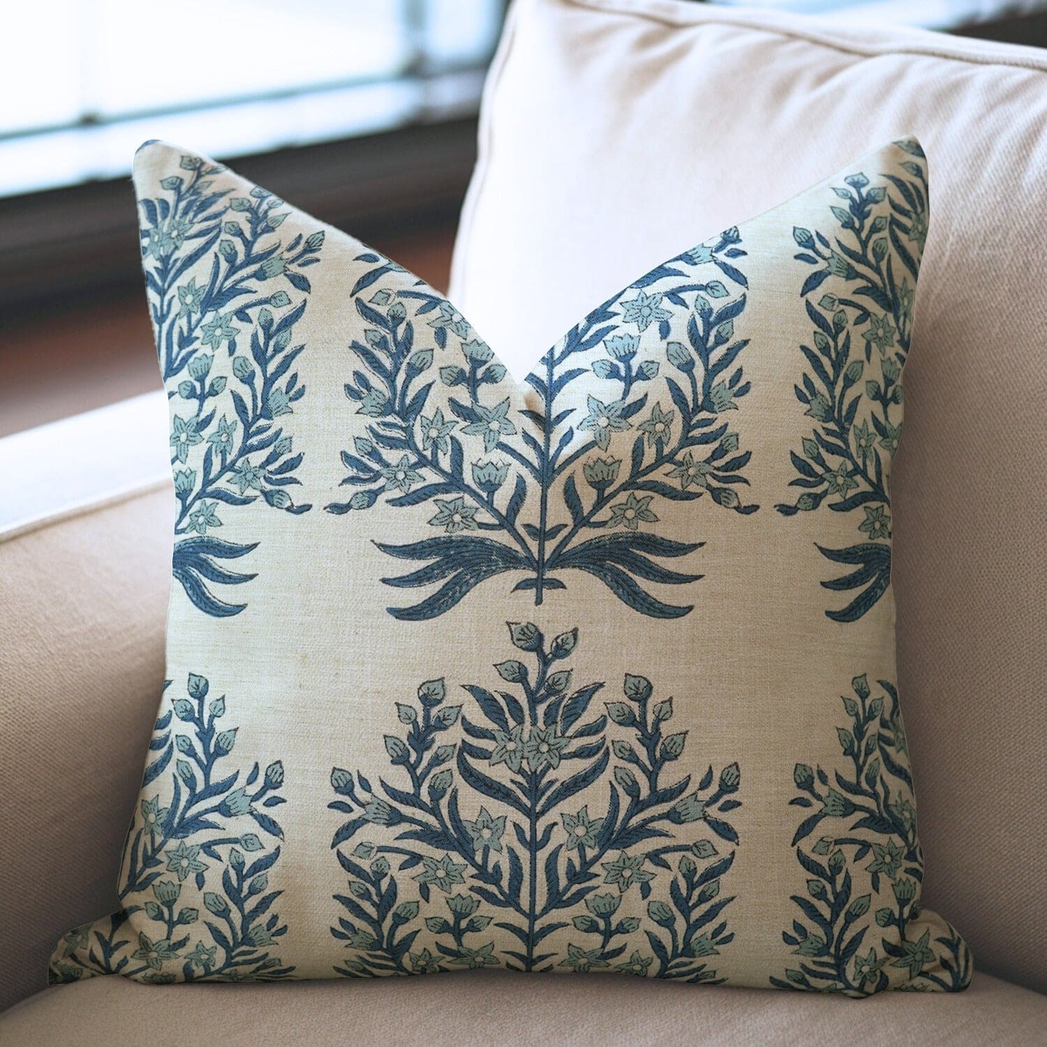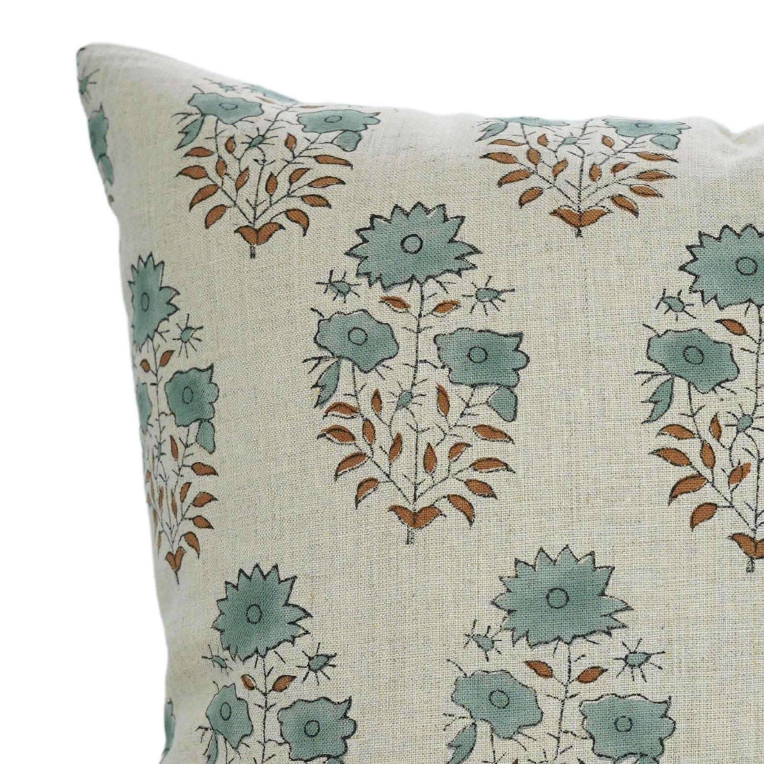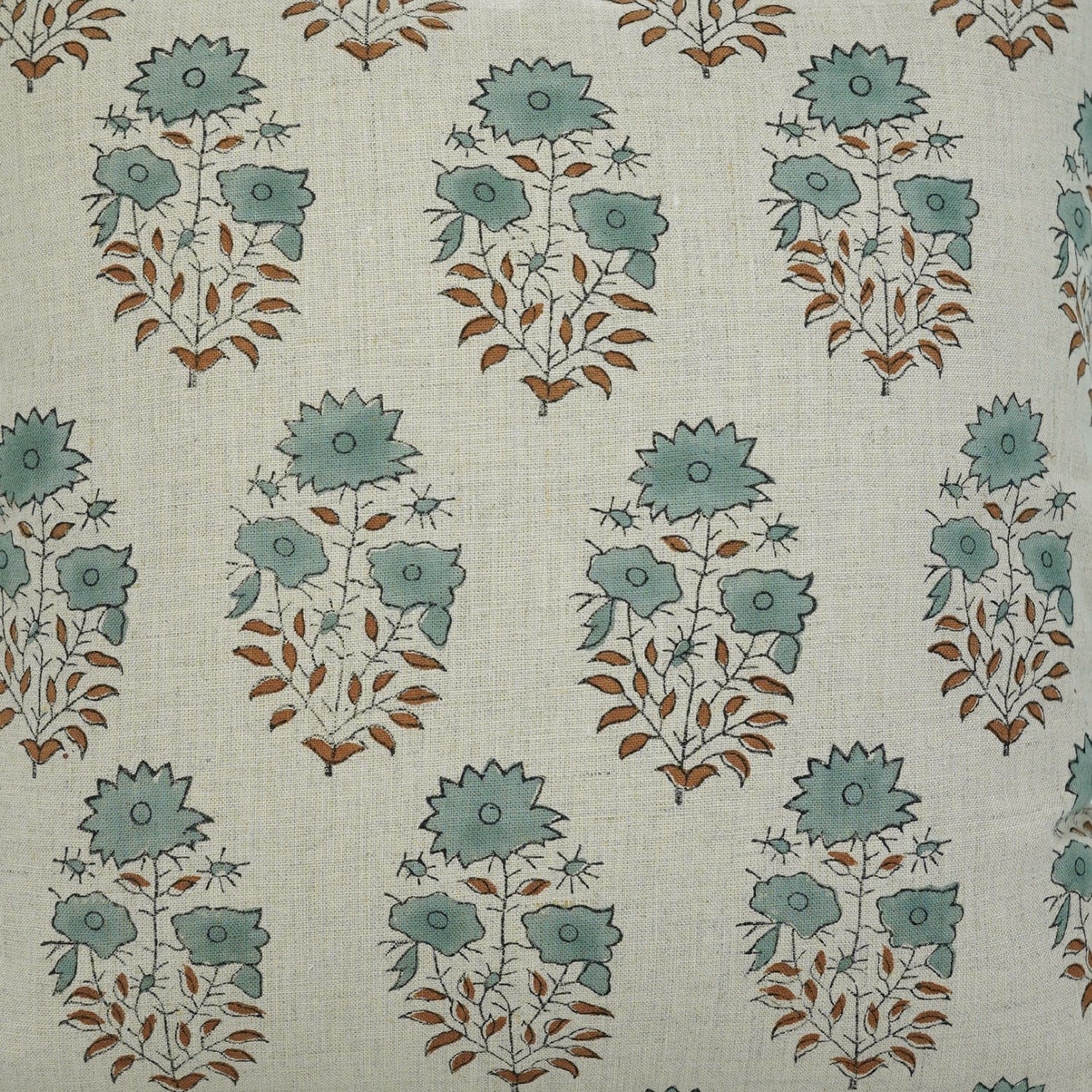 Blue Floral Hand Block Printed Square Pillow Cover – Linen Blend