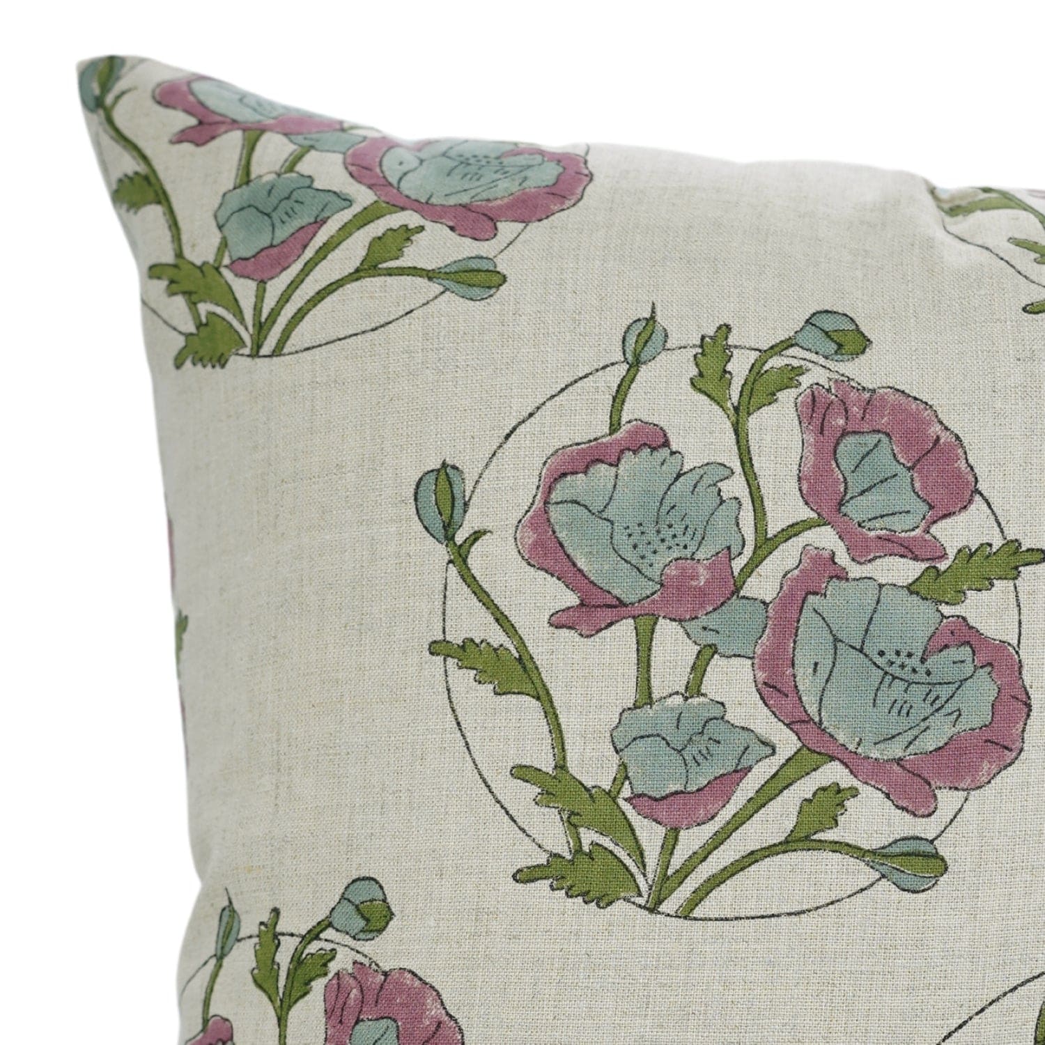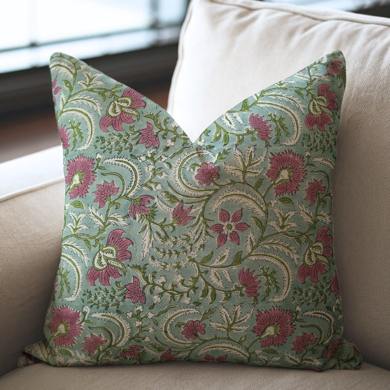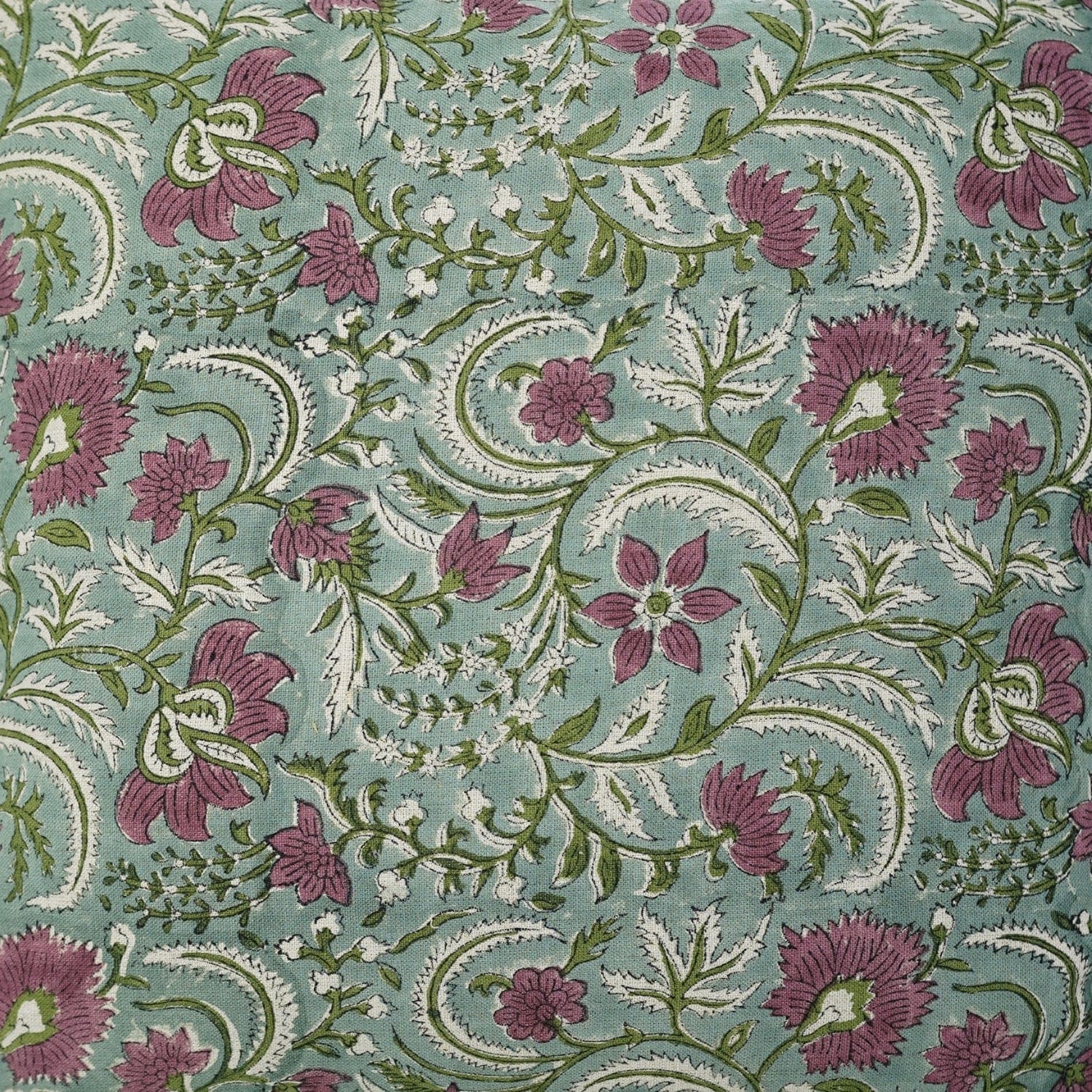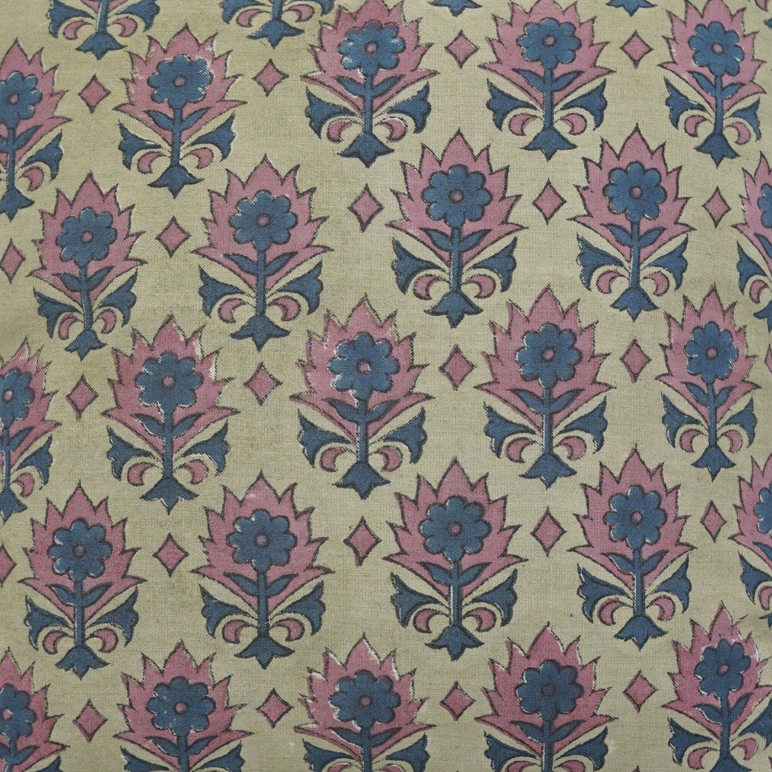 Blue Floral Hand Block Printed Square Pillow Cover – Linen Blend