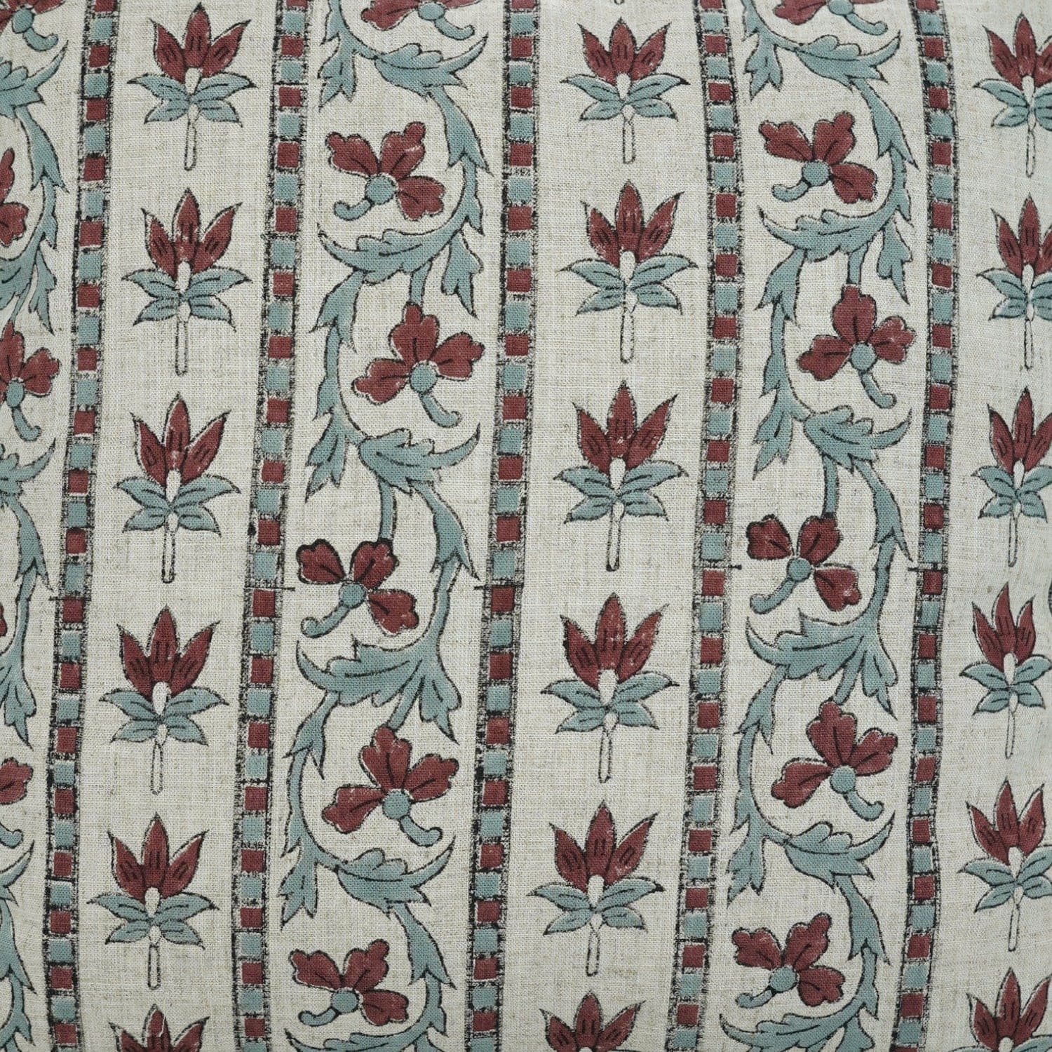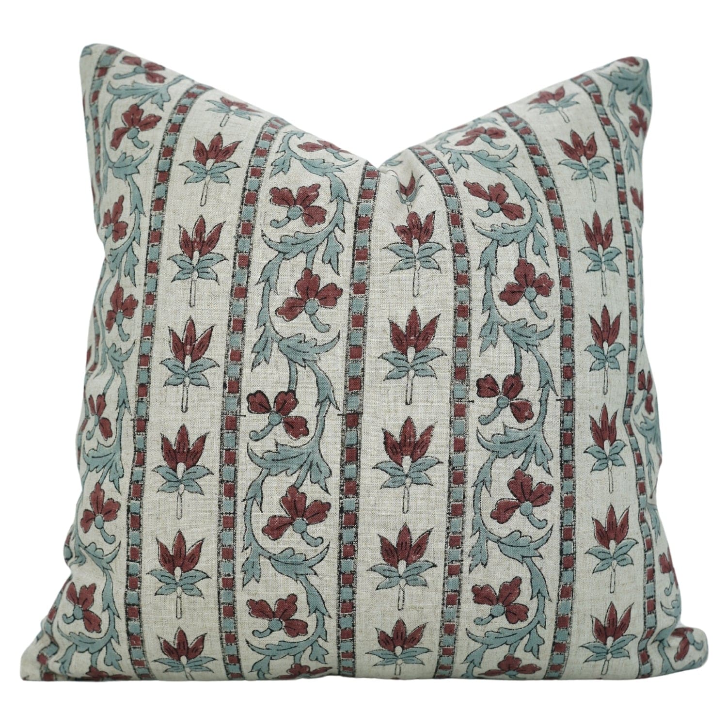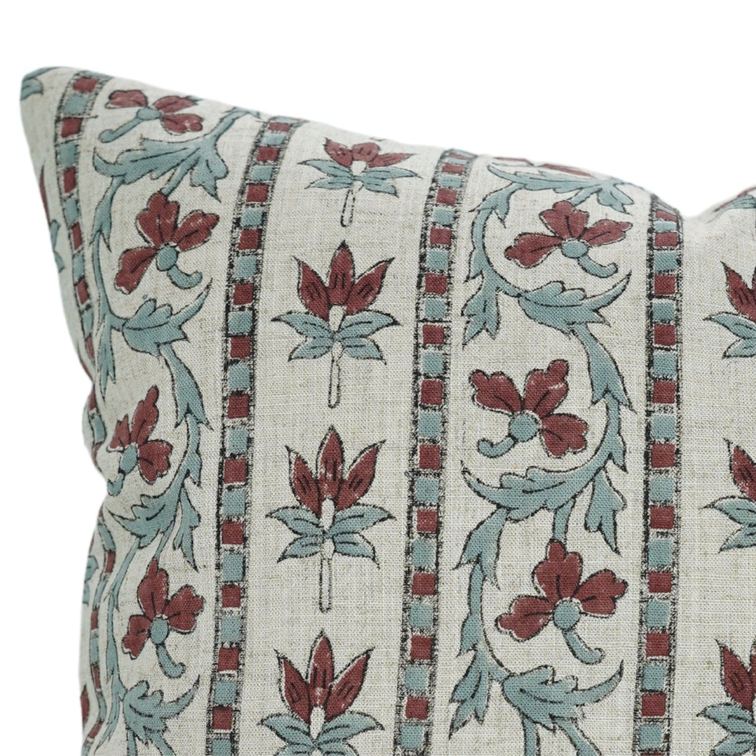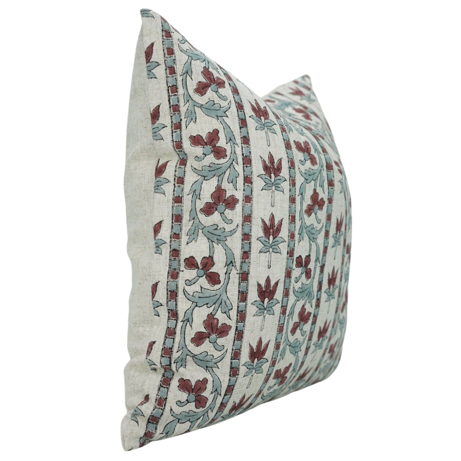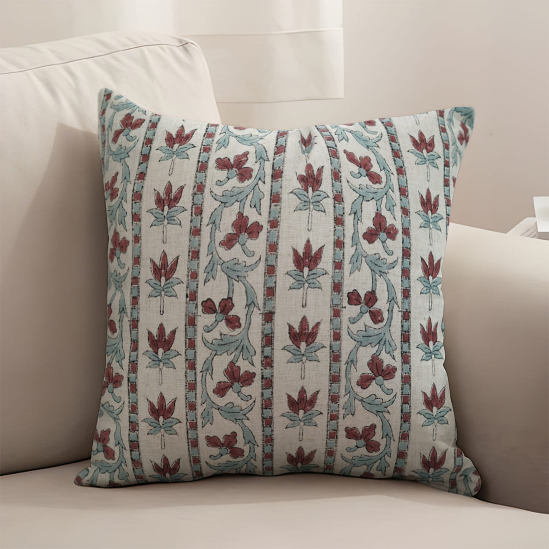 Hand Block Floral Printed Sofa Pillow Cover in Red and Gray - Linen Blend